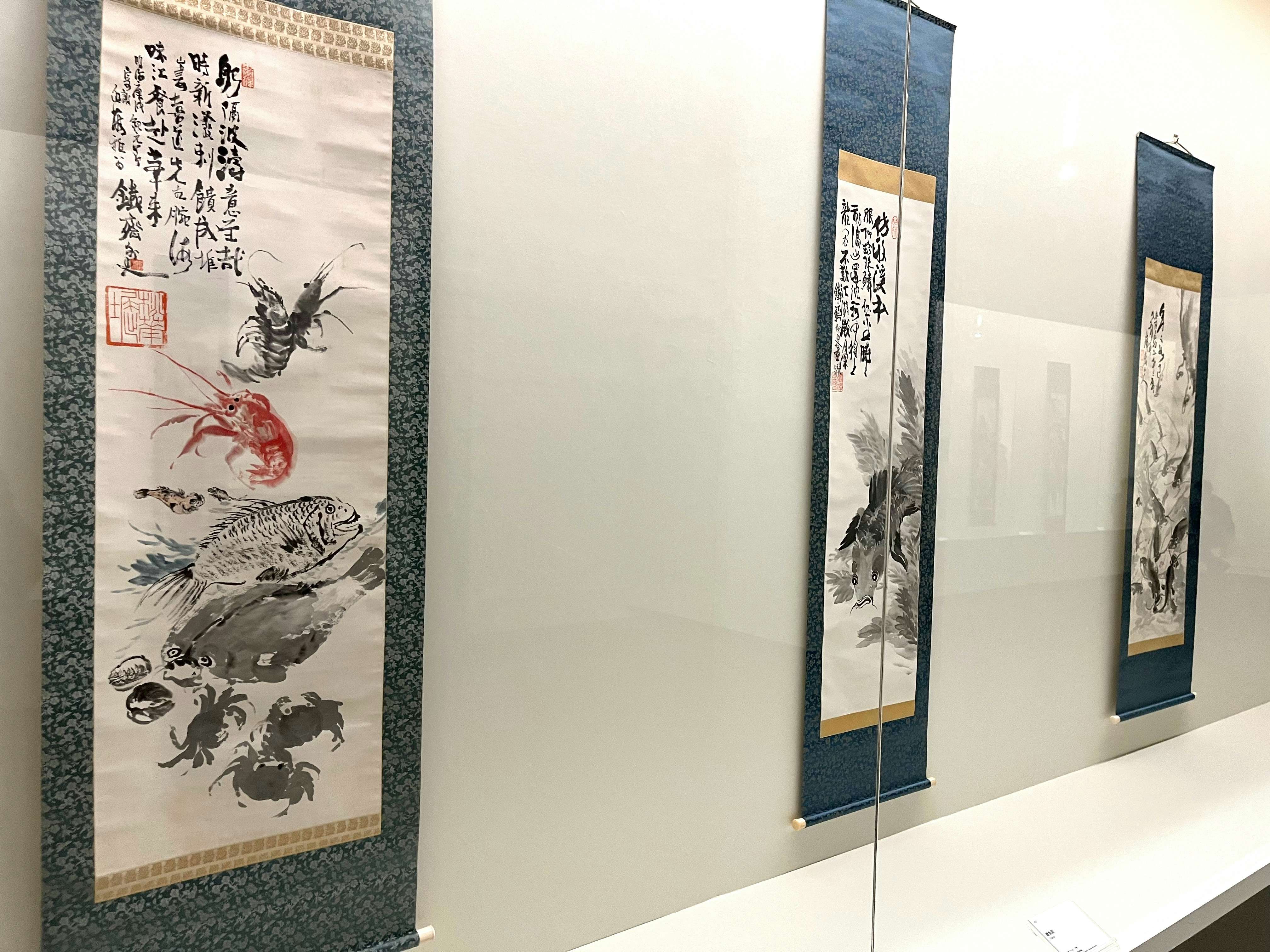 展示風景より、左が富岡鉄斎《鮮魚図》(1910)