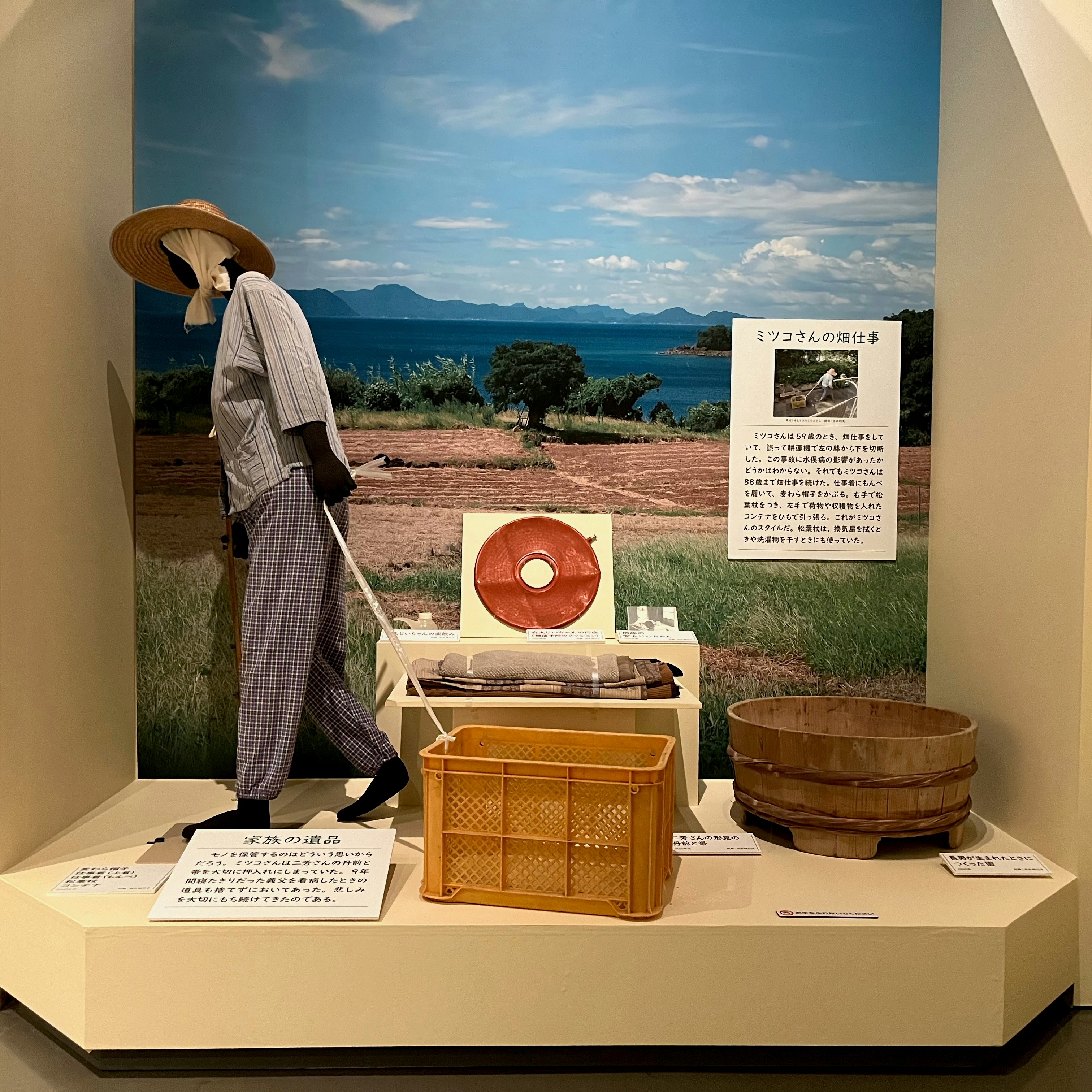 「明神が鼻」の展示は、水俣病の被害がもっとも激しかった土地のひとつである明神が鼻の記憶を、2020年に94歳で世を去った大矢ミツコ氏の人生と、その娘である吉永理巳子氏の語りによってたどるものだ。