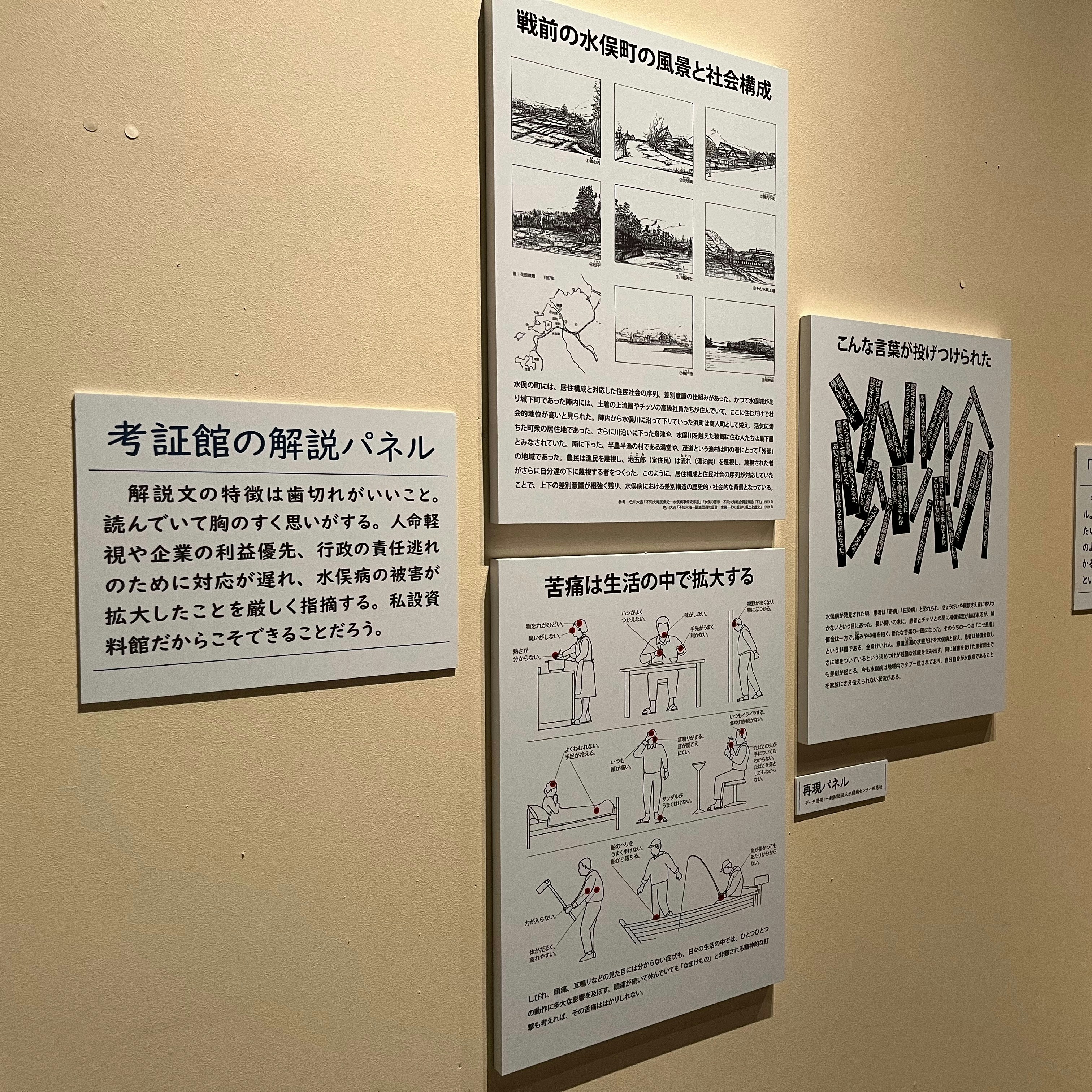 ここでは考証館設立までの経緯や、同館展示物などが展示されているが、とくに注目したいのは、私設資料館だからこその主語を明確にした訴えのあり方の紹介だ。例えば、会場では同館で使われている展示パネルの再現品を見ることができる。企業の社会的責任や行政の怠慢を追求するような歯切れの良いテキストは、被害にあった水俣の人々の心情や葛藤までを伝えようとする、客観的な第三者目線では実現できない力強さがある。また、この章では館以外での相思社の活動も広く知ることができる。