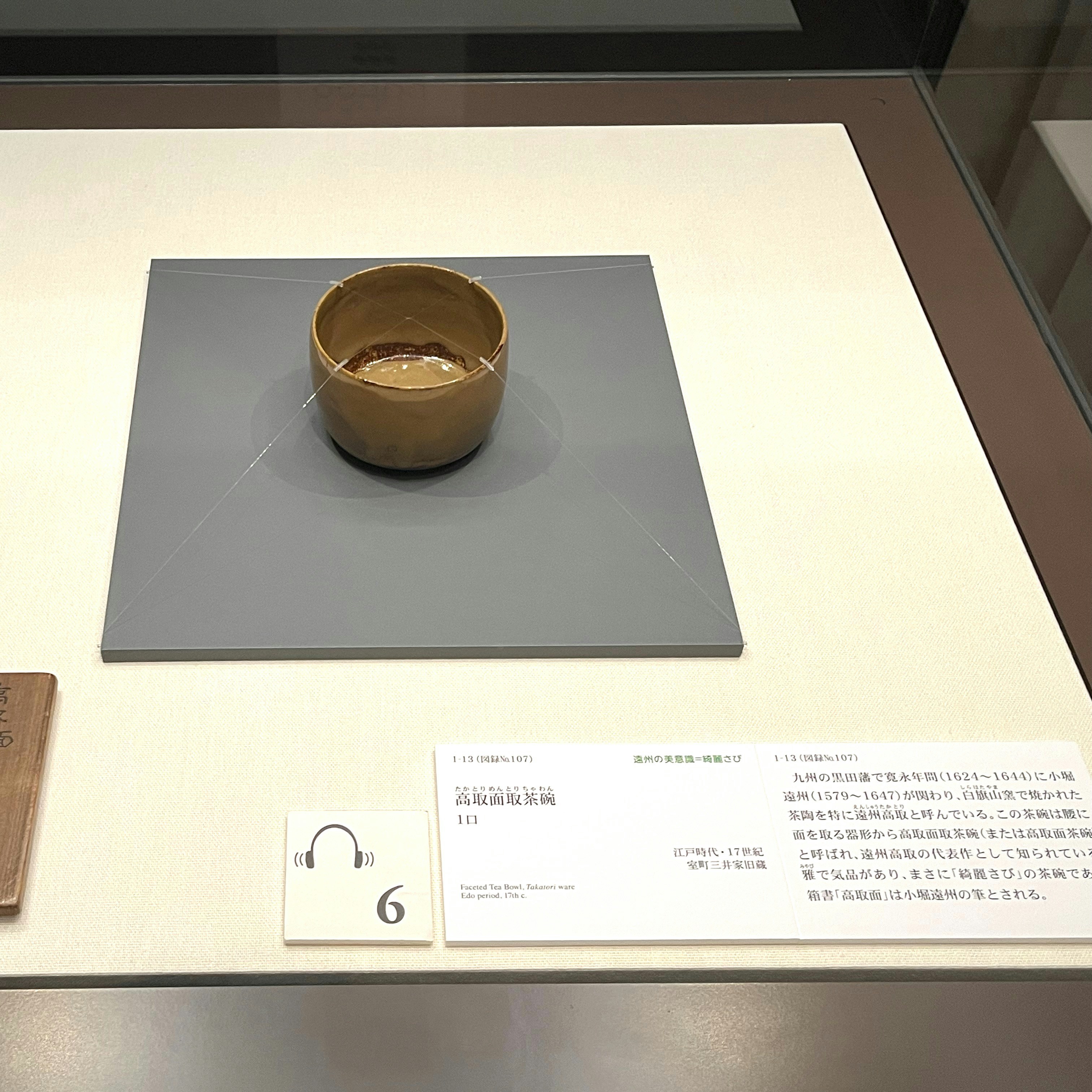 こうした遠州の好みが顕著なのが《高取面取茶碗》(江戸時代・17世紀)だ。茶碗の腰が美しく面取された本品は、その気品あるフォルムがまさに「綺麗さび」を象徴している。