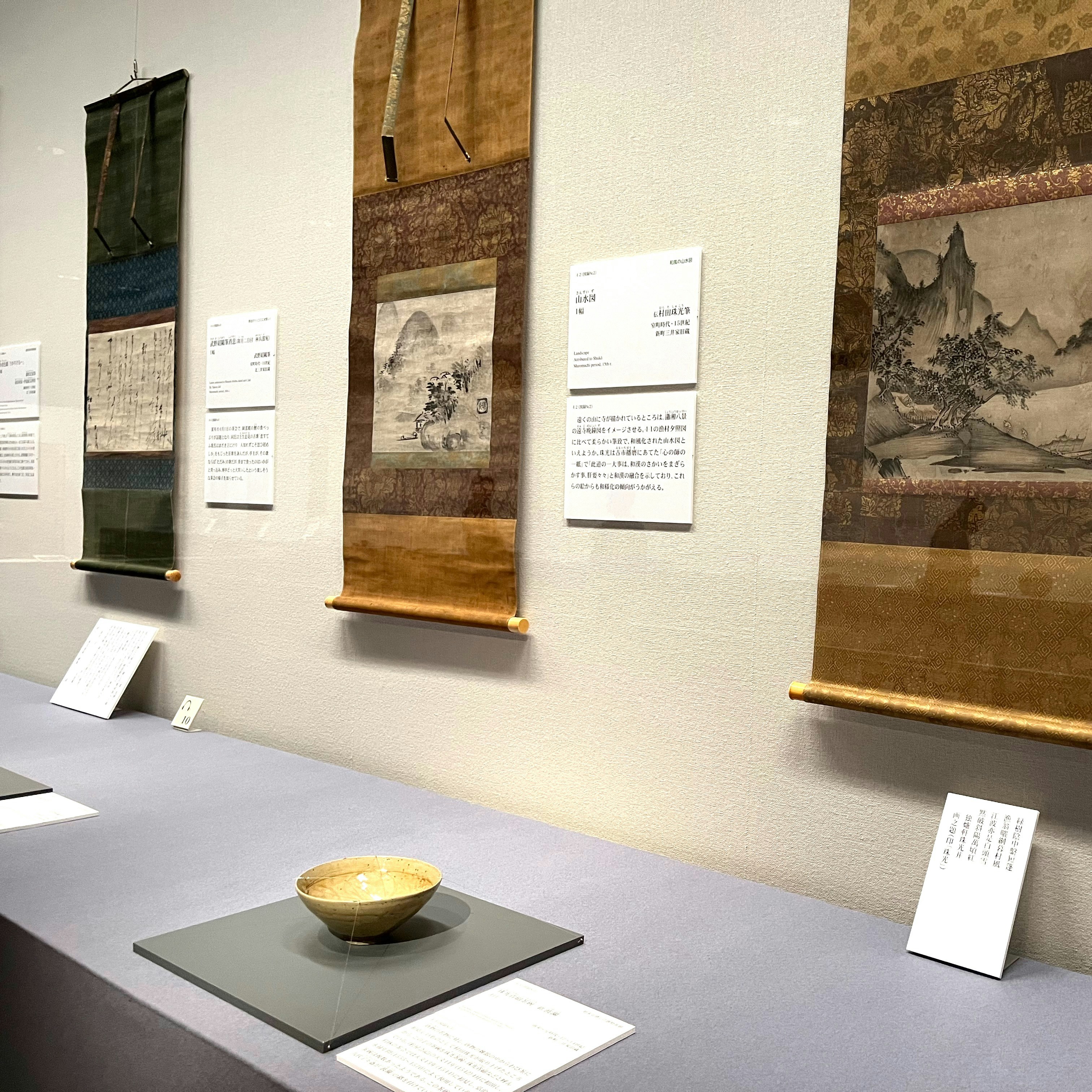 展覧会の後半にかけては、利休、織部、遠州それぞれのゆかりの品をより深く紹介していく。例えば、わび茶の創始者とされる村田珠光の筆と伝わる山水図は、利休の「わび・さび」のルーツを知るうえで重要なものといえるだろう。