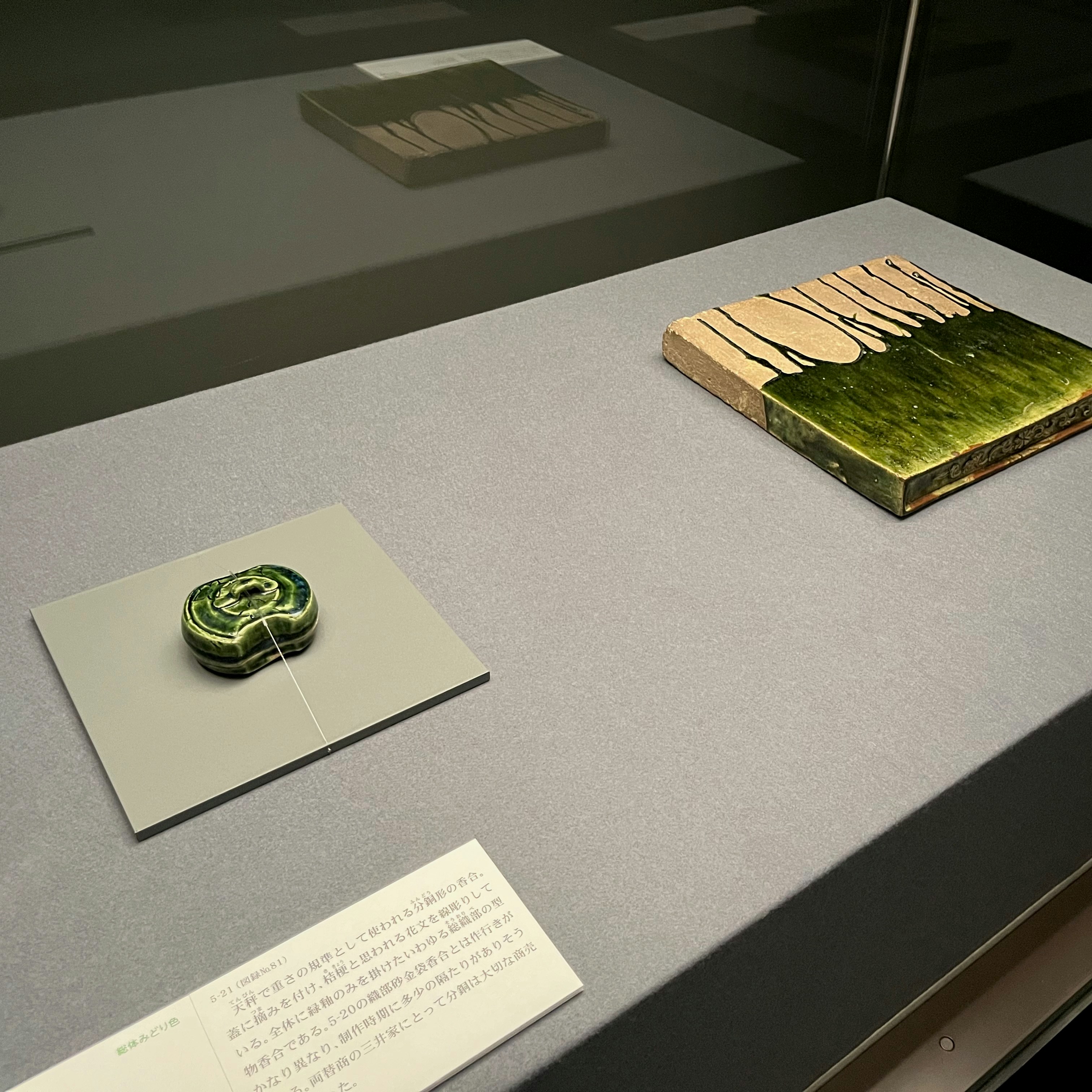 ほかにも織部の好んだ緑釉の香合や瓦、遠州の味のある筆跡がよくわかる直筆の色紙や消息など、茶の湯をつくりあげた各人の美意識が込められた品々を堪能できる。