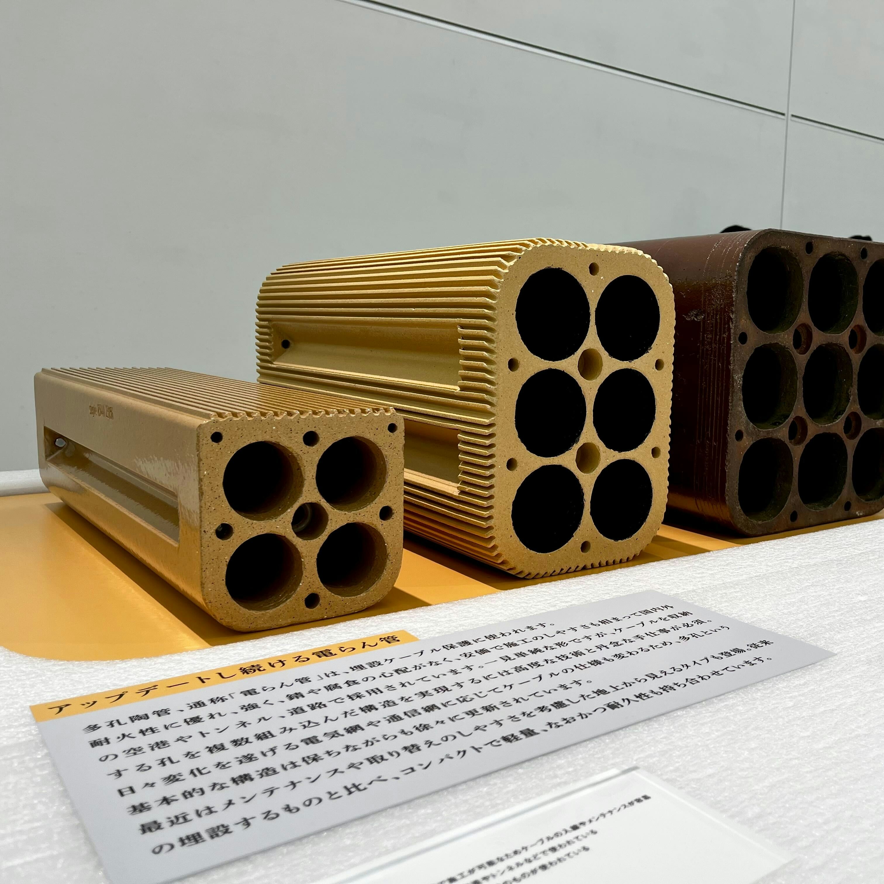 会場では、今回の参加クリエイターらと日本各地で探したデザインの宝が紹介されている。例えば、愛知県出身の片岡真実は常滑市に足を運び、旧帝国ホテルに使用された「すだれレンガ」や、ケーブルなどを土中で保護する電らん管を用いてつくられた「電らん管ハウス」(1955年頃竣工)に着目した。電らん管は通常人目に触れるものではないが、実物を見るとその美しい設計に驚くばかりだ。