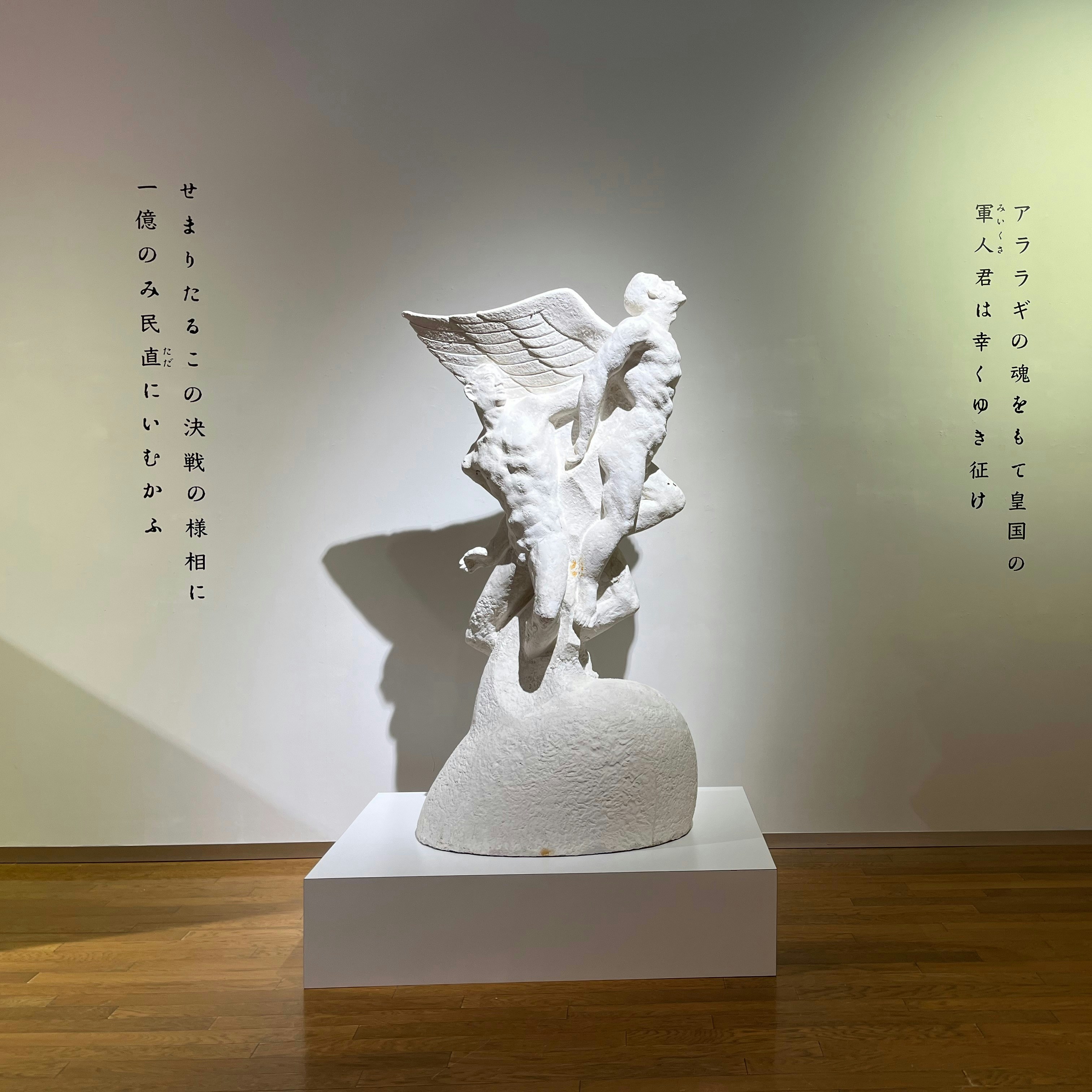 蔵王には第二次世界大戦の記憶も残る。本展で展示されている山形県出身の彫刻家に長井市出身の長沼孝三(1908〜1993)による彫刻《東亜進軍》(1942)は、茨城・ひたちなか市の旅館で近年発見されたもので、東北芸術工科大学の文化財保存修復センターで補修作業が行われている。芸術家の戦争協力の歴史を知るうえでも、重要な資料といえる。