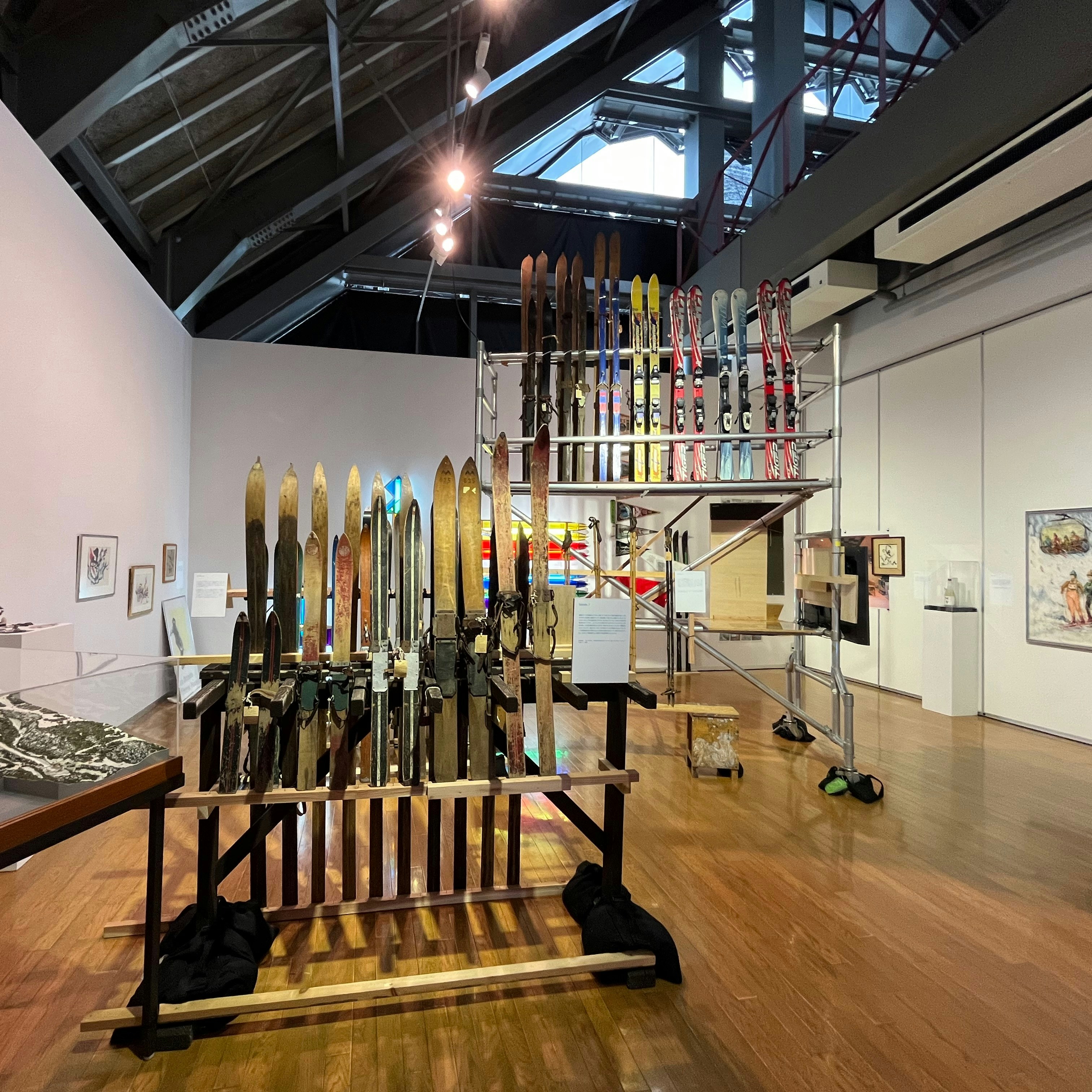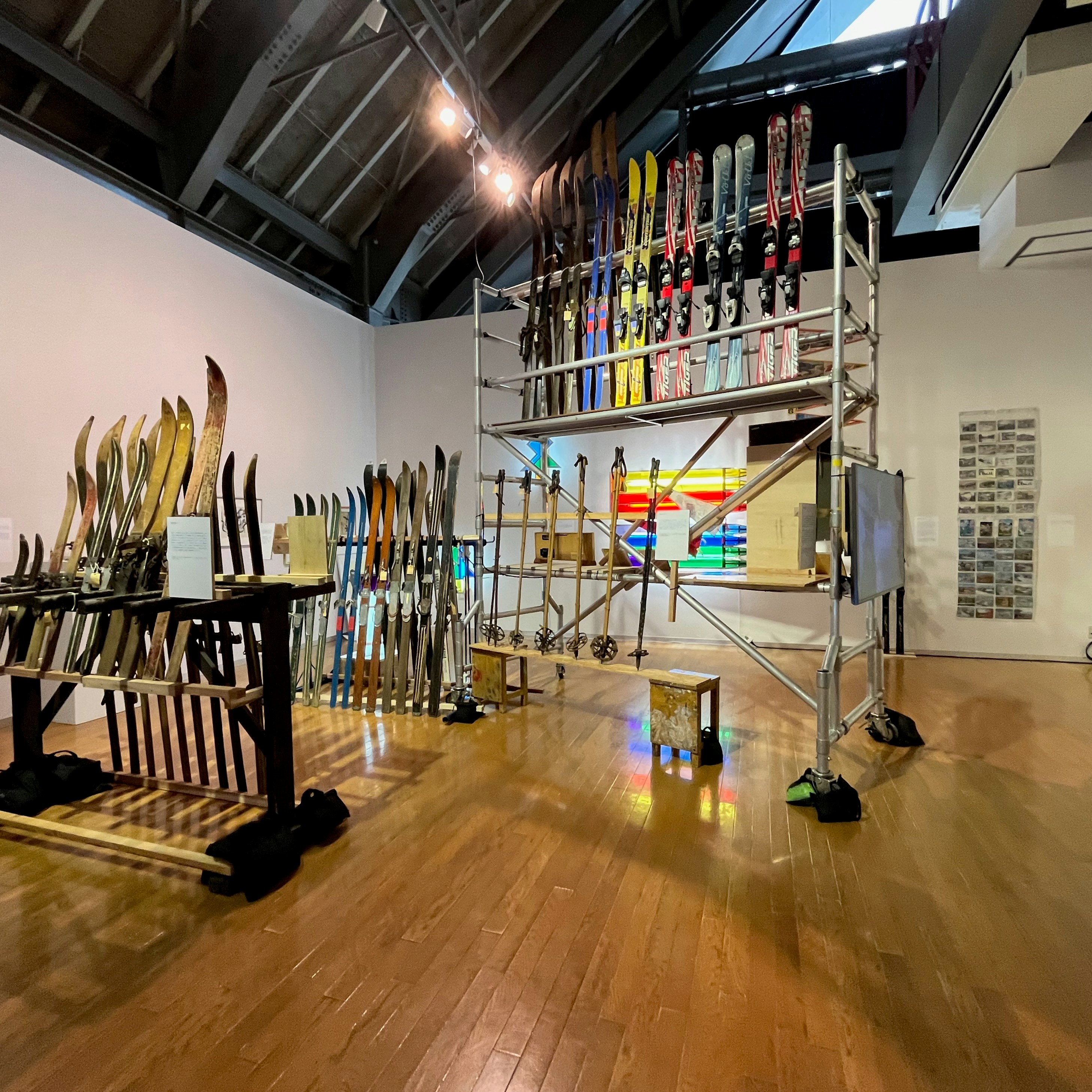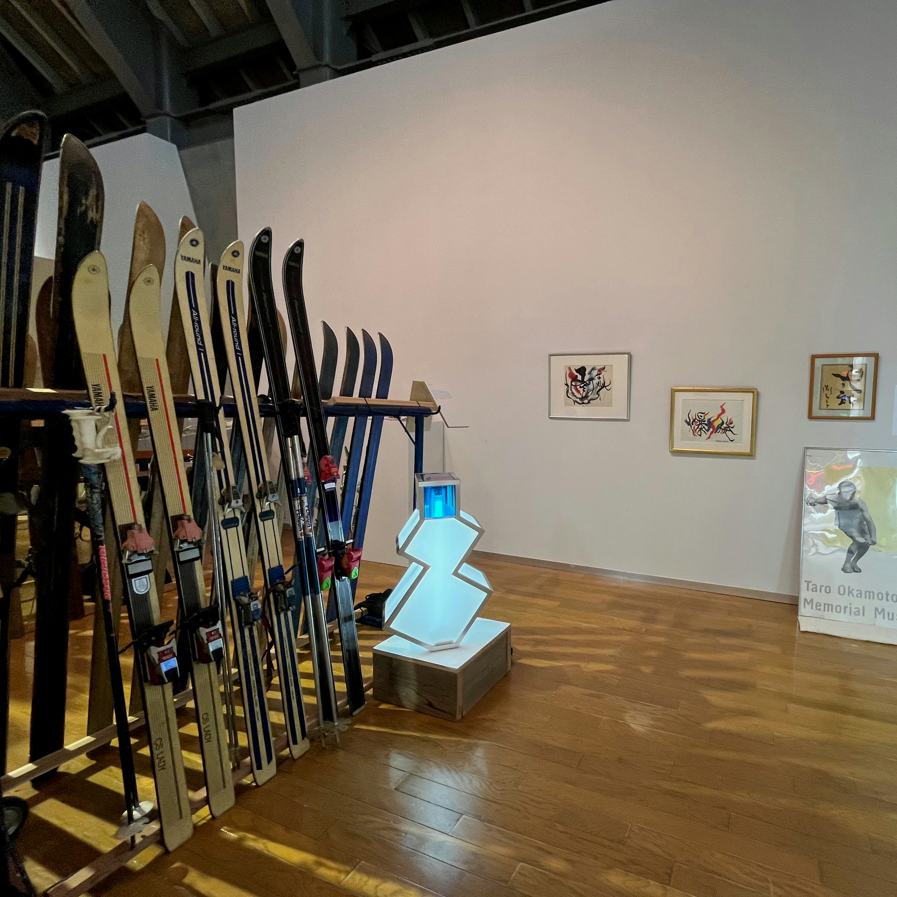 中﨑透は、スキーや雪上の道具にまつわる文化や歴史をリサーチをもとにする展覧会「シュプールを追いかけて」をこれまで青森や札幌で展開してきた。茨城・水戸で生まれ育った中﨑にとって蔵王は、子供の頃から足を運んできた愛着のあるスキー場だという。本展に際して中﨑は、岡本太郎との深い親交で知られる「ル・ベール蔵王」の川﨑禮子、蔵王の自然の風景を撮り続ける「伊藤屋」の伊藤仁、日本を代表するスキーヤーでもある伊東秀人への取材をもとに展覧会を構築。スキー板の変遷や、リゾート文化の発展、ペナントやキーホルダーといった土産物などを、アクリルのライトボックスなどとともに展示構成し、蔵王におけるスキー文化を多面的にとらえた。