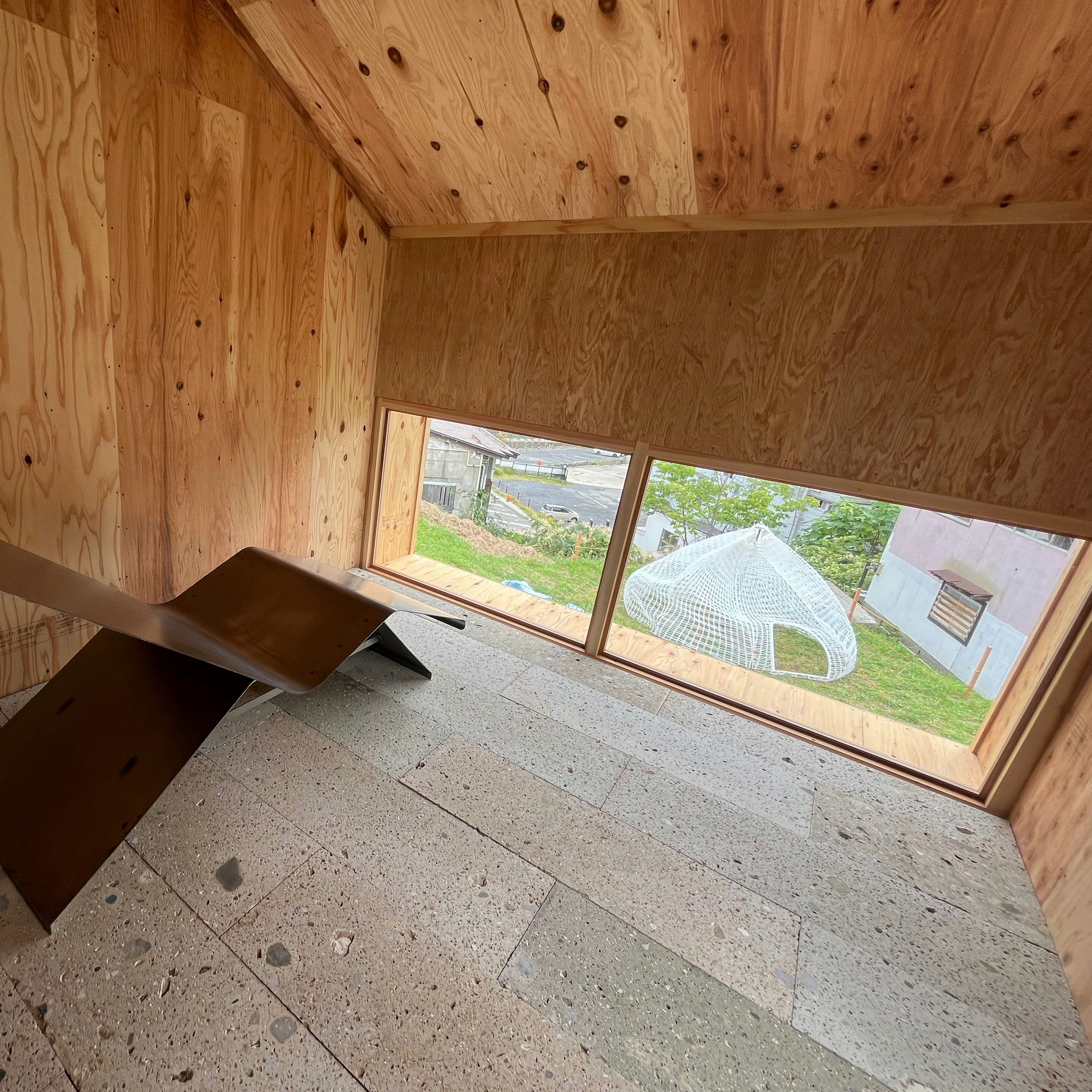 温泉街を見下ろす駐車場には、無音で冷水が循環するラジエーターが備えつけられた渡邉吉太による3つの部屋《ねむりの空間|間の庵/あわいのいおり》が建築された。内部に入り、ステンレス製のイスに座って眠りと覚醒のあいだにあるような空間を体感できる。