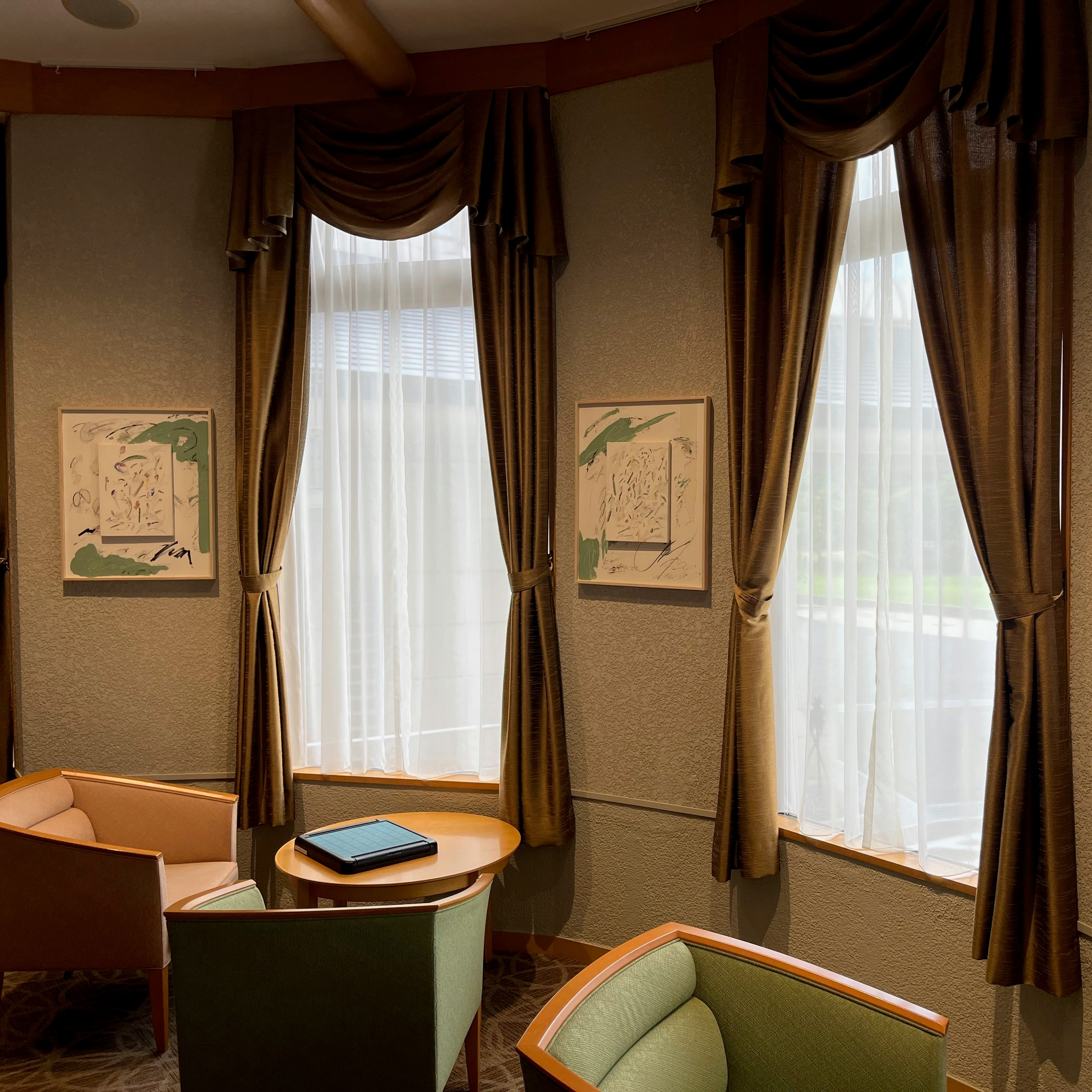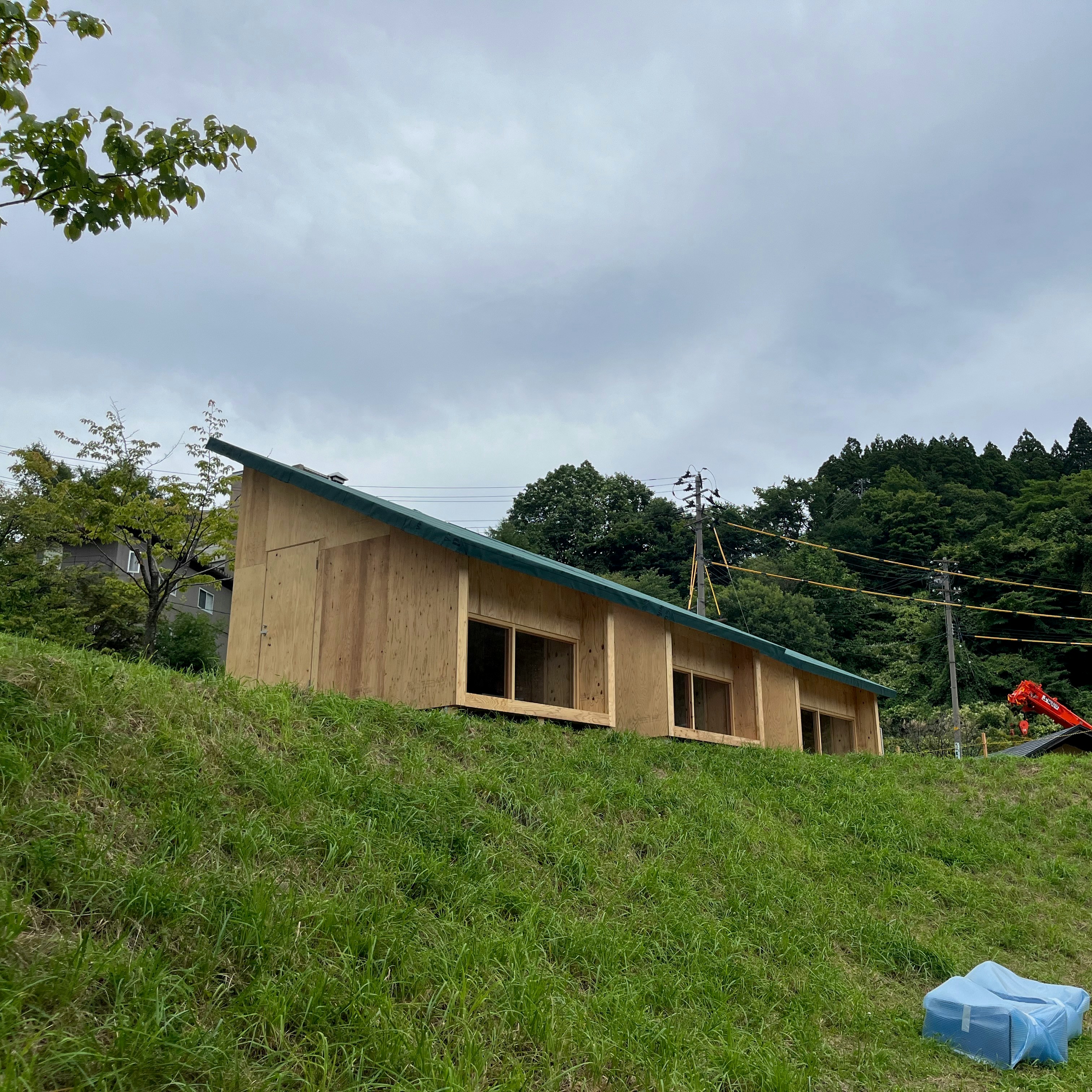 2階では原田綾乃と山本柱輔の展示が行われている。木版画表現を主体とする原田は、和室になじませるように作品を展開。山本は、「流れ」「変化」「重なり」をキーワードに、東北芸術工科大学から蔵王温泉までの約15キロを歩きながら描いたドローイングのほか、彫刻など、部屋の窓から見える蔵王の風景とも呼応させるようにして展示した。