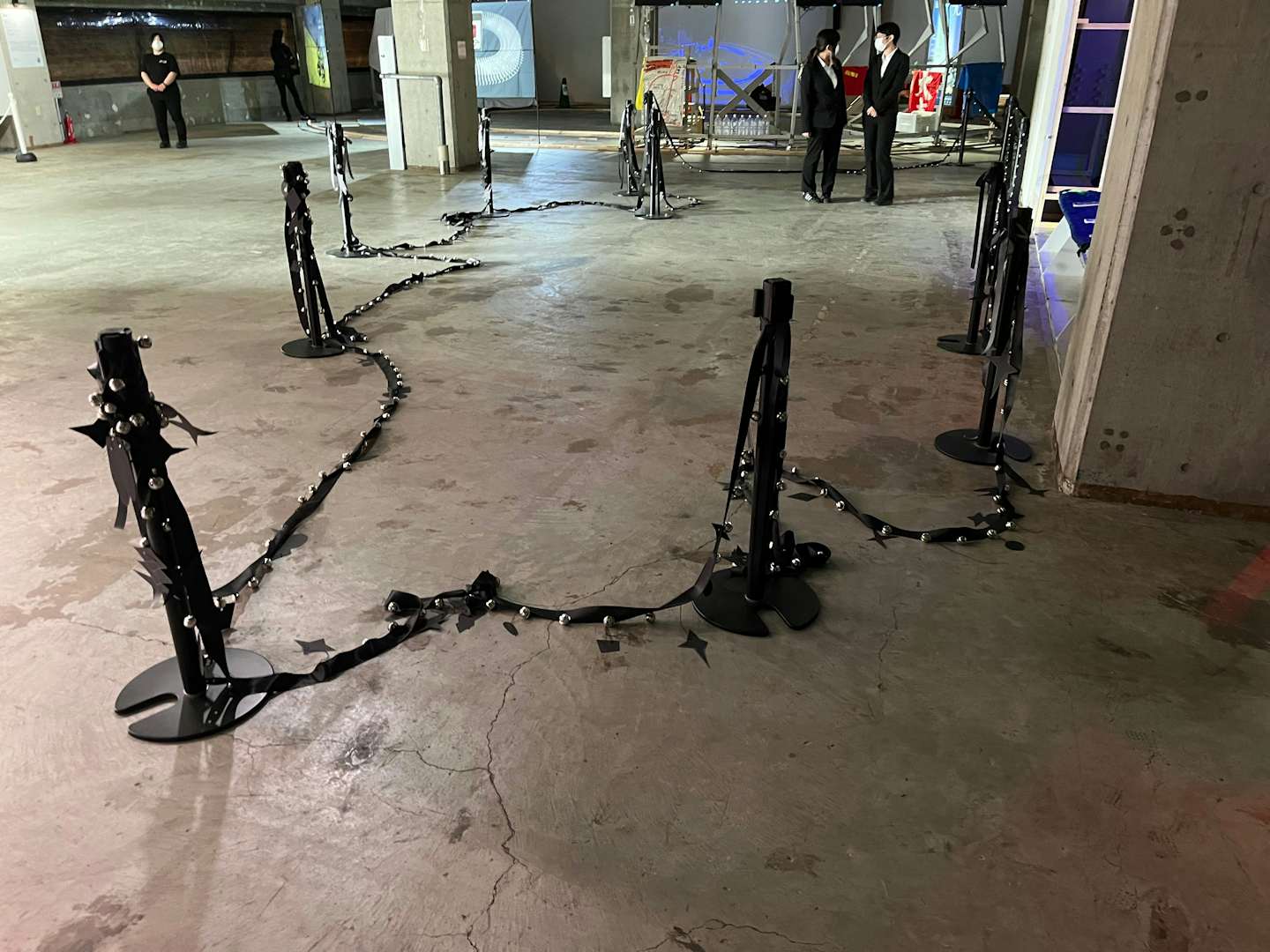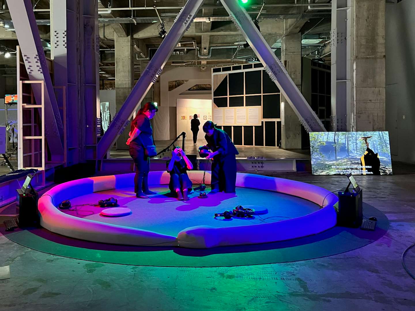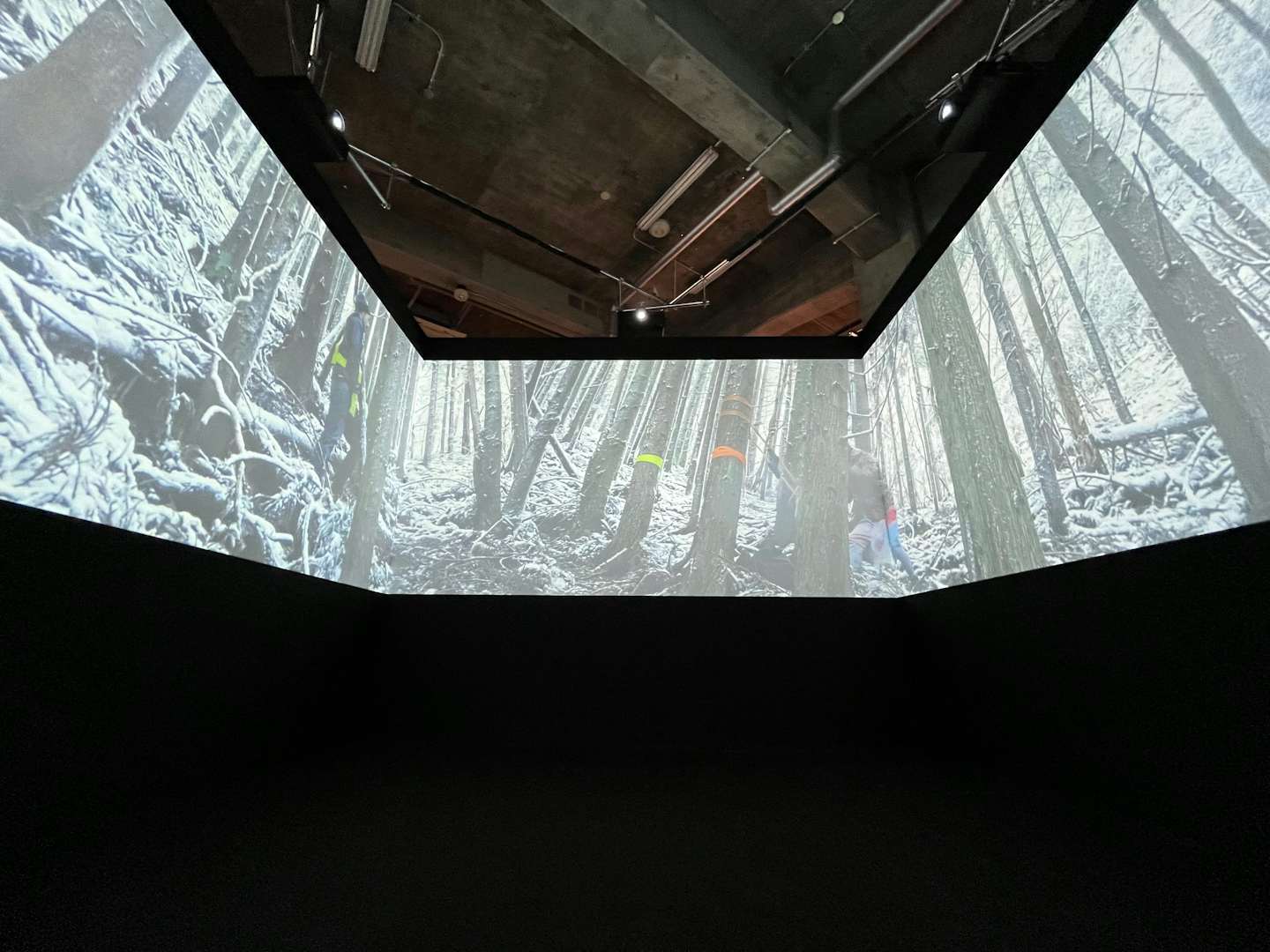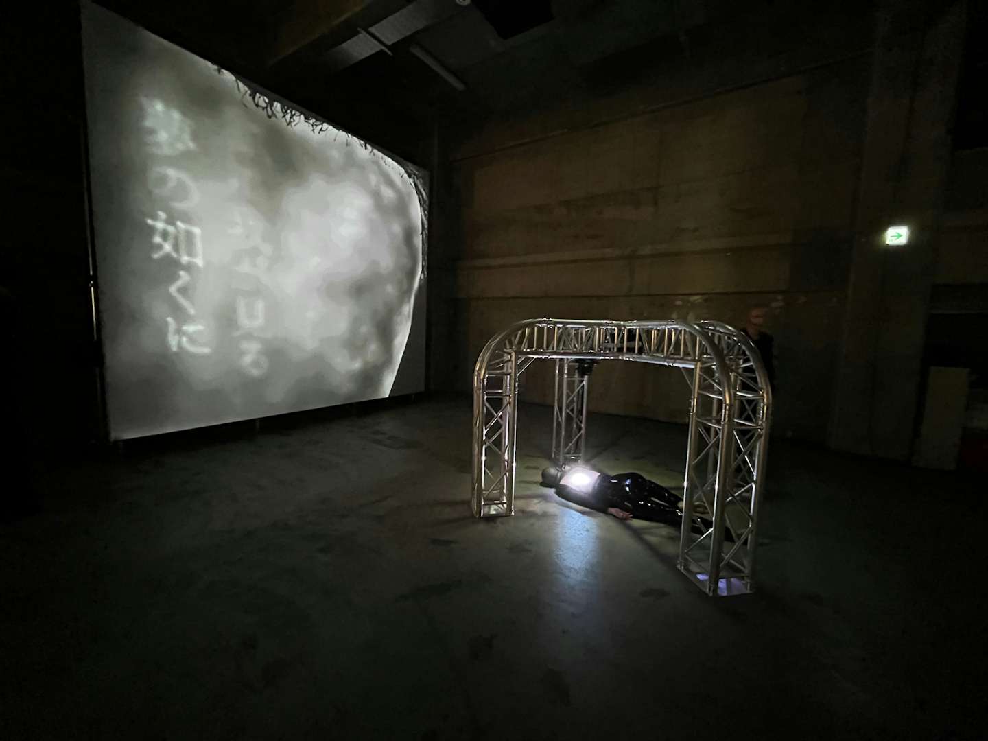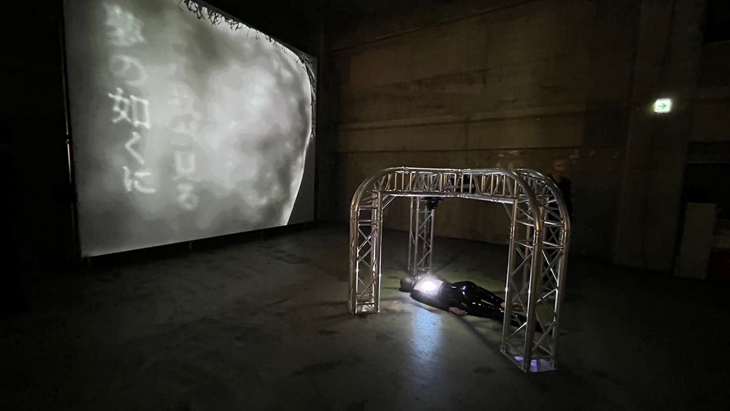 テクノロジーと身体表現とを融合させたインスタレーションやパフォーマンスで知られるアーティストデュオ・MESは、新作《ダイ/DA-l》 (2024)を発表した。MESのメンバーが床に寝転がっており、その背中を上からのレーザーがなぞっていく。身体への抑圧を眼の前で感じさせるというインパクトあるパフォーマンスが、本展の目指すところを強烈に印象づけるだろう。