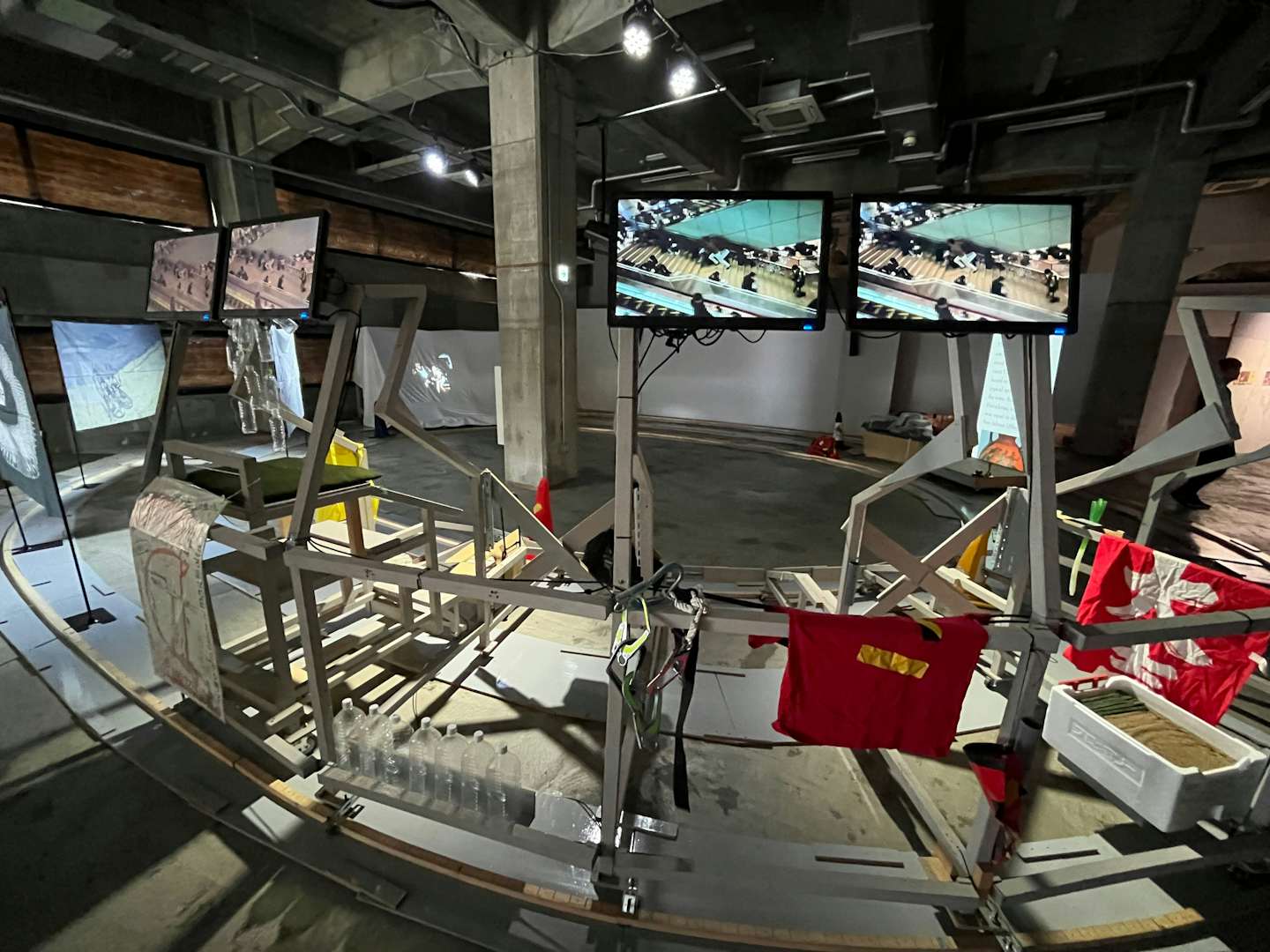 09年に結成されたアーティスト・コレクティブ「オル太」は、20年に初演された作品《超衆芸術 スタンドプレー》を、モニターやインスタレーションを組み合わせて展開。東京オリンピック開催前夜の東京で見つけた興味深いものを組みあわせ、新国立競技場を模したインスタレーションの中で映像を上映。都市での共存というテーマを掘り下げた。