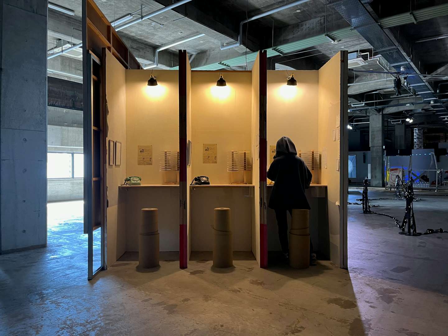 いま、世界で起きている国際情勢に様々な方法でアプローチする作品も見受けられた。07年結成の演劇カンパニー、かもめマシーンは電話回線を用いて一対一で上演する「電話演劇」に取り組んできた。本展ではイスラエルによるガザの大規模侵攻を経験した人々が書いたモノローグ集『ガザ・モノローグ』を扱う、災害用伝言ダイアルをつかった作品を展示。受話器をとおして観客一人ひとりが声をきき、そして自ら話すことで、ニュースでは見えてこない個人の物語に向き合う。