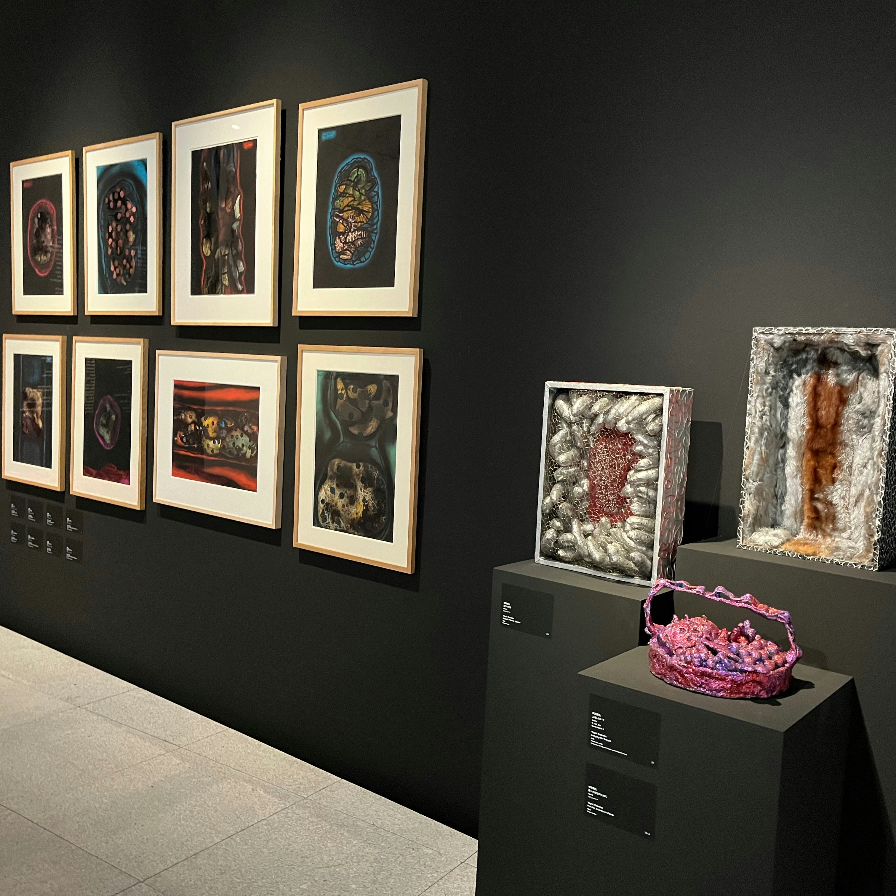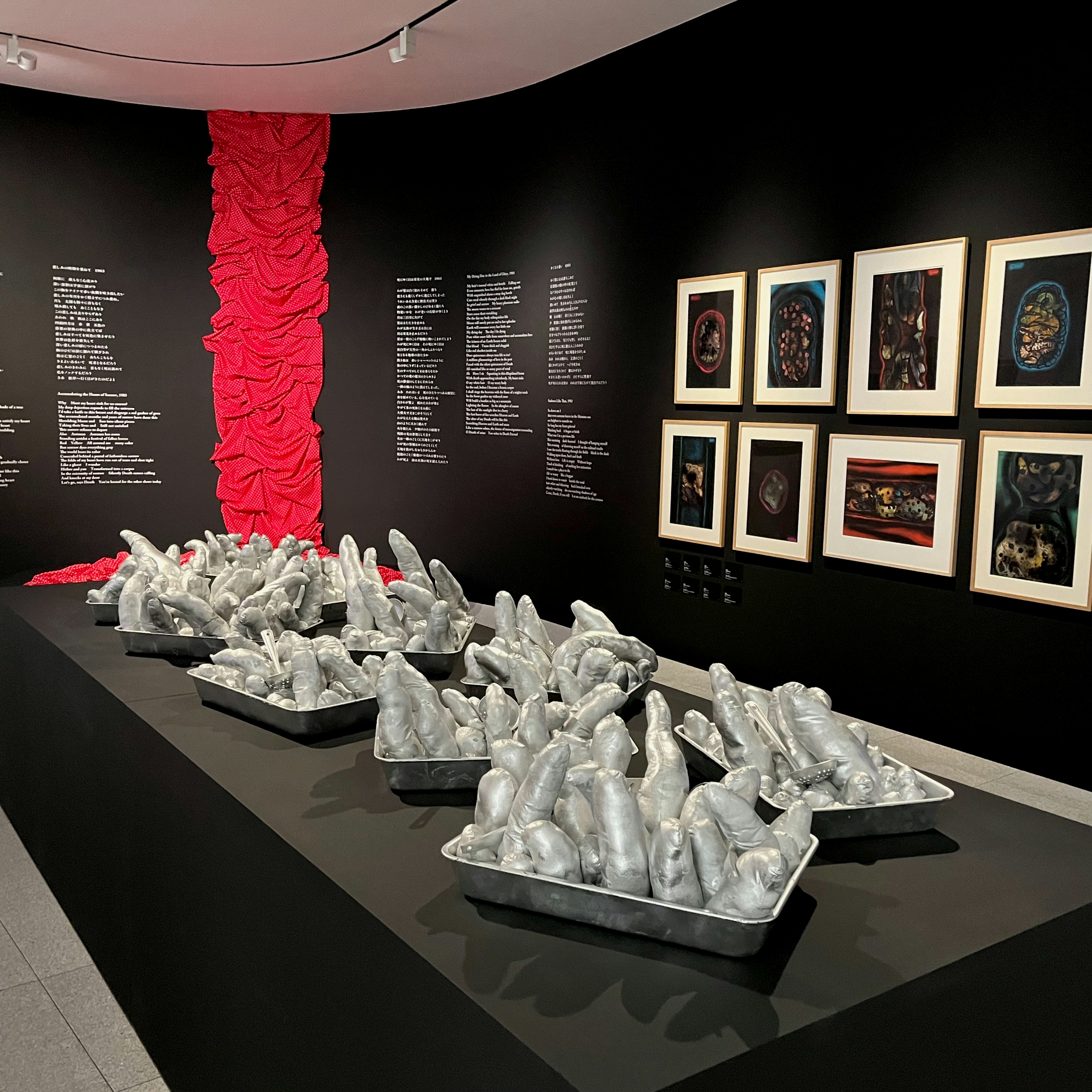 1階のエントランスには立体作品《生命(REPETITIVE VISION)》(1998)と、アクリル絵画のシリーズ「わが永遠の魂」より《永遠に生きていきたい》(2017)と《自殺の儀式》(2013)が展示されている。