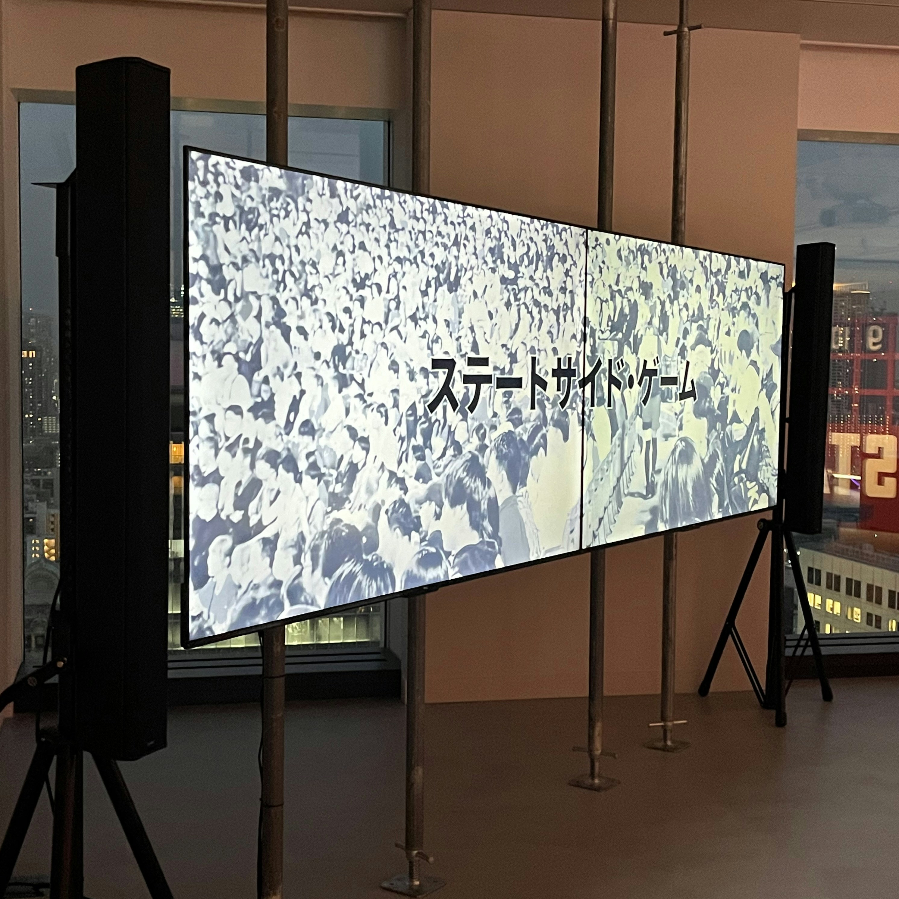 まず会場で目につくのは、鎮座する野球のスコアボードと、球場の観客席を思わせる青いベンチ、そして映像によって構成された《ステートサイド・ゲーム》だ。本作は志賀が自らがファンであるという東京ヤクルトスワローズのホームグラウンドである神宮球場と、球団の応援歌である「東京音頭」の歴史に着目して制作した作品だ。