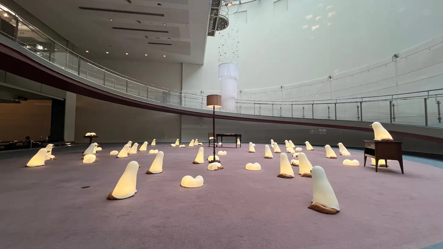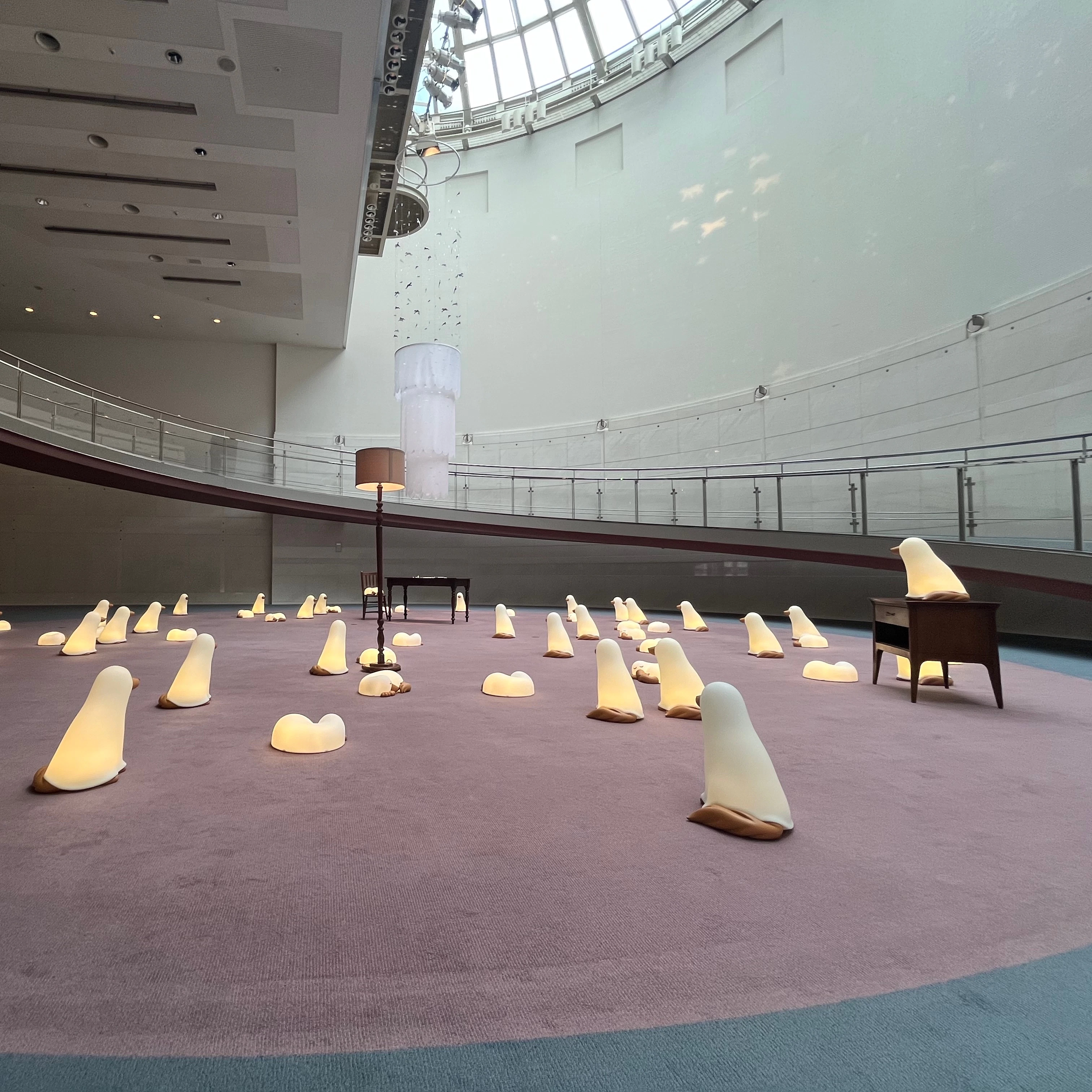 foxcoは「今回の展覧会は天に登っていくようなスパイラルの建築からもインスピレーションを受けた」と語っており、「おばけいぬ」たちは吹き抜けの天井から吊り下がったシェードを見つめながら、思い思いの時を過ごしている。
