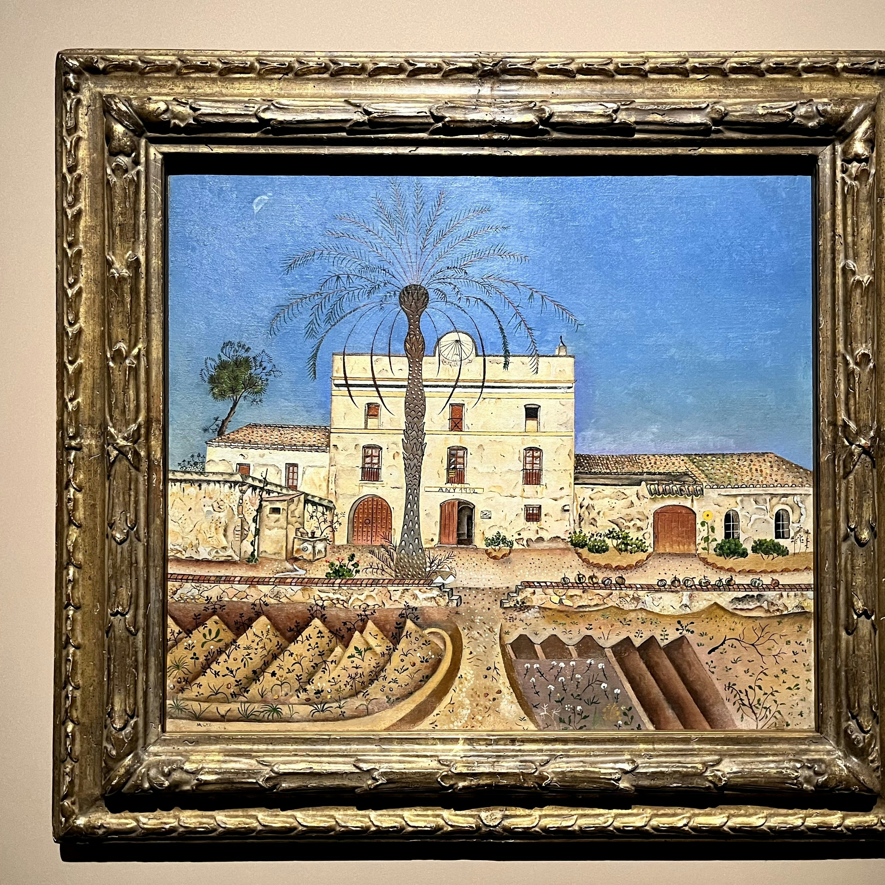 まず、第1章の「若きミロ 芸術への決意」では、仕事があわず病に臥せってしまった若きミロが、仕事を辞め画家を志す決意した頃の作品が展示されている。自画像や風景画などは具象表現が中心となっているものの、一つひとつの作風は伝統的な表現から前衛的な表現までが入り混じったものとなっており、自身の作風を模索する姿勢が感じられる。