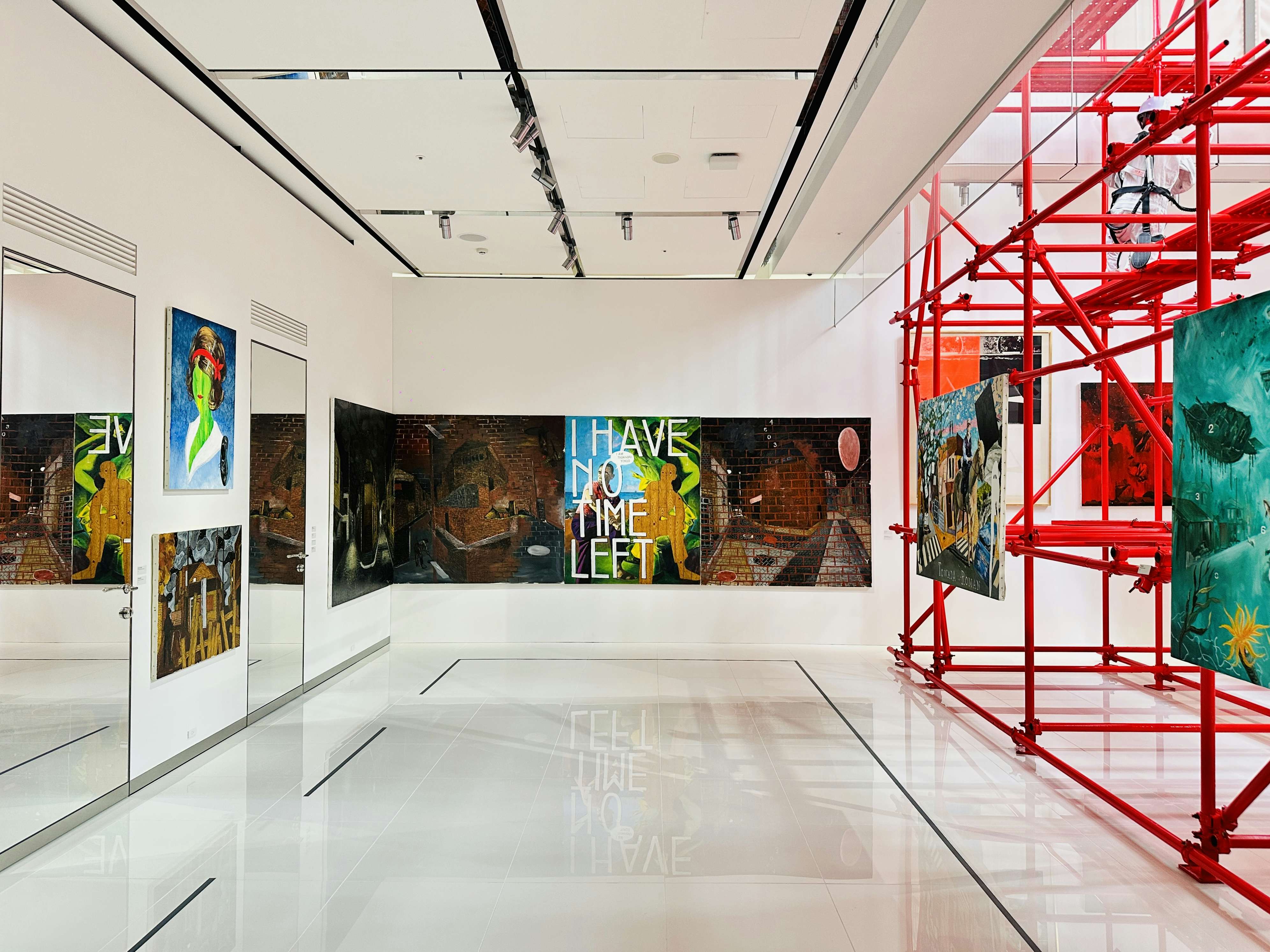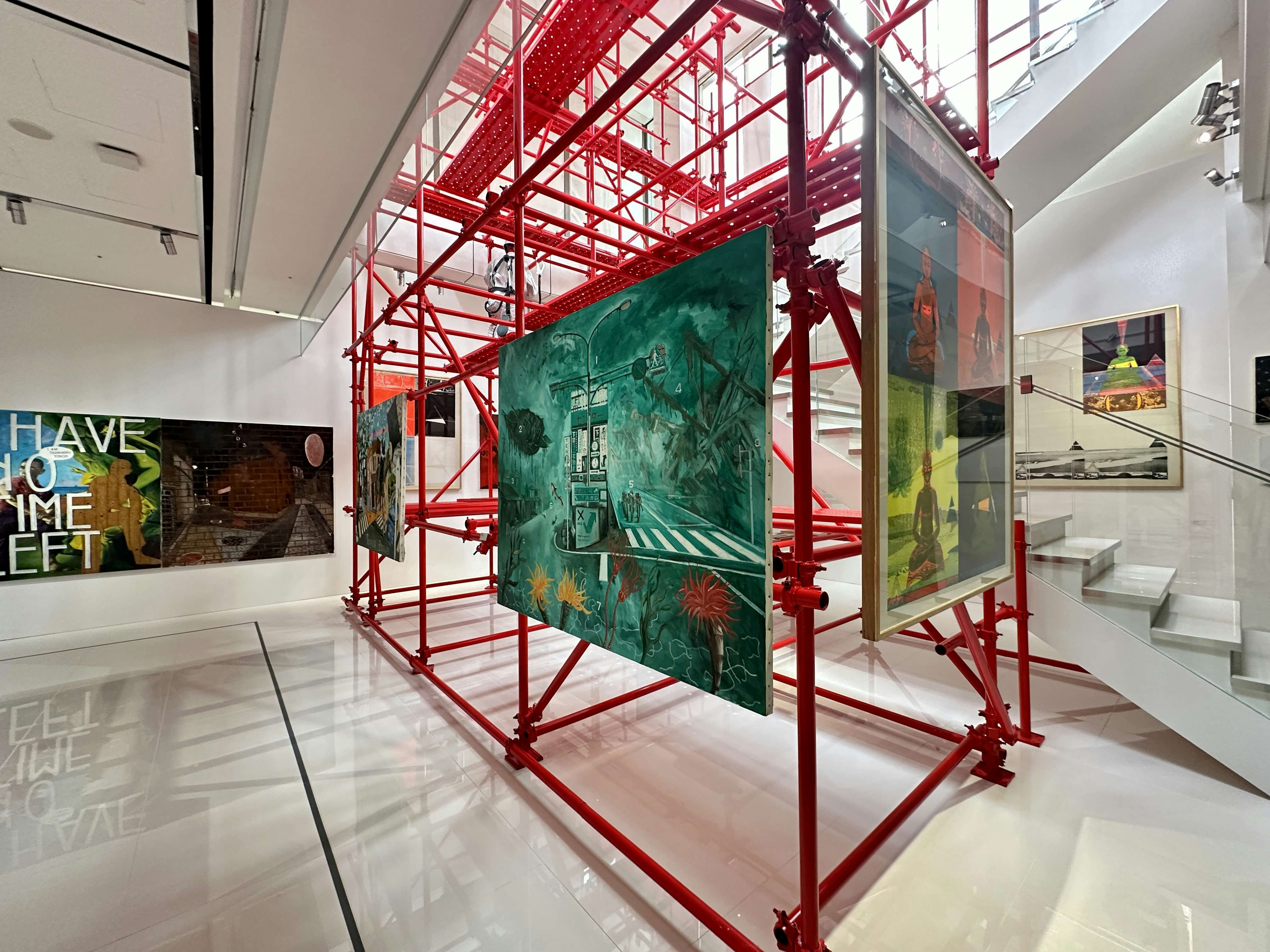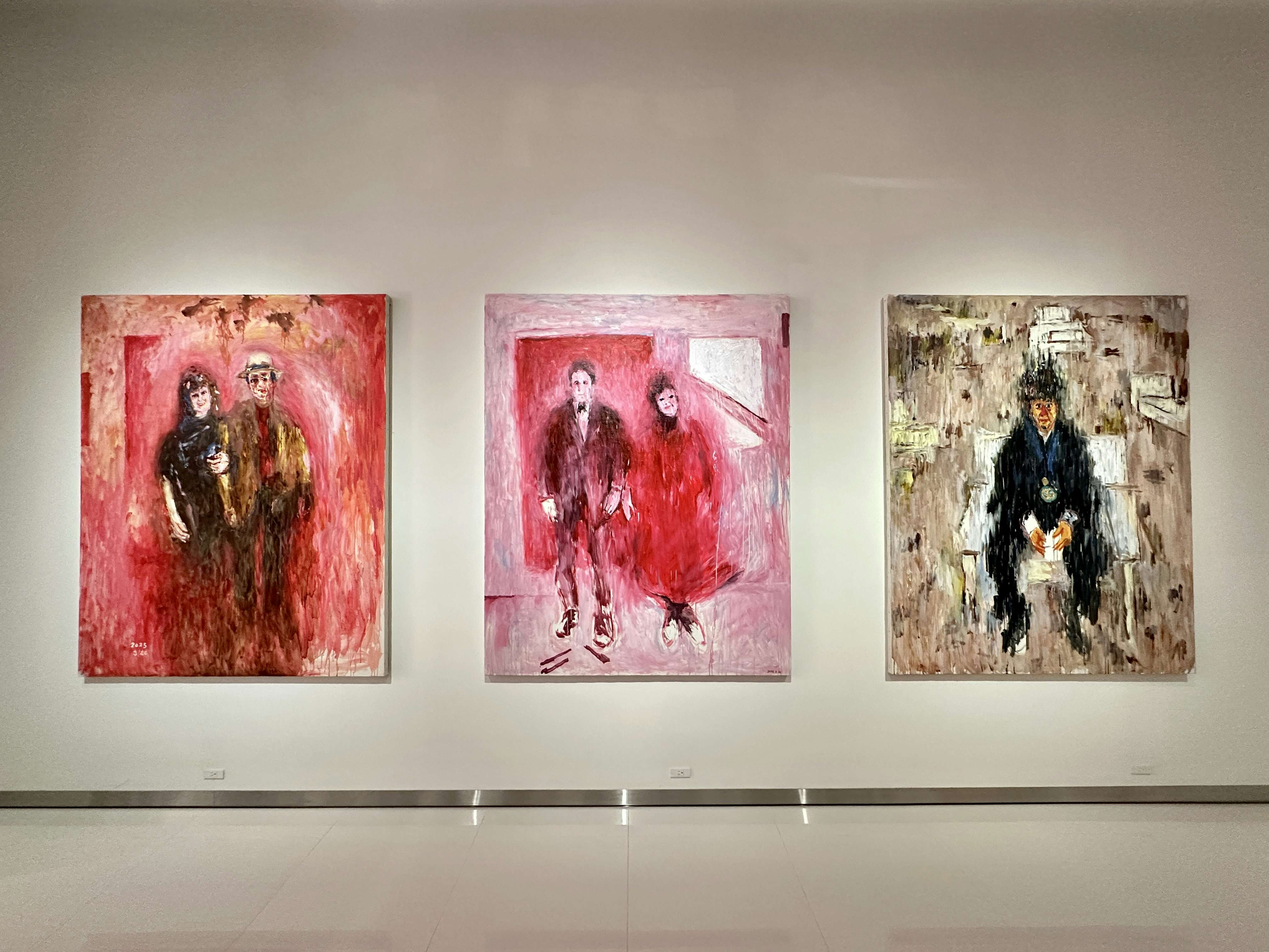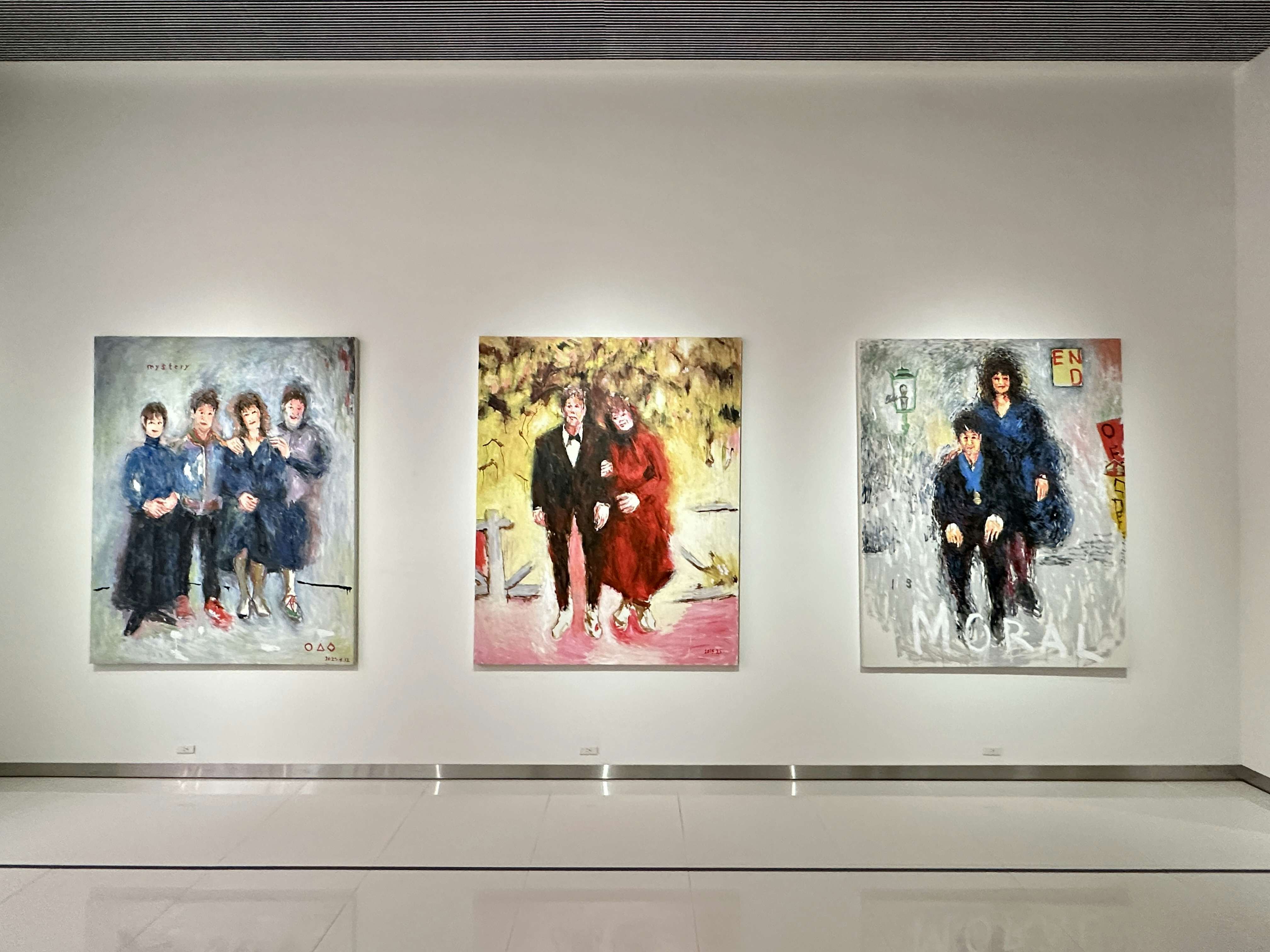 展示風景より、左から横尾忠則《家族総出演》《赤坂御苑》《未完のMORAL》(すべて2025)