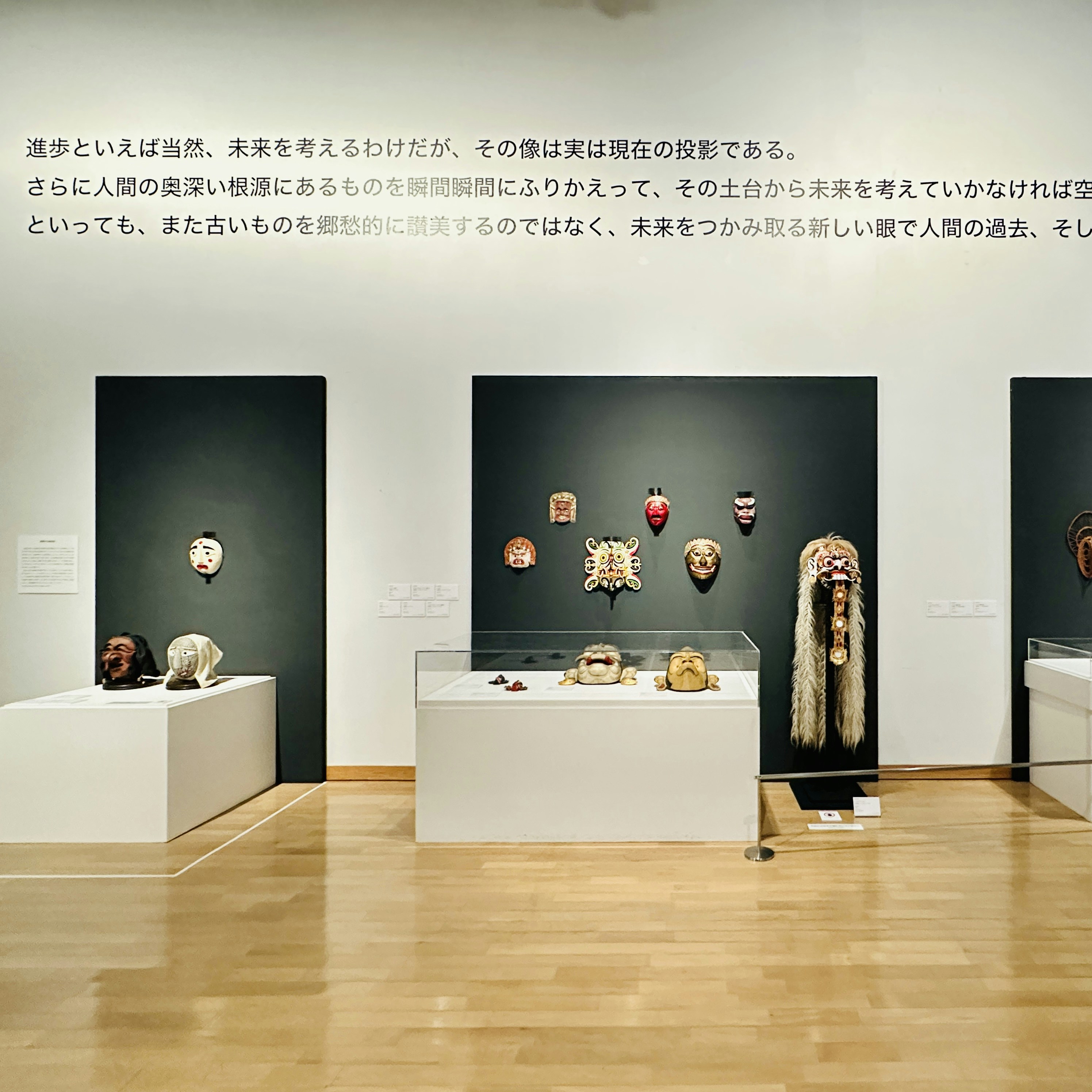 テーマ展示の地下空間は「過去・根源の世界」を表現するためにいくつかのゾーンに分かれ、「いのり」の空間では人類の心の奥深くに通底するものとして、世界各地から収集された仮面や神像などの民族資料が展示された。原初的で神聖な祭壇を想起させる展示プランも、岡本の発案だ。