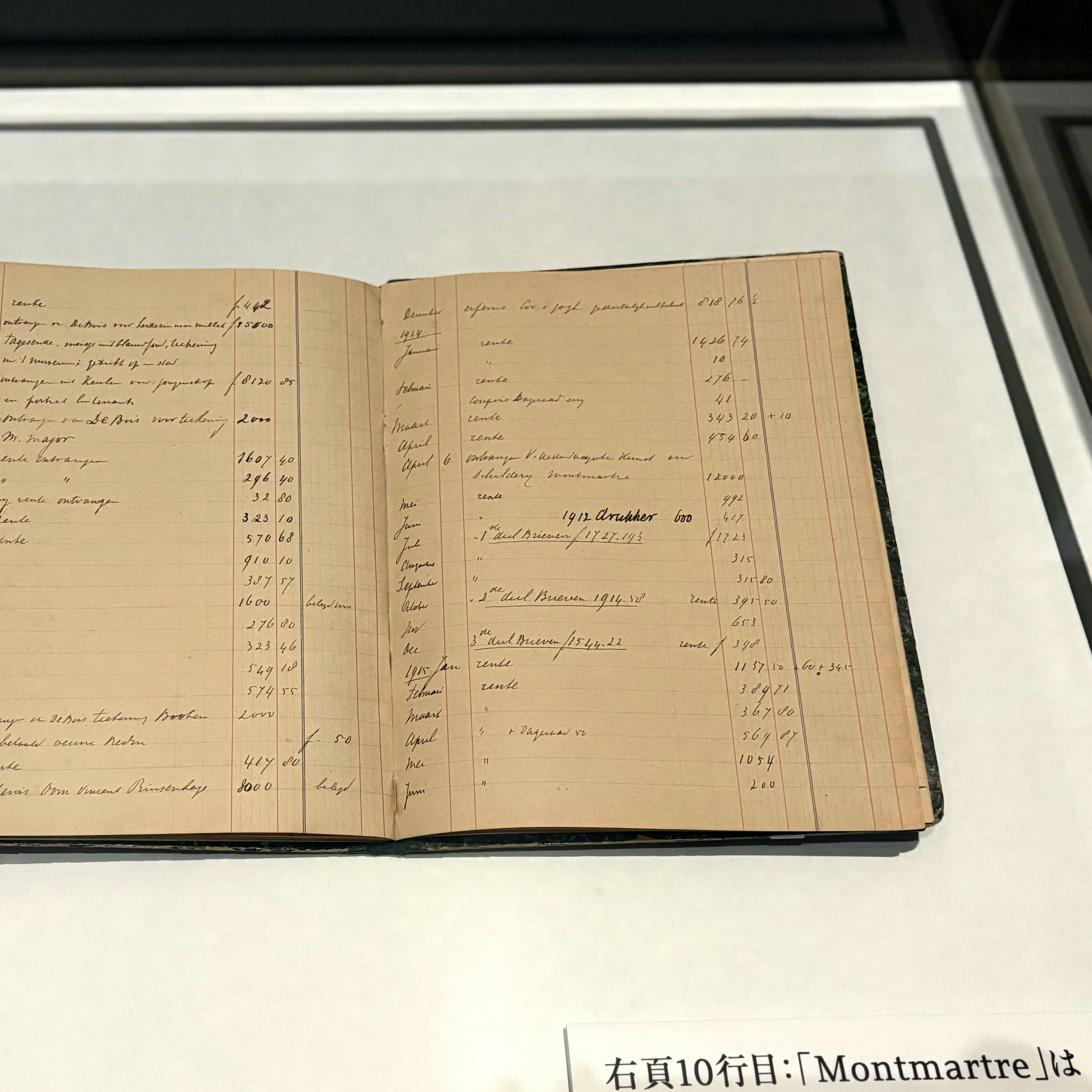 そんなヨーの尽力を明らかにするのが、テオとヨーの会計簿である。最初はいわゆる「家計簿」のような使われ方をしており、日常生活にまつわる収支が記載されていたが、テオの死後は作品の売却についても記されるようになった。どの作品をいつ誰にいくらで売却したのか、といった生々しい記録が残され、のちのファン・ゴッホ研究に大いに役立った貴重な資料だ。会計簿を見ればいかにヨーが几帳面で、そしてフィンセントの作品を世の中に広めるために意志を持って動いていたのかが窺い知れる。