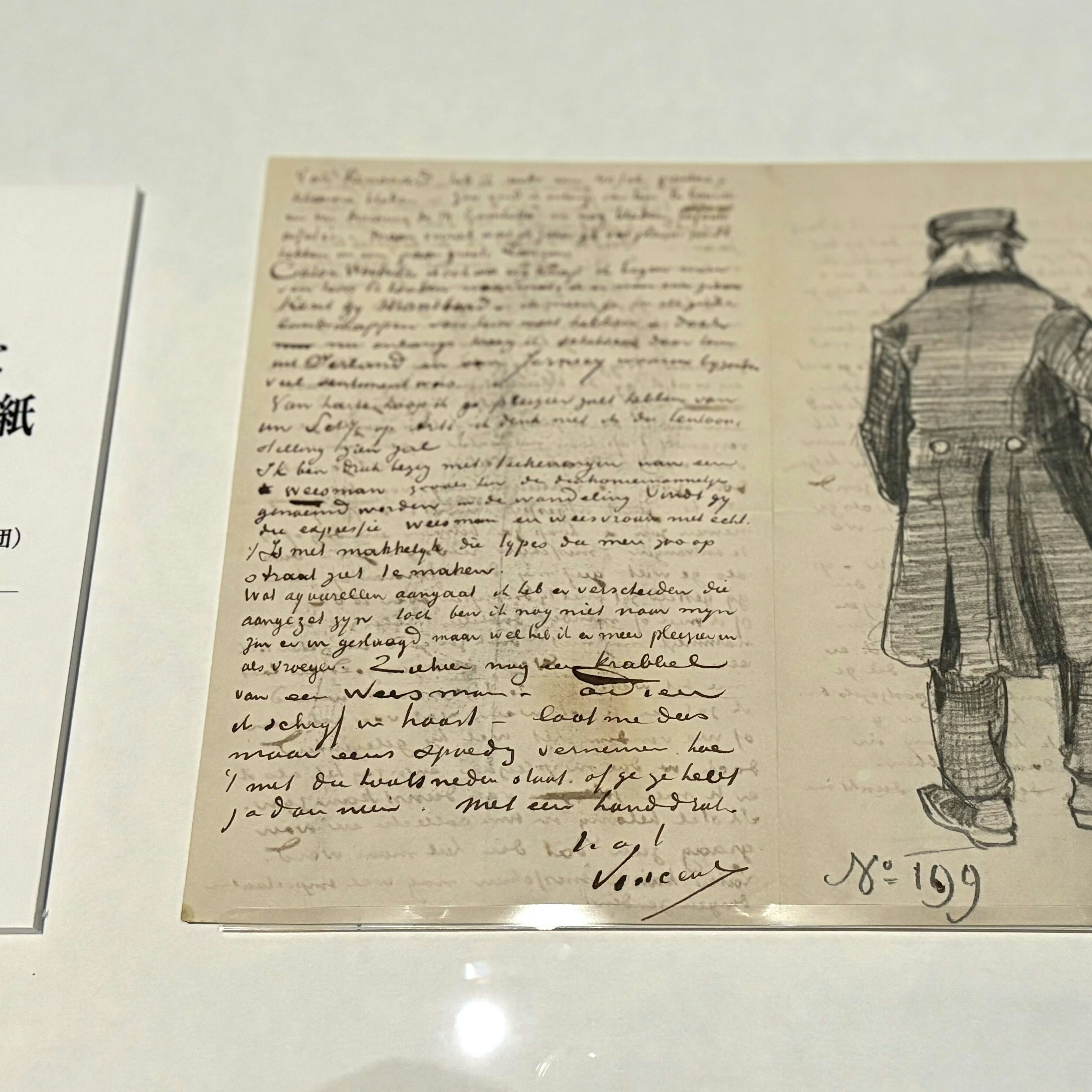 なかでも、フィンセント・ファン・ゴッホの手紙である「傘を持つ老人の後ろ姿が描かれたアントン・ファン・ラッパルト宛ての手紙」は、ファン・ゴッホがブリュッセルで出会った先輩画家であるファン・ラッパルトに宛てた手紙だ。ファン・ゴッホの手紙には質の悪い紙が使われていることが多く、また色褪せしやすいインクで書かれているため、実物が展示されることはめったにない。今回の出品は極めて貴重な機会だといえる。