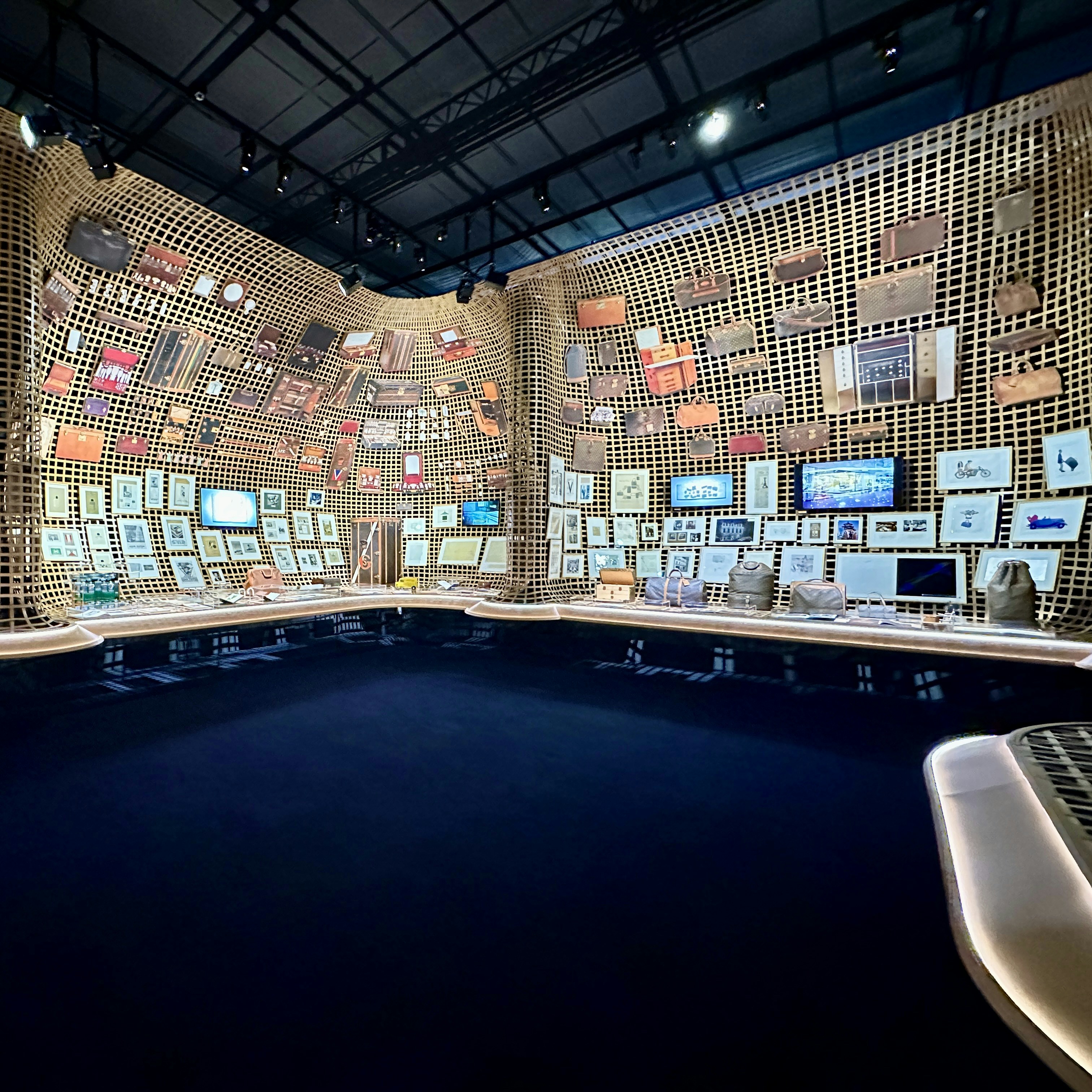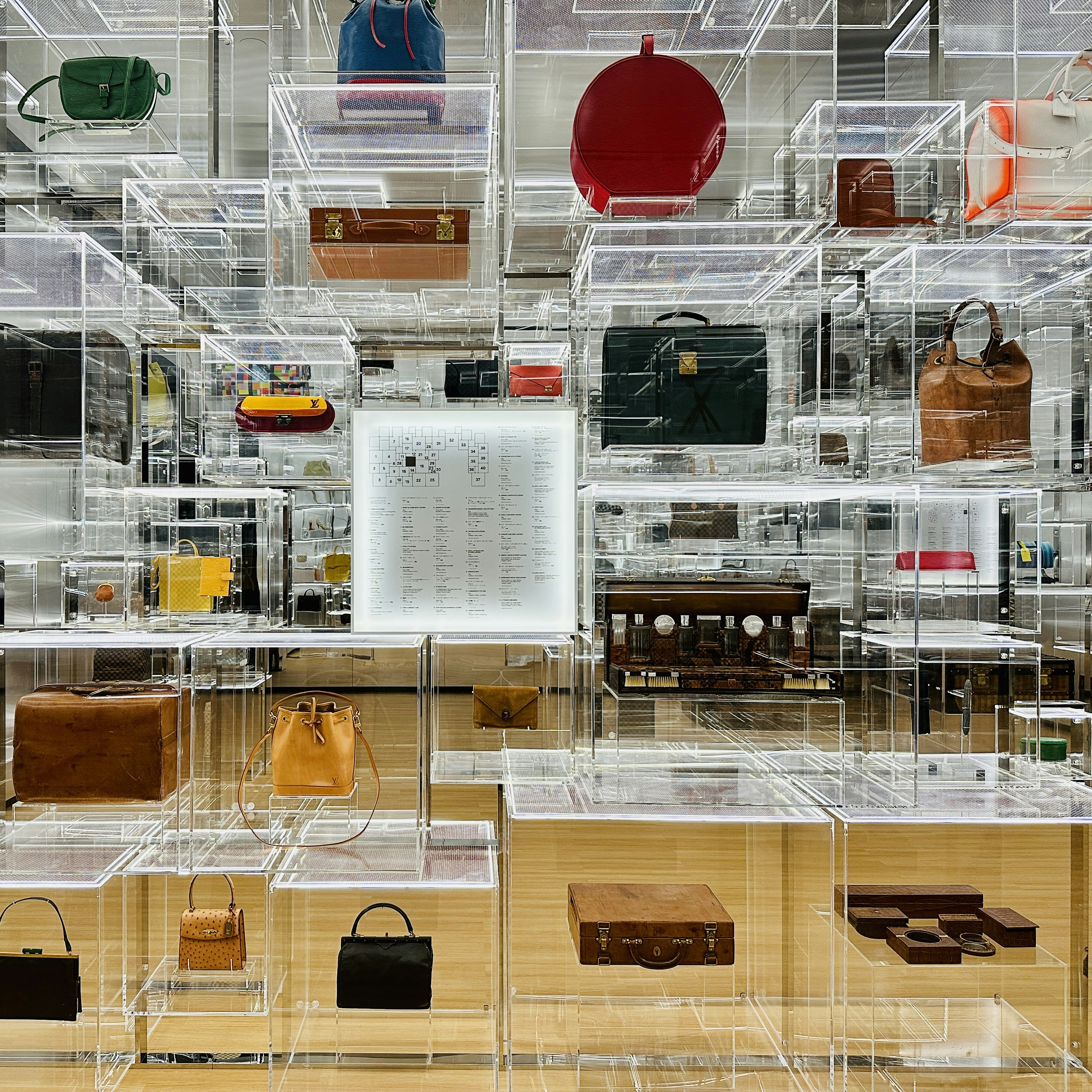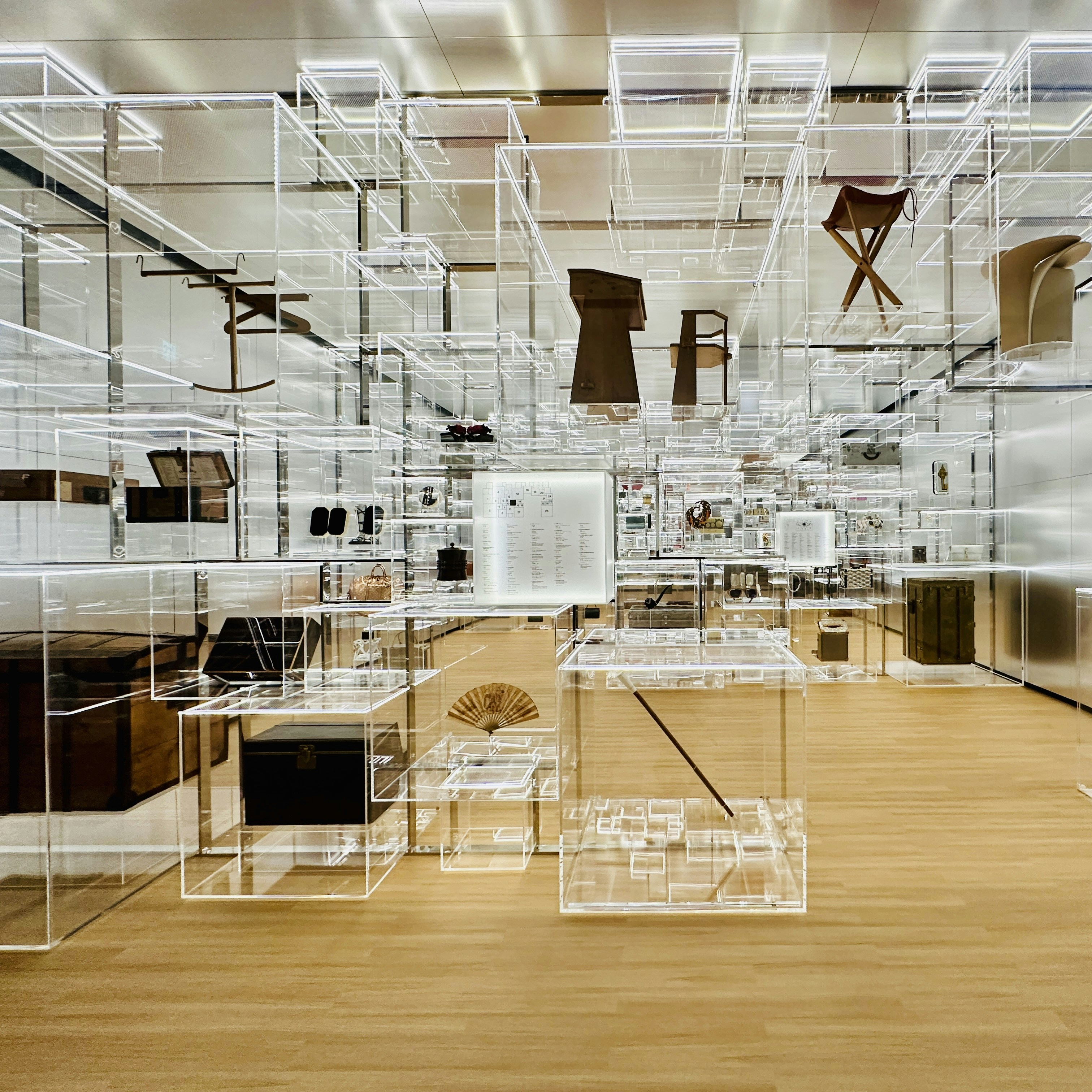 当初使用されていたポプラ材やブナ材は、やがて黒檀やマホガニー、メープル、チェリーといった銘木へと選択肢を広げていった。銅と鉄でつくられていたトランクの金属部品も、時代とともにアルミニウム、チタン、銅、亜鉛、そしてアルノックスやパラジウムといった上質な合金へと変化を見せている。キャンバスも、グリ ・ トリアノンからストライプ柄のトワル ・ レイエ、ダミエ ・ キャンバスへと変遷し、1896年にはモノグラム ・ キャンバスが誕生。自動車での移動が盛んになると、近代の過酷な旅に耐えられるようヴィトニット ・ キャンバスも開発されるなど、時代とともに絶えずアップデートされてきた。アクリルキューブが積み重なった空間は、そうした変遷を博物館のように提示している。