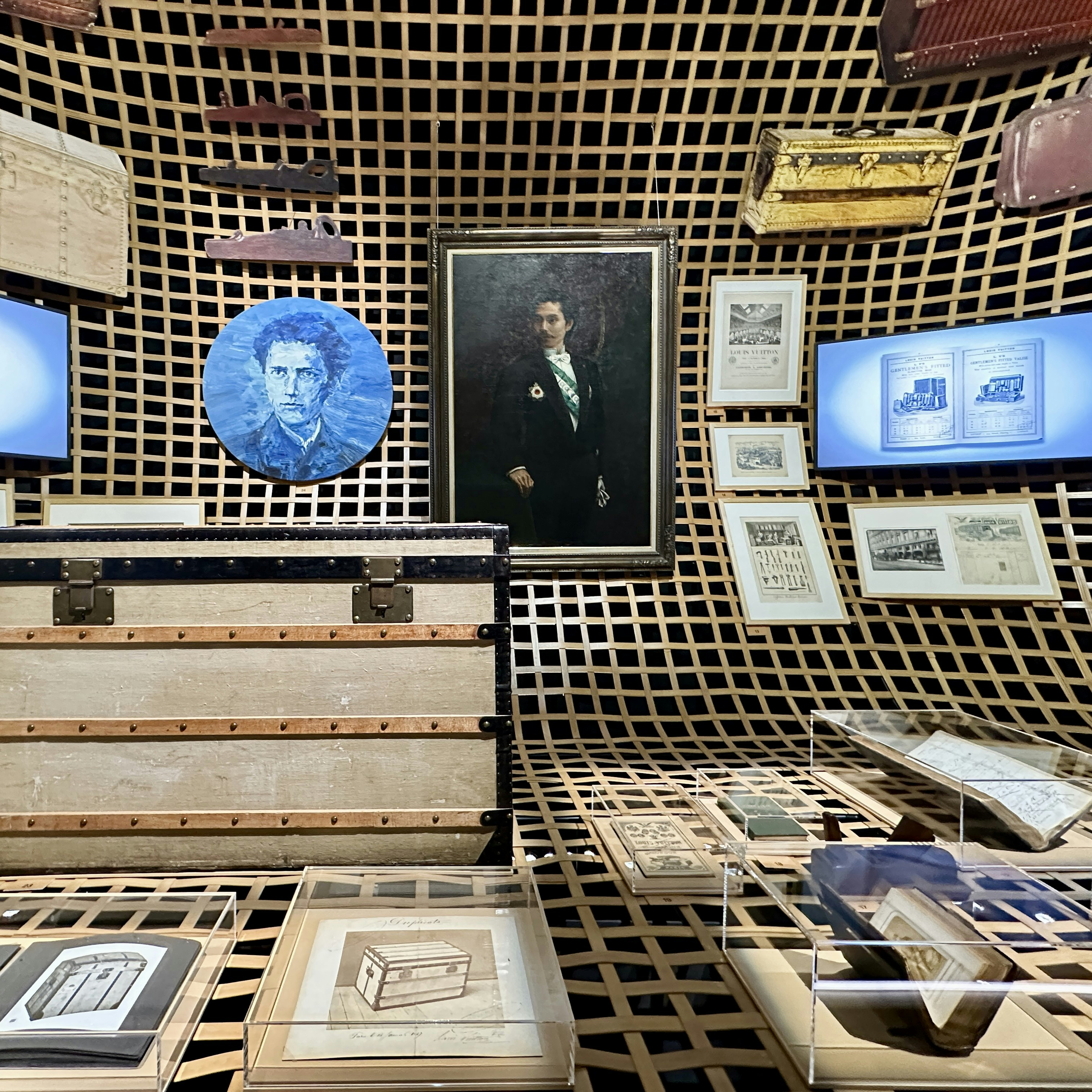 続く「原点」は、その名の通りメゾンの原点を紹介するもの。中心となるのはトランクやラゲージだ。ルイは、旅の移動手段や近代的なライフスタイルの変化を反映し、つねに革新的なアイテムを生み出してきた。蓋が平らなトランクや、こじ開けられない錠前、「スティーマー ・ バッグ」「キーポル」、ソフトタイプの旅行鞄などは、旅の概念すら変えていった。ここでは、最初の日本人顧客のひとりであった駐フランス特命全権公使・鮫島尚信(1845〜80)の肖像画など、ルイ・ヴィトンを語るうえで重要なエピソードなどがわかるアーカイブが、曲線を描く壁一面に広がる。