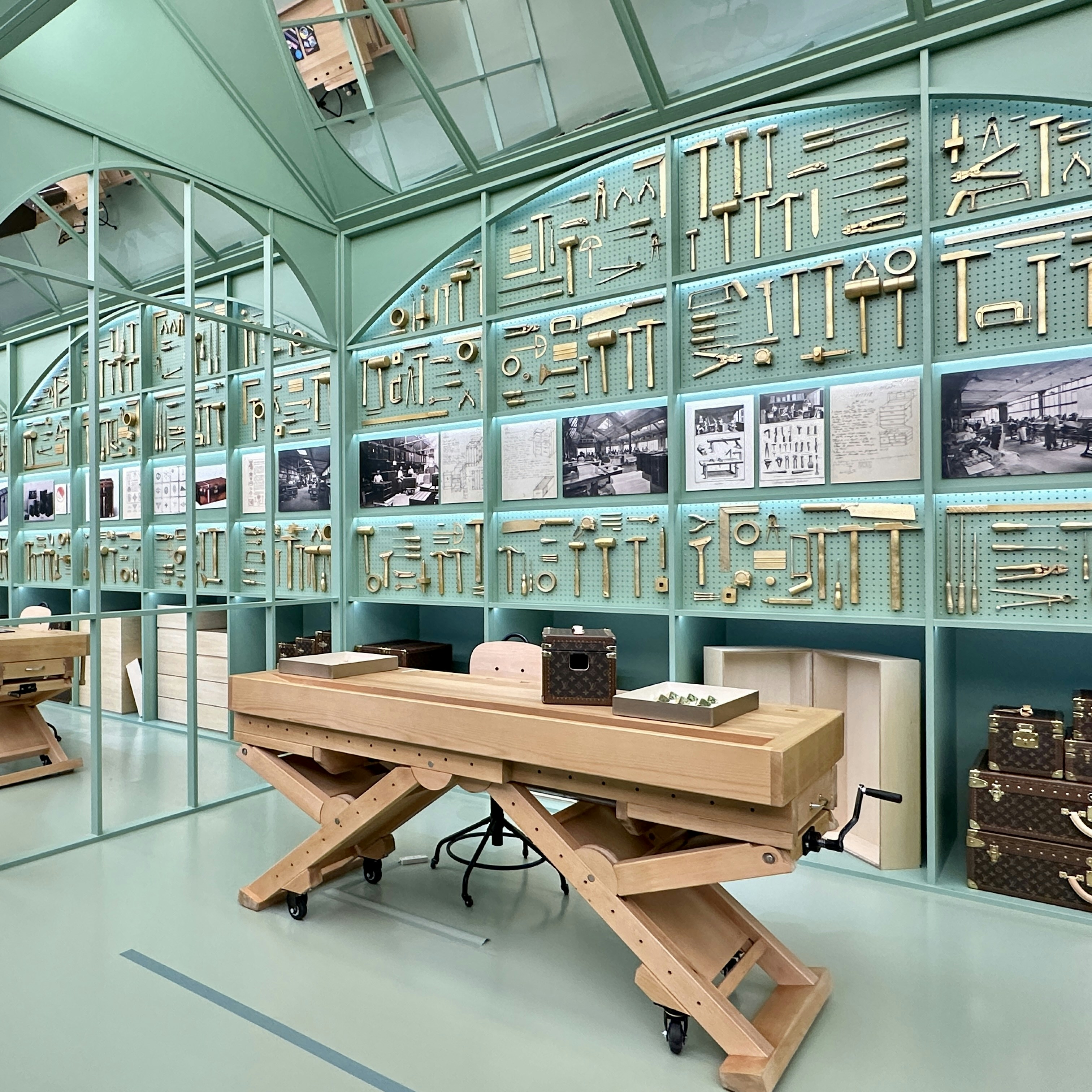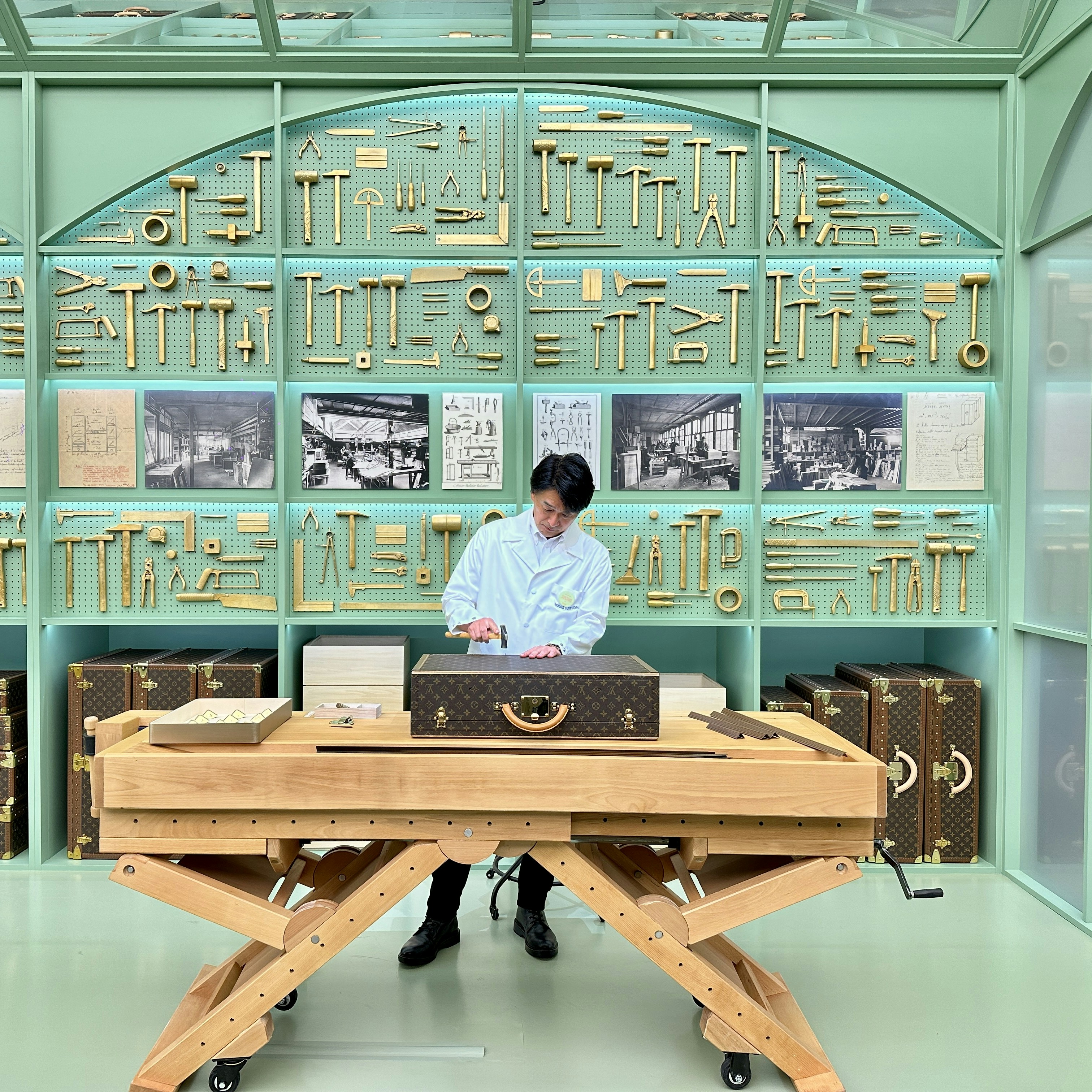 「アトリエ」セクションでは、実際に職人がデモンストレーションを行い、ルイ・ヴィトンのサヴォアフェール(匠の技)を伝える。このセクションでは、メゾンで欠かすことができないスペシャルオーダーについても触れられている。日本のダンスヴォーカルグループ「Number_i(ナンバーアイ)」のメンバーである平野紫耀は、2025年にメゾンのアンバサダーに就任。彼のために「ツールボックス ・ トランク」が製作された。また、大阪出身のアーティスト・VERDYがデザインを施したトランクもここで見ることができる。