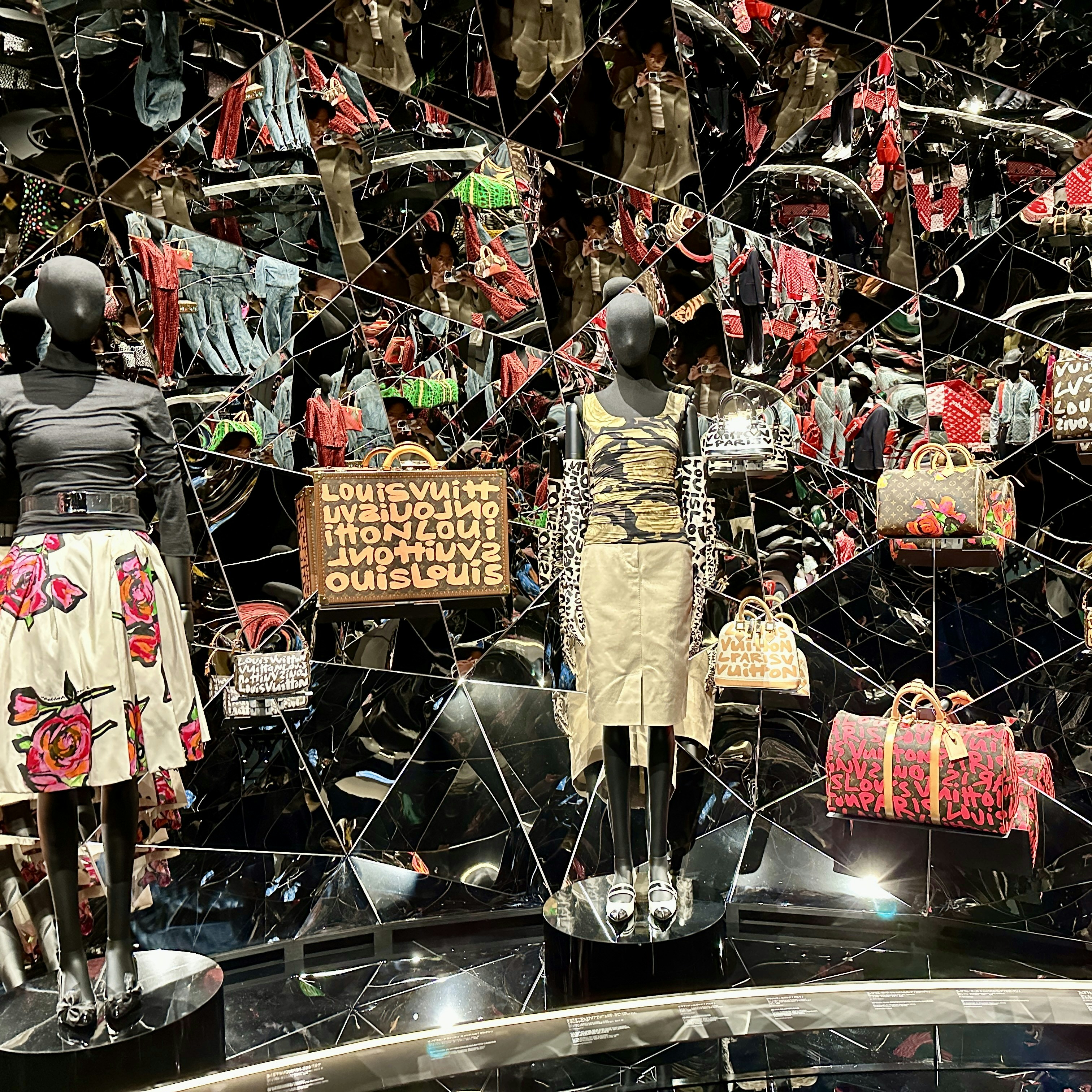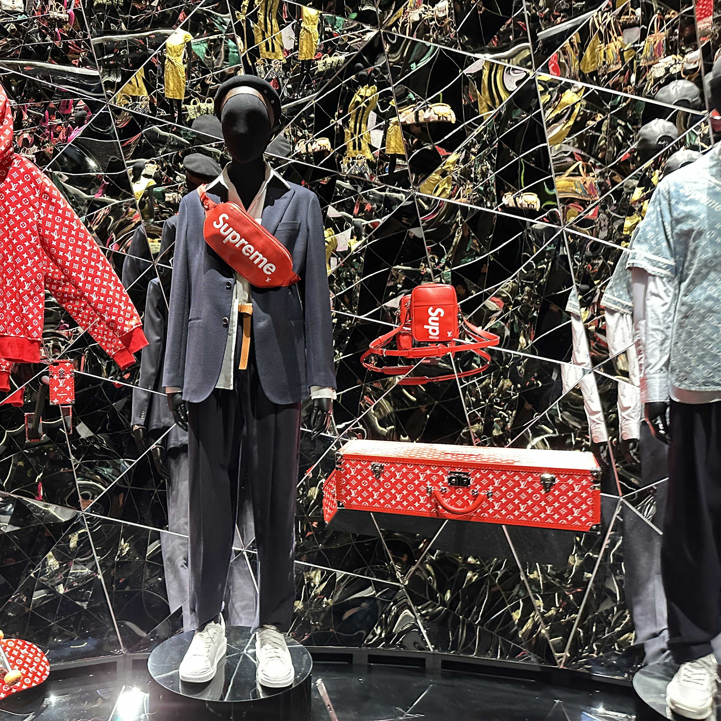 いっぽう、キム・ジョーンズは17年にシュプリームとコラボ。ラグジュアリーとストリートウェアという前代未聞の出逢いを実現させた。こうしたコラボレーションの結実が、天井まで鏡で覆われた無限に広がる空間に凝縮している。