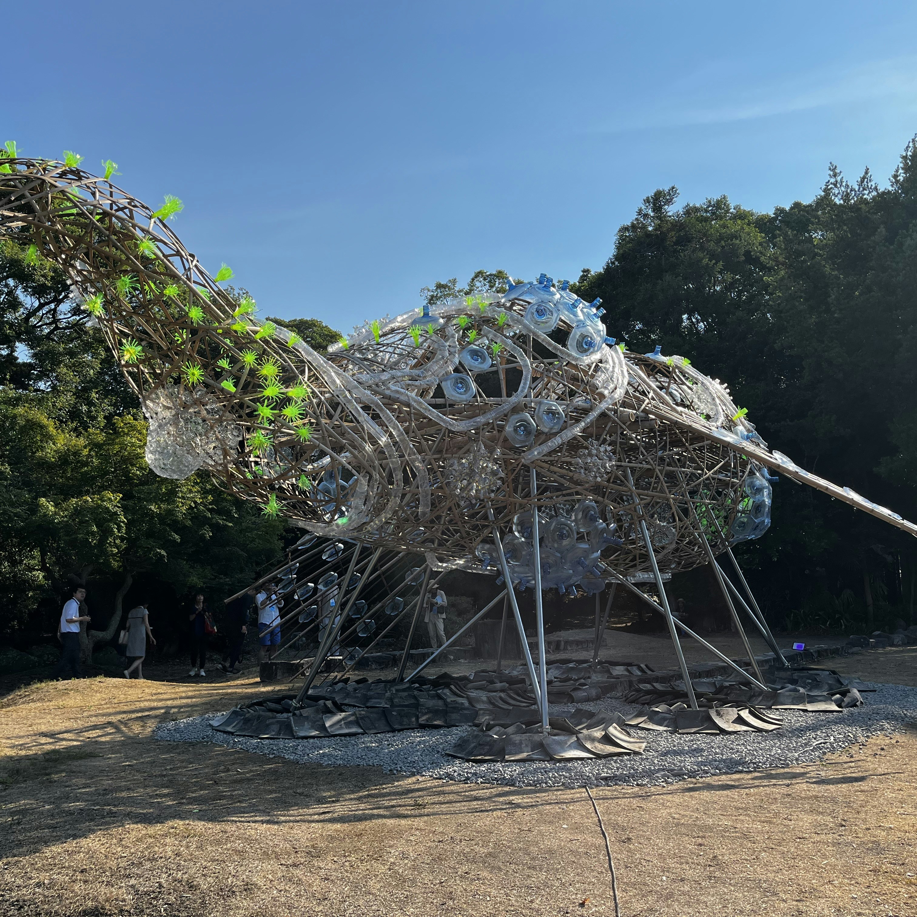 まずは志度エリアから見ていきたい。志度寺の庭園には、フィリピン出身のリーロイ・ニューによる巨大なオブジェが出現した。これは、フィリピン神話に登場する船「メブヤン」をモチーフとしたもので、素材は普段我々が排出するペットボトルなどのゴミを再利用するかたちで活用されている。リーロイによると、ゴミの排出量はフィリピンでも大きな問題となっており、自身の国の未来に思いを馳せながら制作にあたったという。