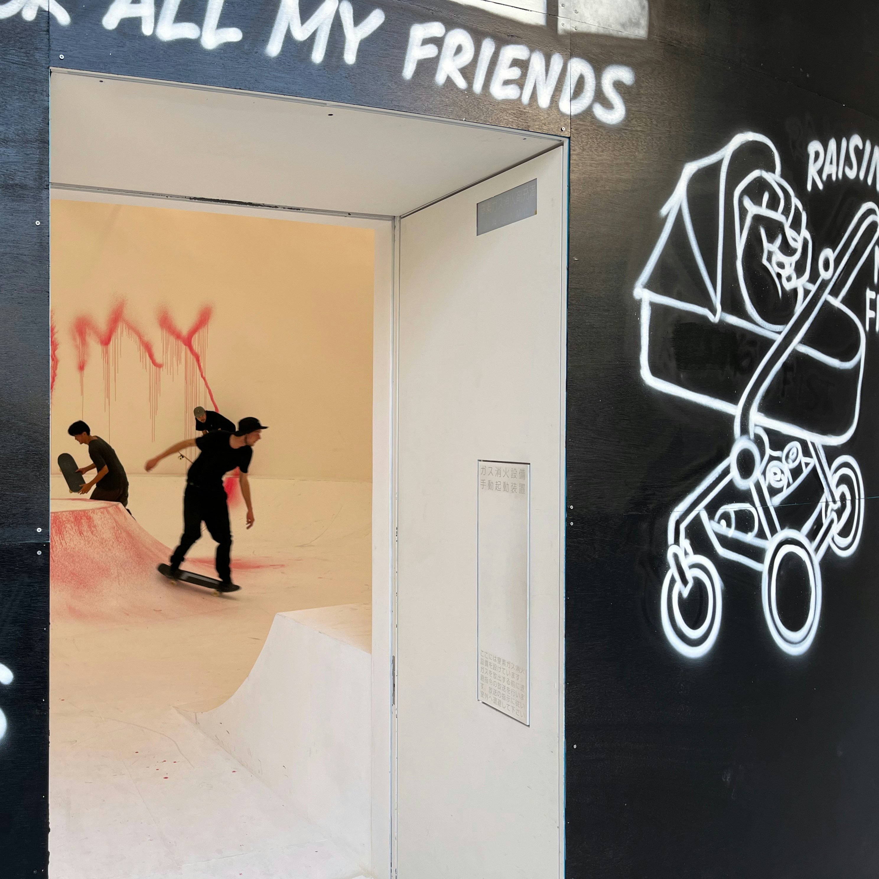 なお、この空間は現状、開場時間の最後の1時間、実際にライダーたちがスケートボードを持ち込んで滑ることができるようにするという。森田は次のようにも述べた。「スケートをしているとケガをするし、滑る場所もつねに変わるし制限もされる。だからスケーター同士は当たり前のように助け合うし、友達と仲良くすることこそが一番大事だということをよくわかっている。世界中で悲惨なことが起こっているけど、スケーターである我々は、当たり前だけど大切なことを実践している」。
