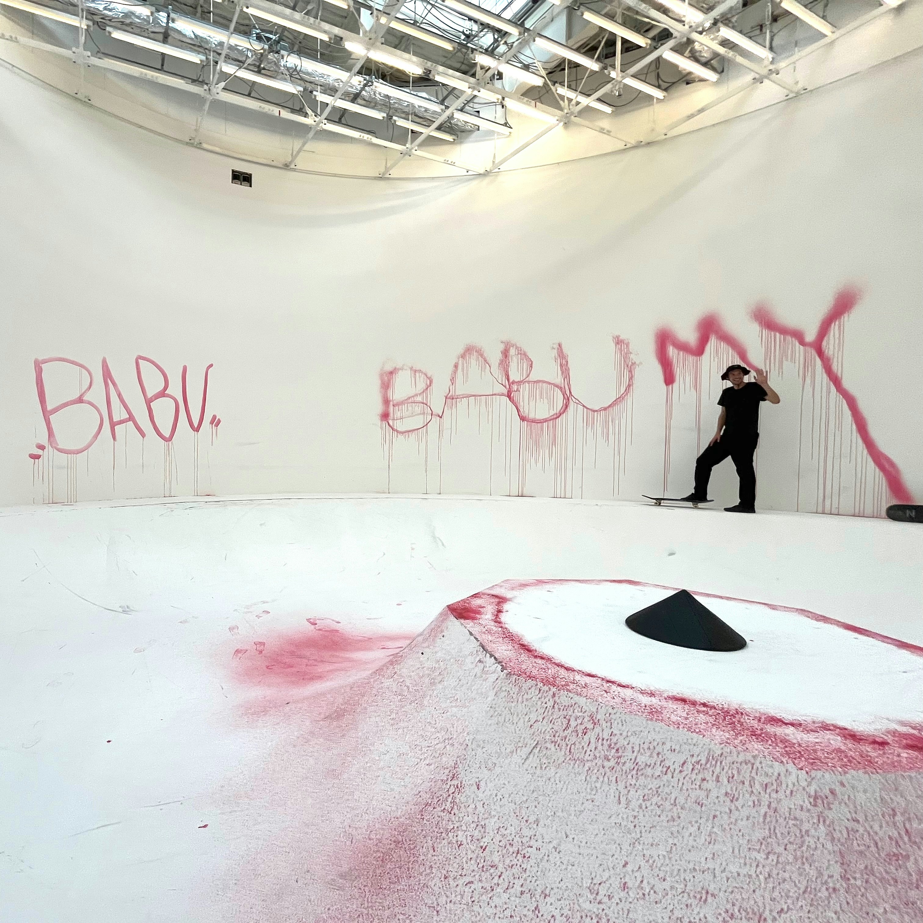 ストリートスケートを続けてきた森田は「自分たちが楽しむための場所を、自分たちでつねにつくり続けてきた」と語る。当初、遠近感がわからないほどの真っ白な空間だったこの空間は、何時間ものライドを経て黒い汚れがつき、立体性を獲得した。さらに壁面には森田の友人であるBABUが、自らのタグネーム「BABU」をグラフィティとして残す。BABUは自らのタグネームを残すことはほとんどないというが、あえてそのスタイルを崩したのは、森田の晴れ舞台に刻む友情の証ともいえるだろう。