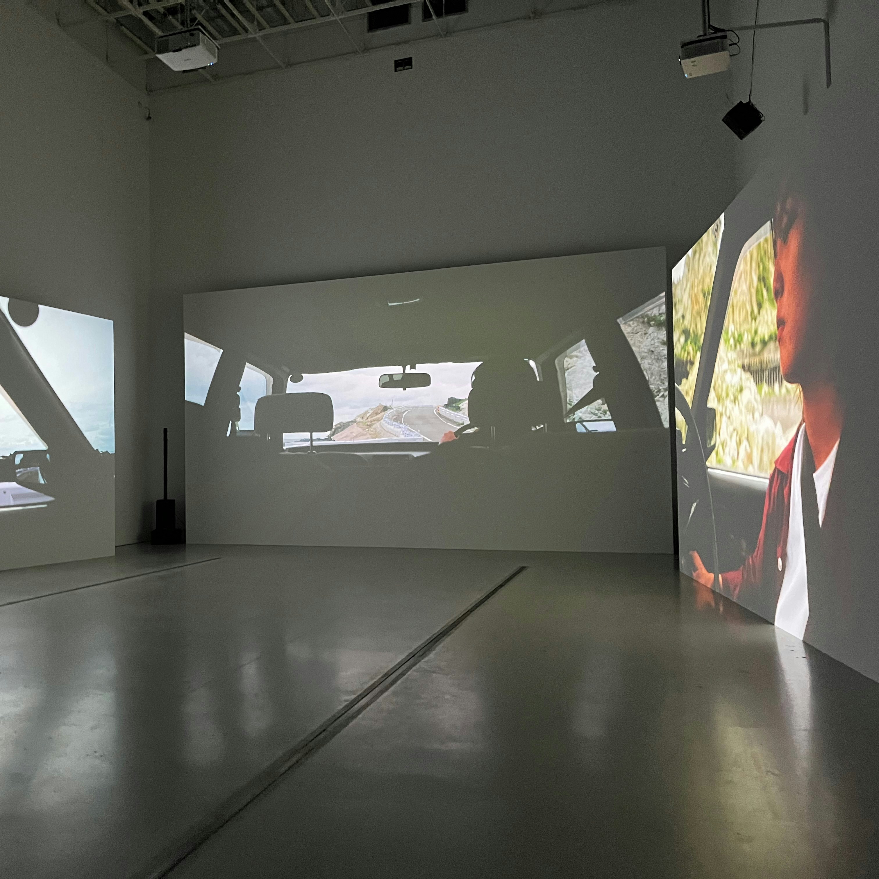 映像作品の《living road》は東京から能登半島へ向かう旅を写した映像作品だ。映像は4章構成で、各地の風景や出来事を記録し、高速道路から国道、旧道、そして能登の迂回路へと移り変わっていく。作品の主題は「道(ストリート)」そのものであり、土地の人々や文化と呼応しながら表情を変える道が、場所の持つアイデンティティを問いかける。
