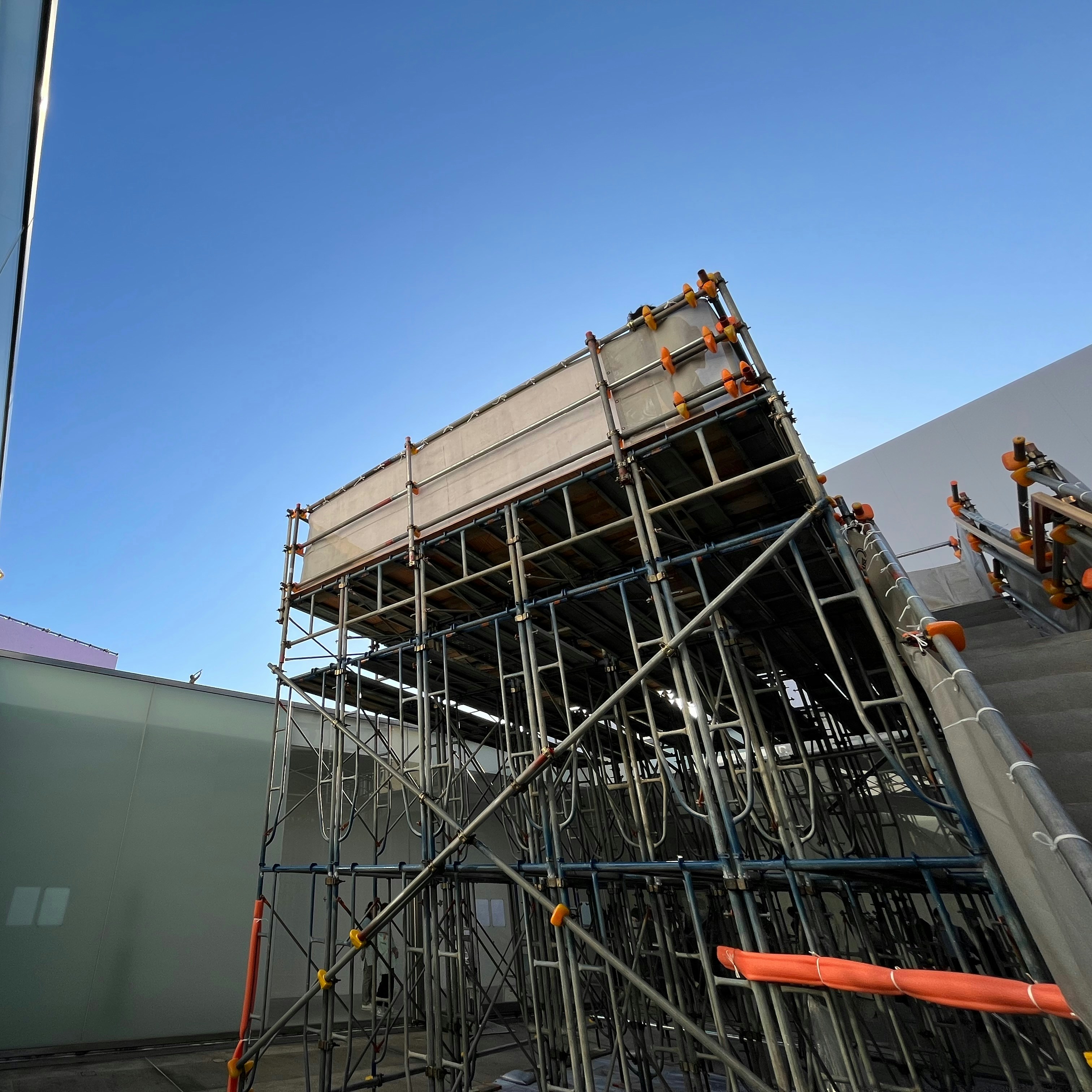 本作は、美術館の屋上に置かれたモニターで上映され、中庭に組まれた足場を上まで登ることで本作を見ることができる。ちょうど隆起した海底と同じくらいの高さである4メートルの足場からは、本作とともに金沢21世紀美術館のいつもとは異なる表情も見ることが可能だ。