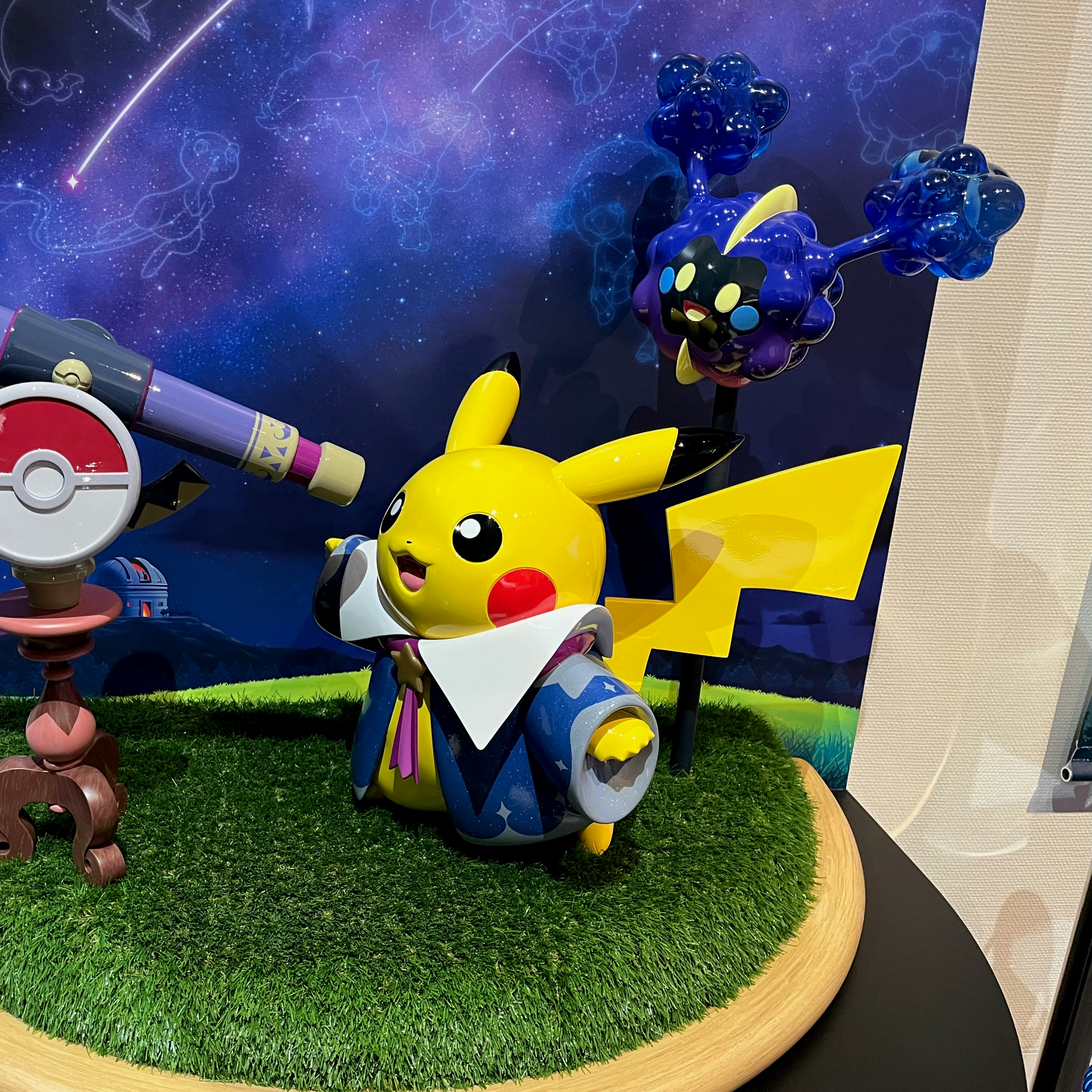 本展は地球から宇宙、そしてまた地球へと返ってくる、プロローグと5章での構成となっている。プロローグ「ポケモン天文台へようこそ」では、望遠鏡をのぞくピカチュウと、ガス状の体を持ち、光を吸収するという宇宙との関係性を想起させるポケモン「コスモッグ」のフィギュアが置かれており、来場者の気分を盛り上げる。そして、第1章「天文台から宇宙へ」は導入として、地上の天文台から宇宙の不思議に向かう旅をポケモンたちとイメージする映像を上映することで、展覧会の大まかな構成意図を知ることができる。