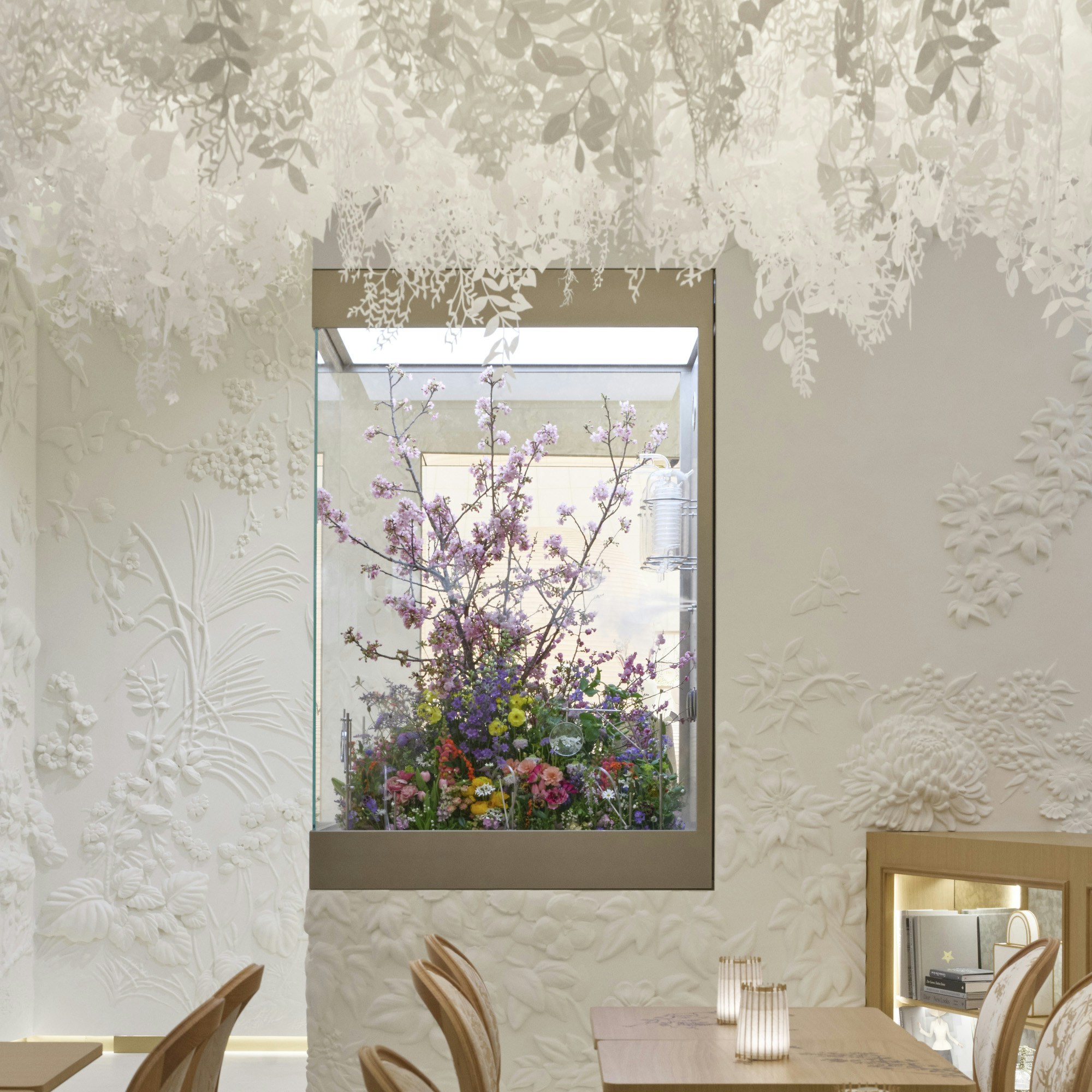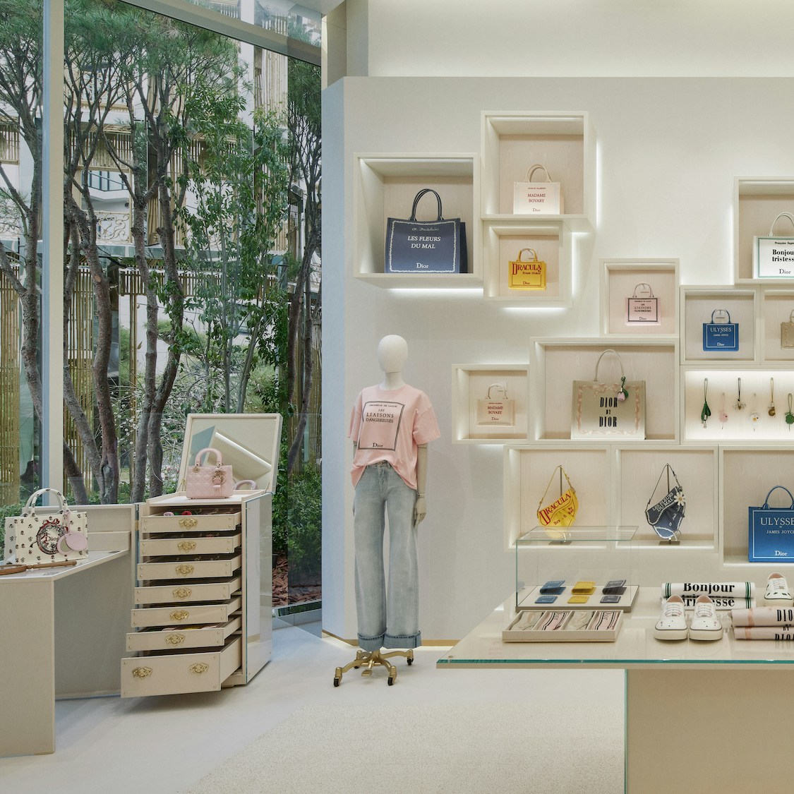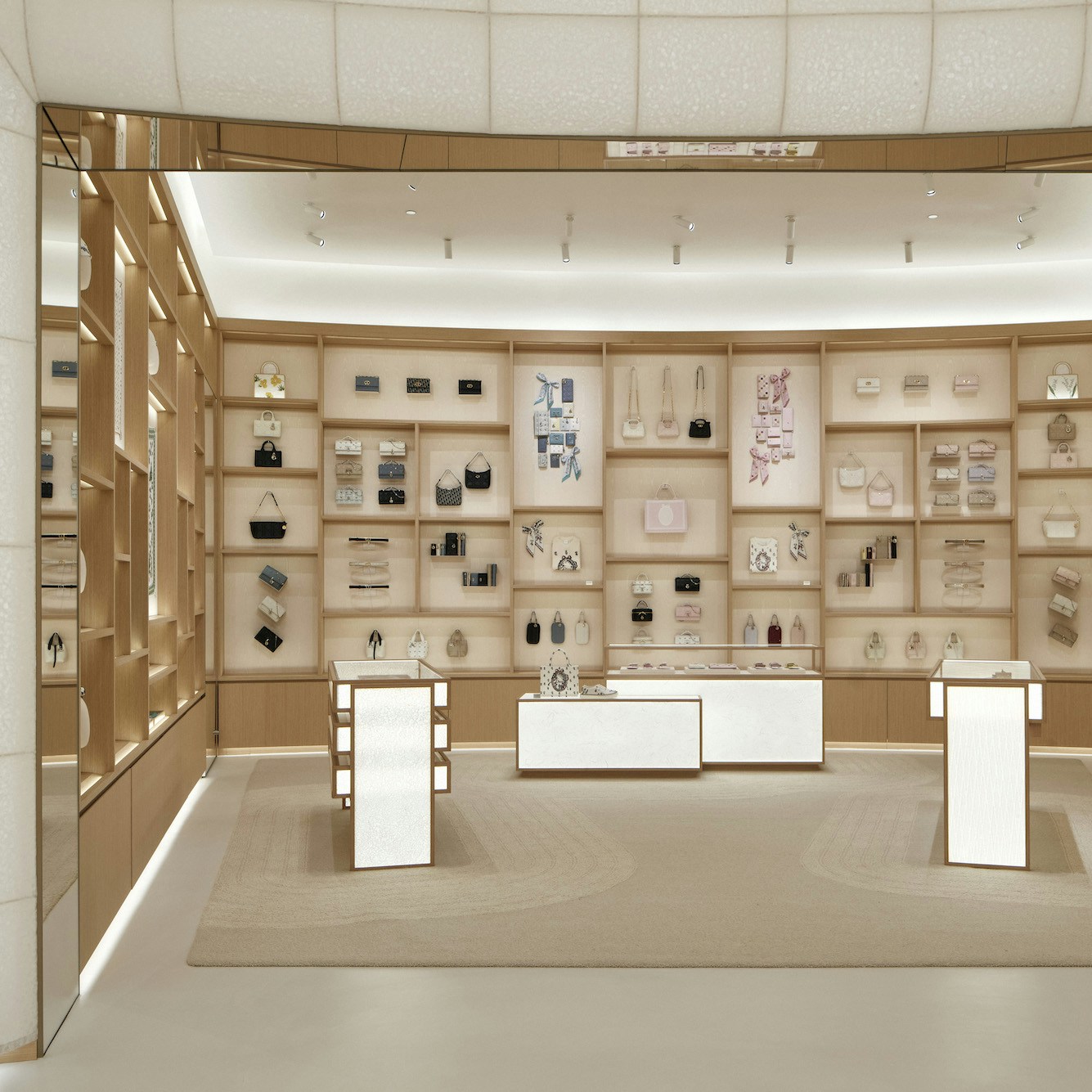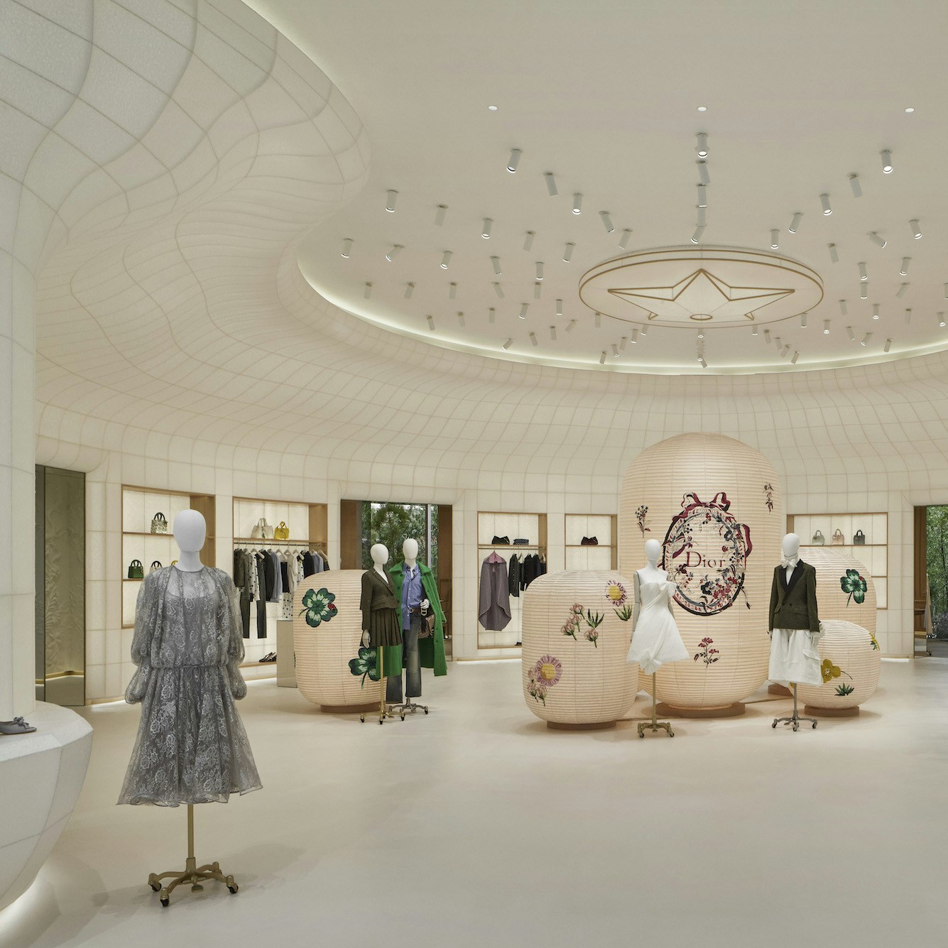 広々とした内部では、和紙による壁面仕上げや、寄木細工の床、提灯状に造形された「レディ ディオール」バッグのモチーフなど、メゾンのコードと日本的意匠が交差する。