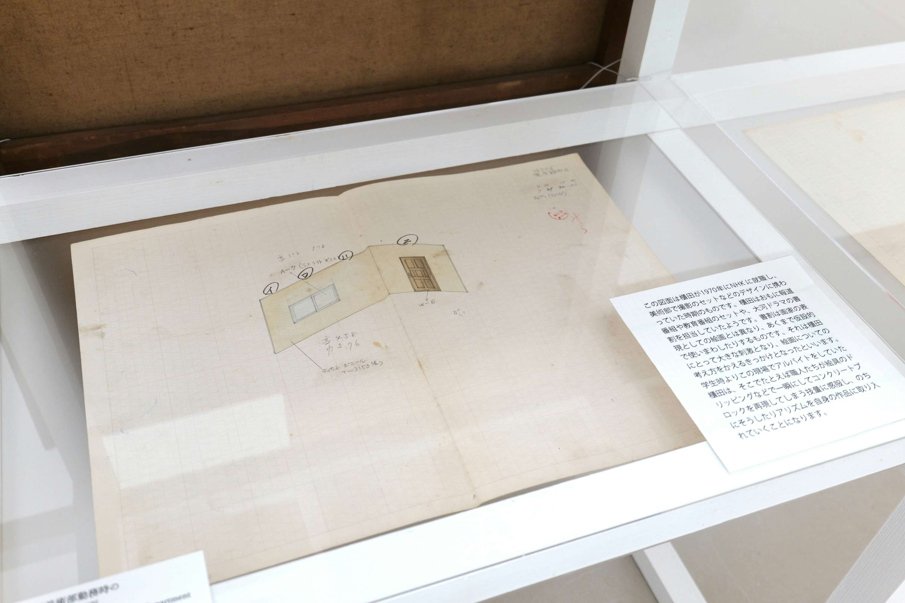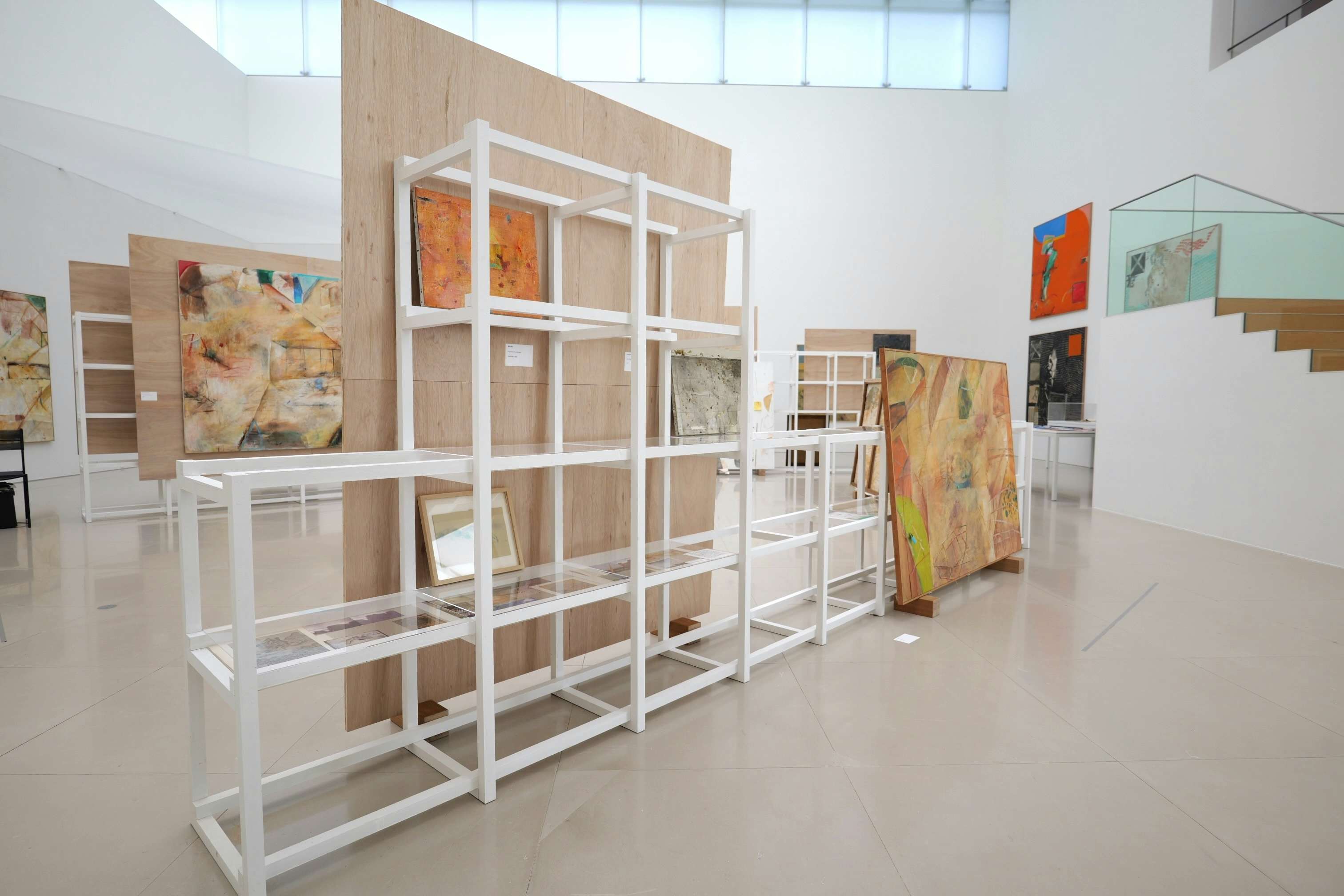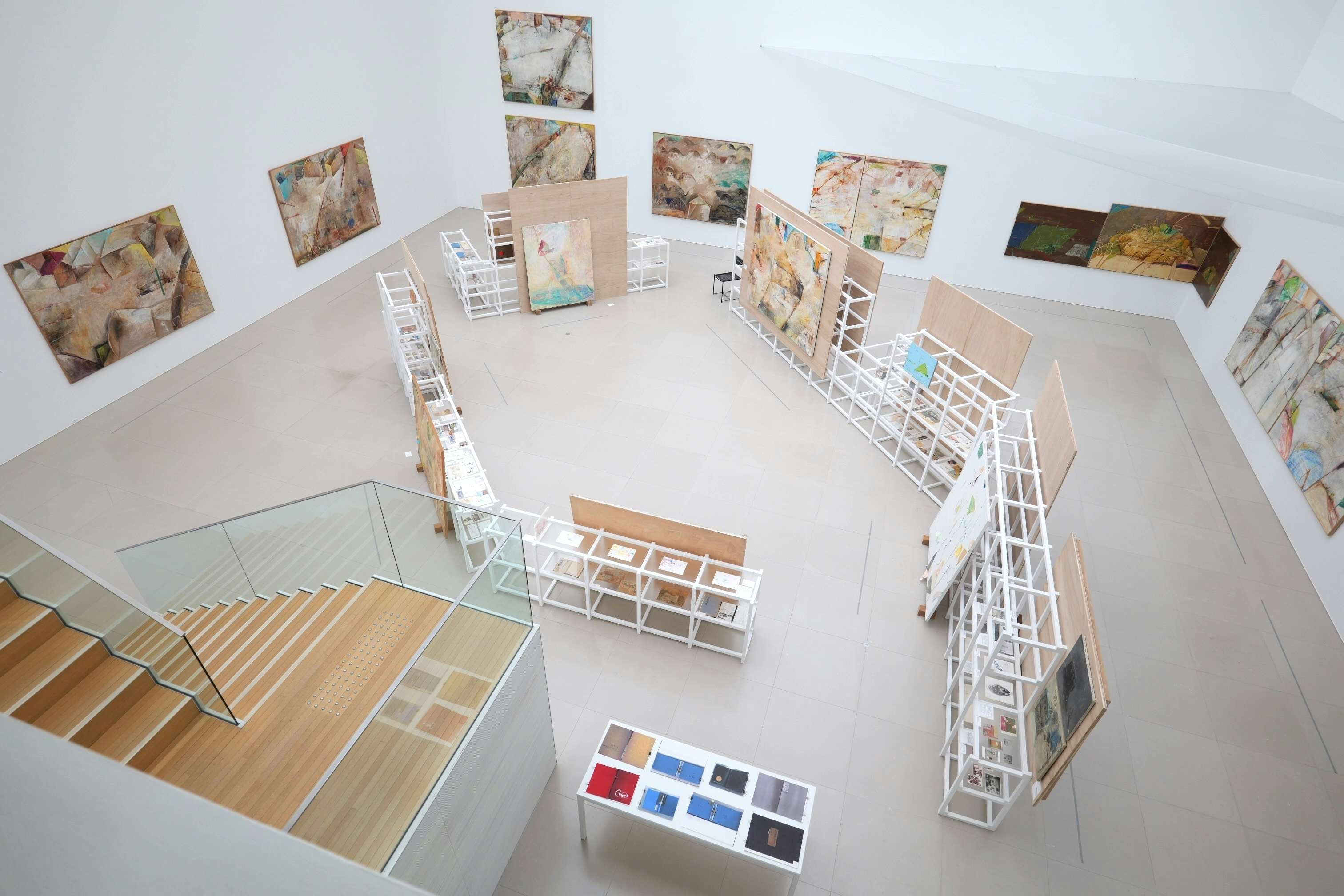 室内へ戻る階段から見下ろした展示室1 本展は、最後に階段を下り、第1展示室に戻ってくることになる。展覧会を通して櫃田の画歴の変遷を辿った鑑賞者は、この空間の展示物をより文脈のなかに位置づけながら振り返ることができるだろう。00年以降の水を感じさせる「青」がわずかながらも初期作品から表れていること、近年の作品の揺らいだ線が、3歳の頃描いた線と連関すること、あるいはスクラップされた断片的なイメージがロジカルに統合されていたこと。円環のように、絵を描くことについての思索が、櫃田の後を追うように、鑑賞者のなかでも始まることになる。
