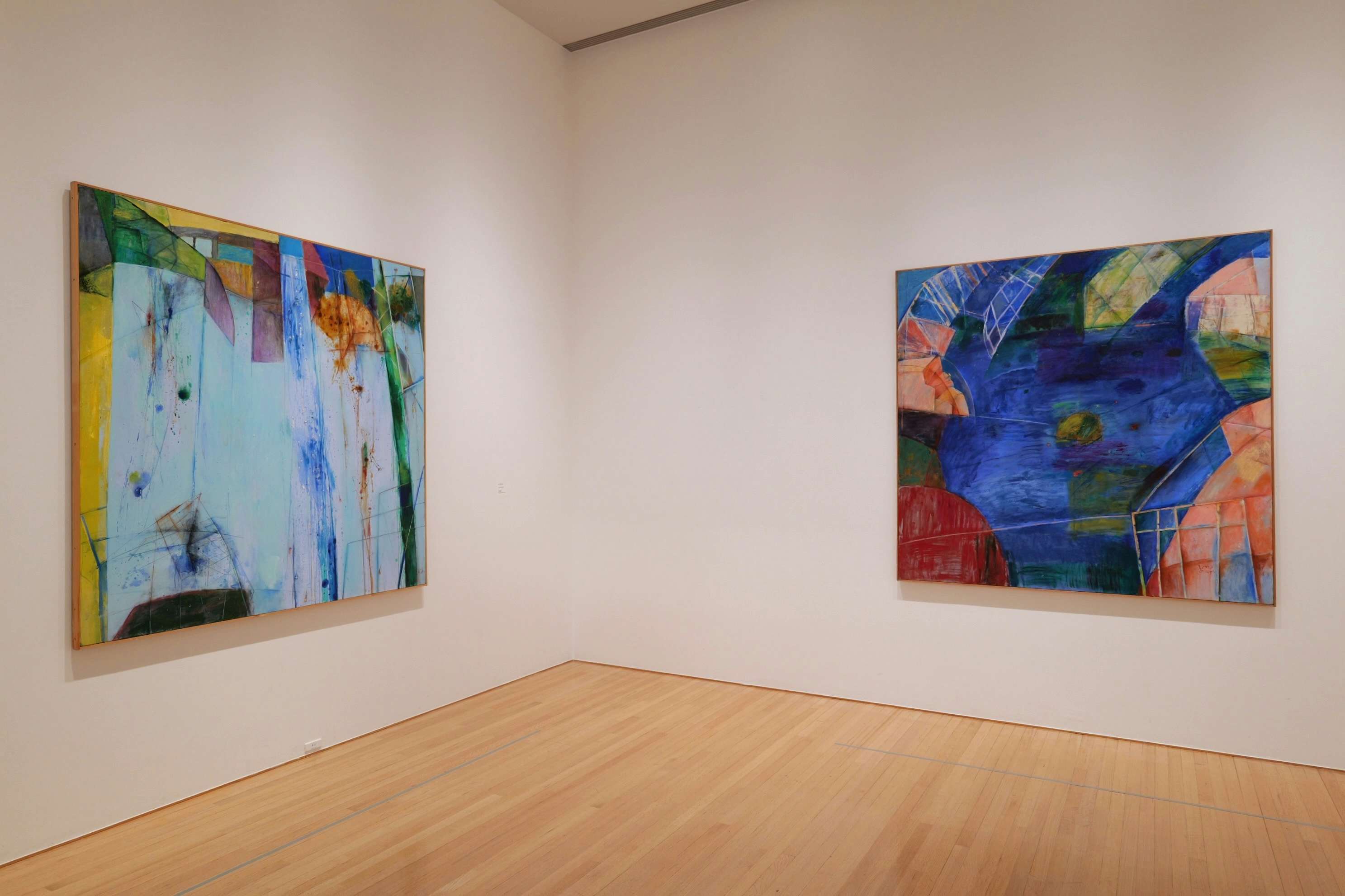 左から《通り過ぎた風景》(1991-1993)、《通り過ぎた風景》(1992-93)。 展示室3には、2000年以降の作品が並ぶ。90年代より櫃田の絵画には青色が目立つようになり、場合によっては旧作に青を描き加えることもあったという。これらは櫃田がスクラップして新聞記事を集めていた水害のニュース、あるいは「愛・地球博」に向けた開発が進む長久手で頻繁に見られた工事用のブルーシートのイメージを投影している可能性が指摘されている。