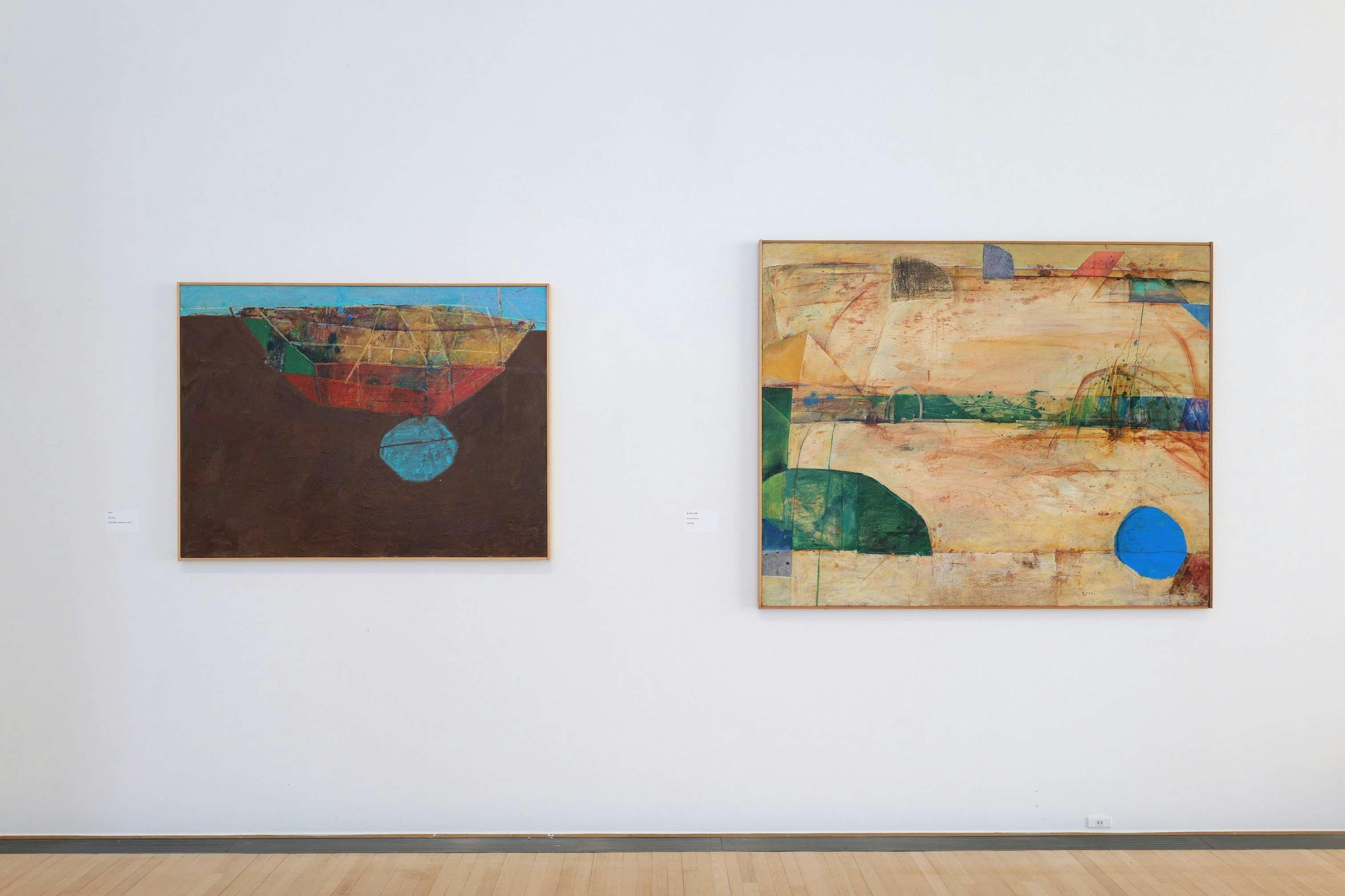 左から《筏(舟)》(2015加筆)と《通り過ぎた風景》(1993/2008)。いずれも円状の青が主張する