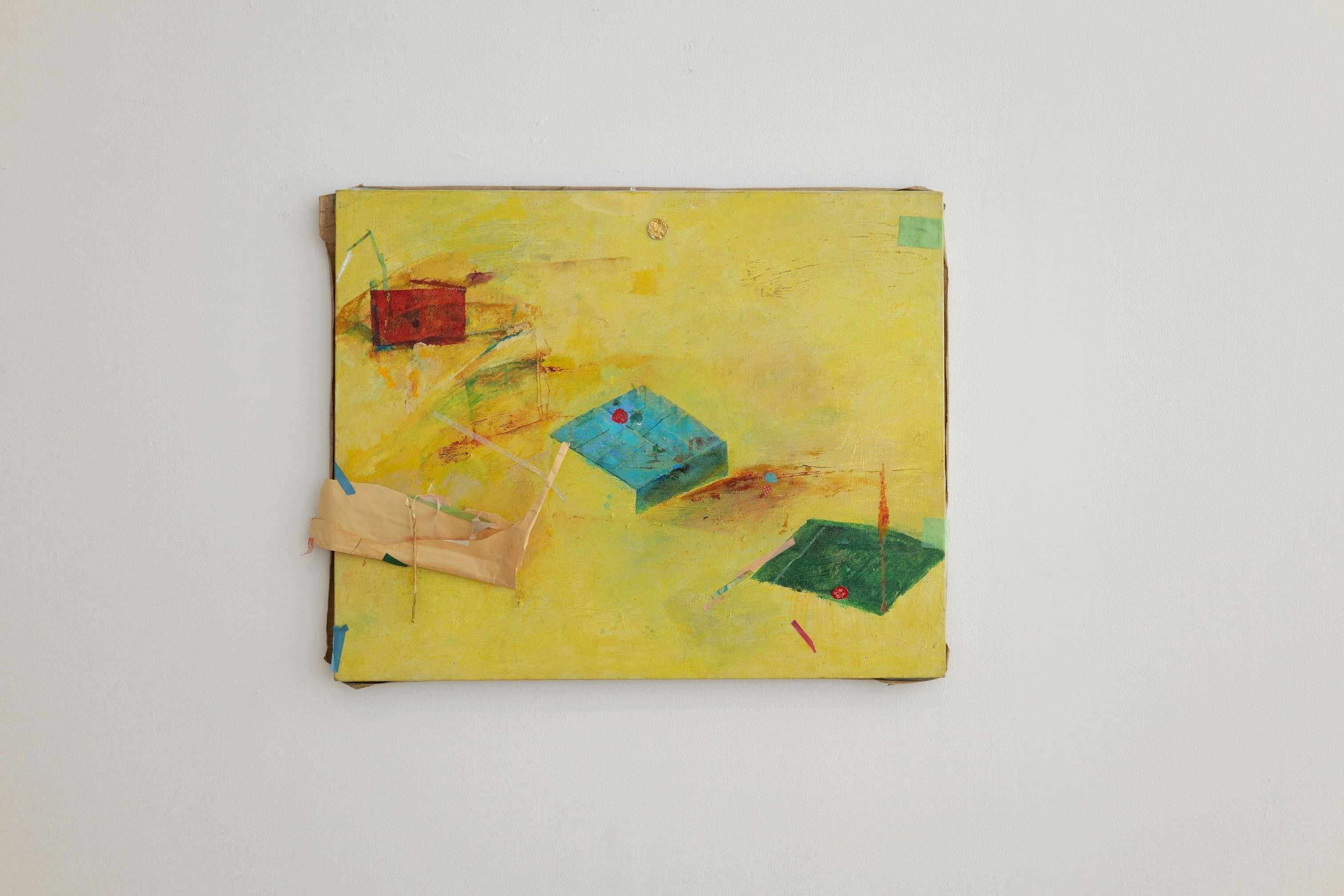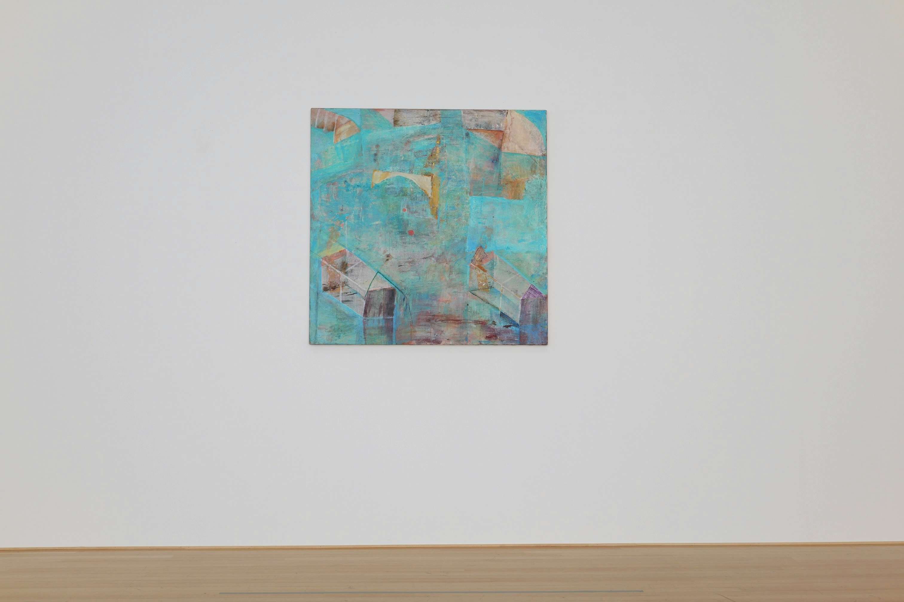 青を基調に構成された《箱》(2003-19)。水色を基調に家を思わせるモチーフが描きこまれており、洪水のイメージを想起させる また、鈴木はこうした青のイメージと、櫃田が生まれ育った東京の多摩川沿いの風景との関連性にも言及している。画歴60年に及ぶ、櫃田の描く風景ないしは山水の連なりがどこに向かおうとしているのか、外光が入り込むこの展示室でじっくりと考えることができる。