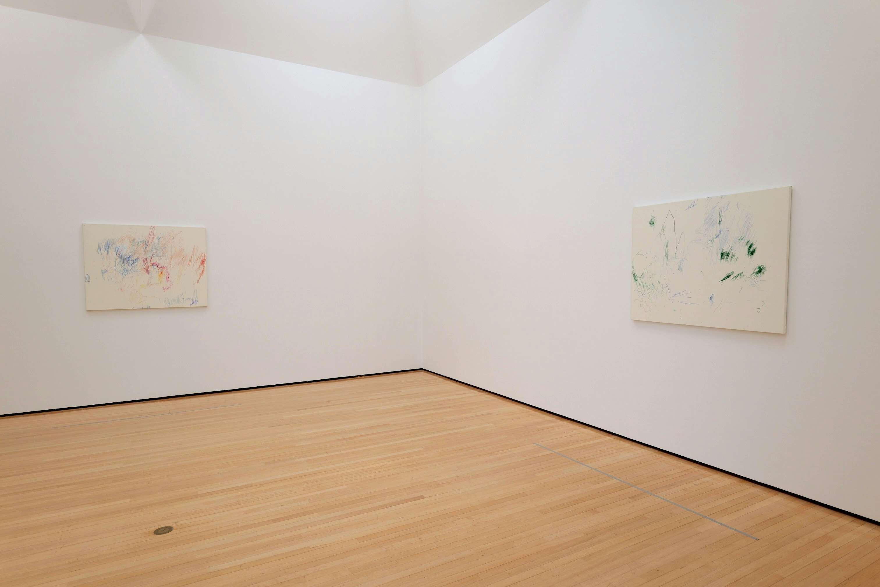 櫃田は2008年頃より症状が現れたパーキンソン病のために徐々に体の自由が効かなくなるなか、それでも腕を動かして制作を続けた。展覧会準備中にも新作が登場し、これらを展示しているのが最後の展示室2だ。自由に手が動かせないがゆえの揺らいだ線ながらも、その描線は山、あるいは水をイメージさせるものとなっており、ここにいまの櫃田が見ている「風景」ないしは「山水」を見て取ることができるだろう。