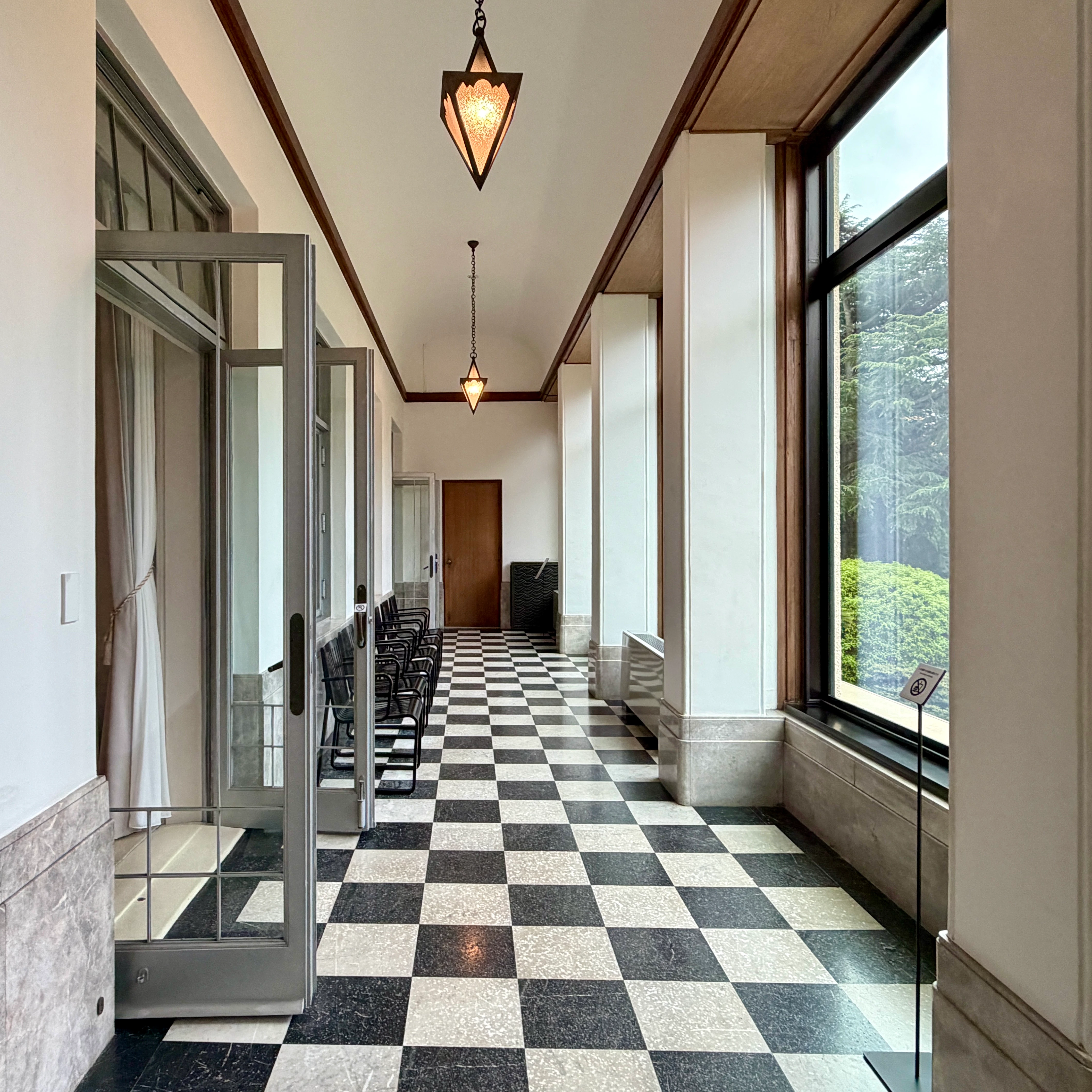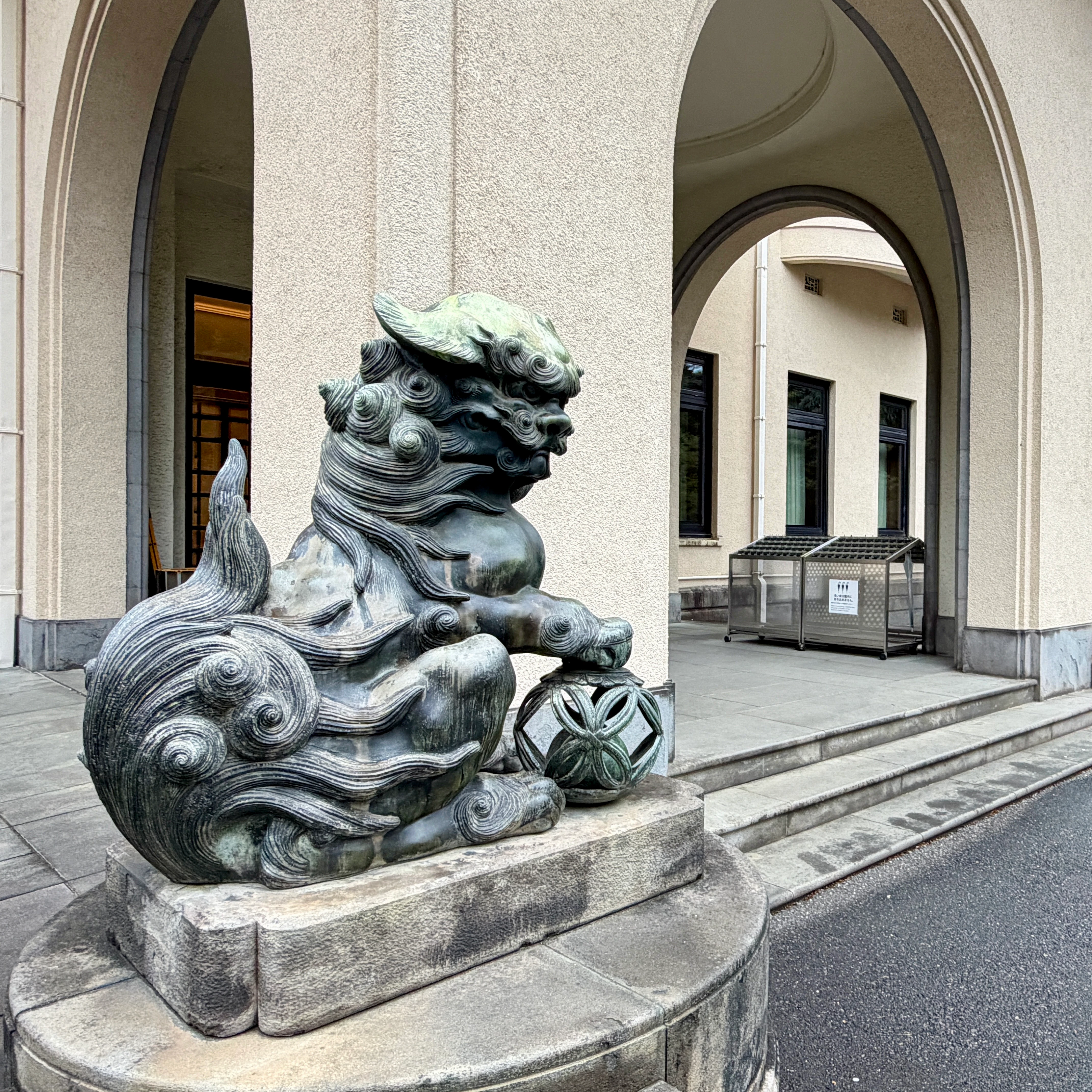 まず来館者を迎えるのは、玄関に鎮座する鉛青銅の唐獅子だ。この一対の唐獅子は、朝香宮家が高輪南町御用邸(現在のグランドプリンスホテル高輪周辺)に住んでいた頃から所有していたもので、朝香宮夫妻が店先で気に入り購入したものだという。白金台へと引っ越す際に、いまの位置に設置された。