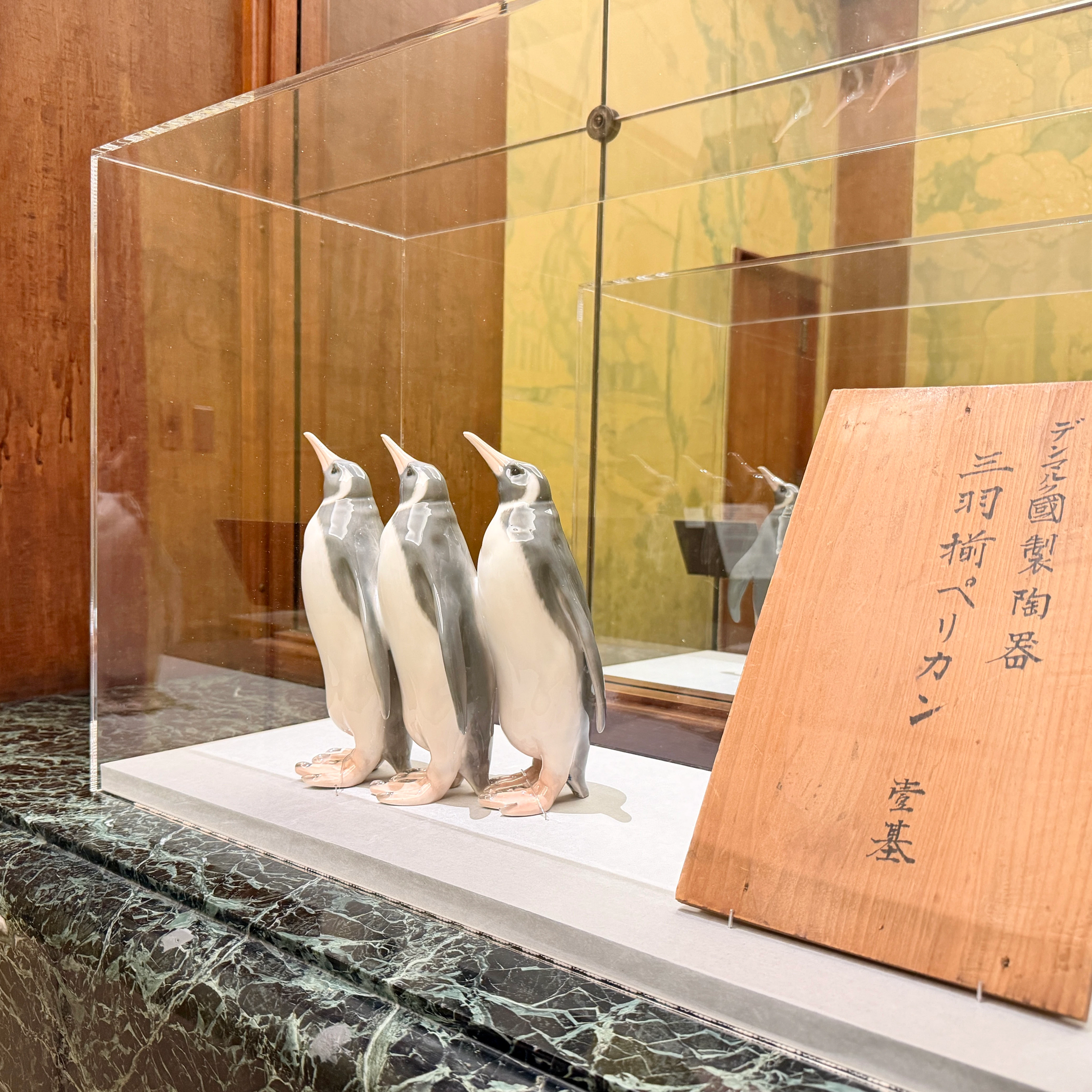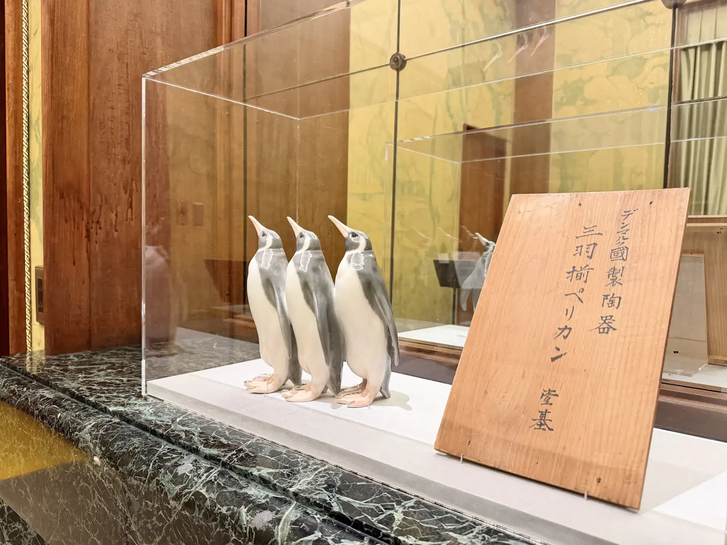思わず笑みがこぼれるのが、次室に佇むペンギンの陶磁器だ。朝香宮鳩彦王・允子妃が1920年代に滞欧した際にが購入したロイヤル・コペンハーゲン製のもの。収納箱の蓋は夫妻の帰国後に製作されたとされており、ペンギンではなく「丁抹國製陶器 三羽揃ペリカン」と書かれている。これは当時の日本ではペンギンの存在が一般的ではなく、長いくちばしなどの特徴から、ペリカンと間違って記されたためだという。未知の動物をどうにか既存の知識に当てはめようとした、当時の日本人の初々しい眼差しが透けて見えるようだ。