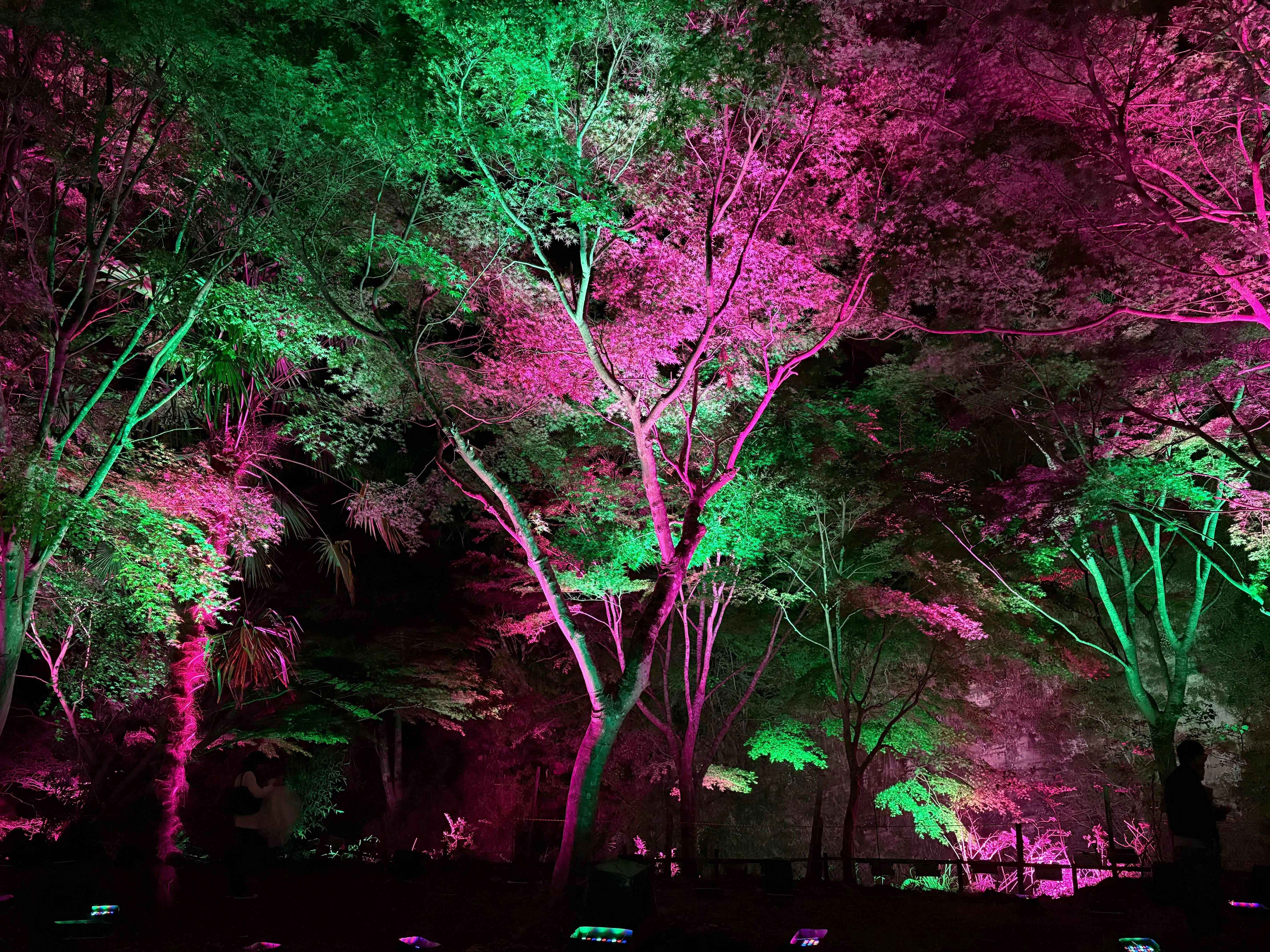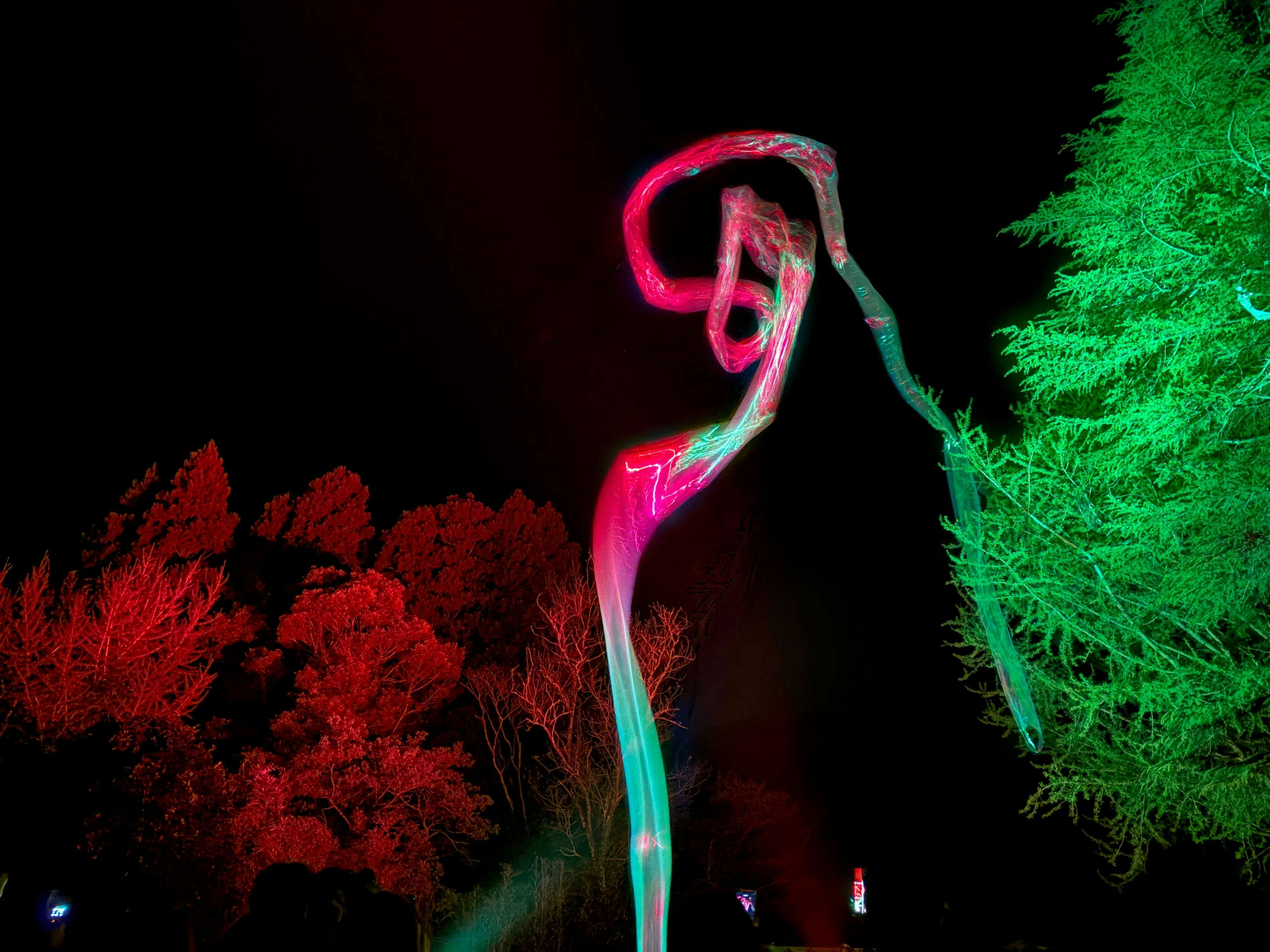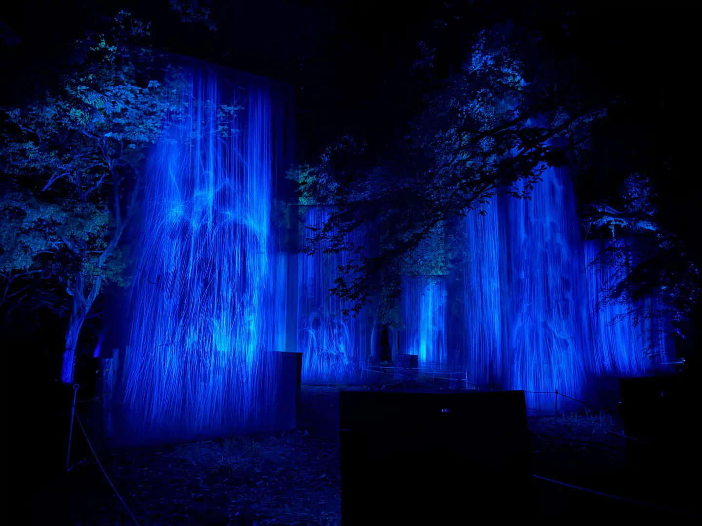 《呼応する養老渓谷と森》(2026)は、夜の森を光と音で構成した作品だ。人や生物が通るたびに、その色や音が変化する仕組みになっている。チームラボは自然の造形をそのまま作品として扱うため、自然物に直接手を加えることはせず、光と音を用いてその知覚を変化させていく。他者の動きに反応して空間が変化する本作では、他者とその場を共有しながらともに作品をつくり上げる感覚をもたらす。
