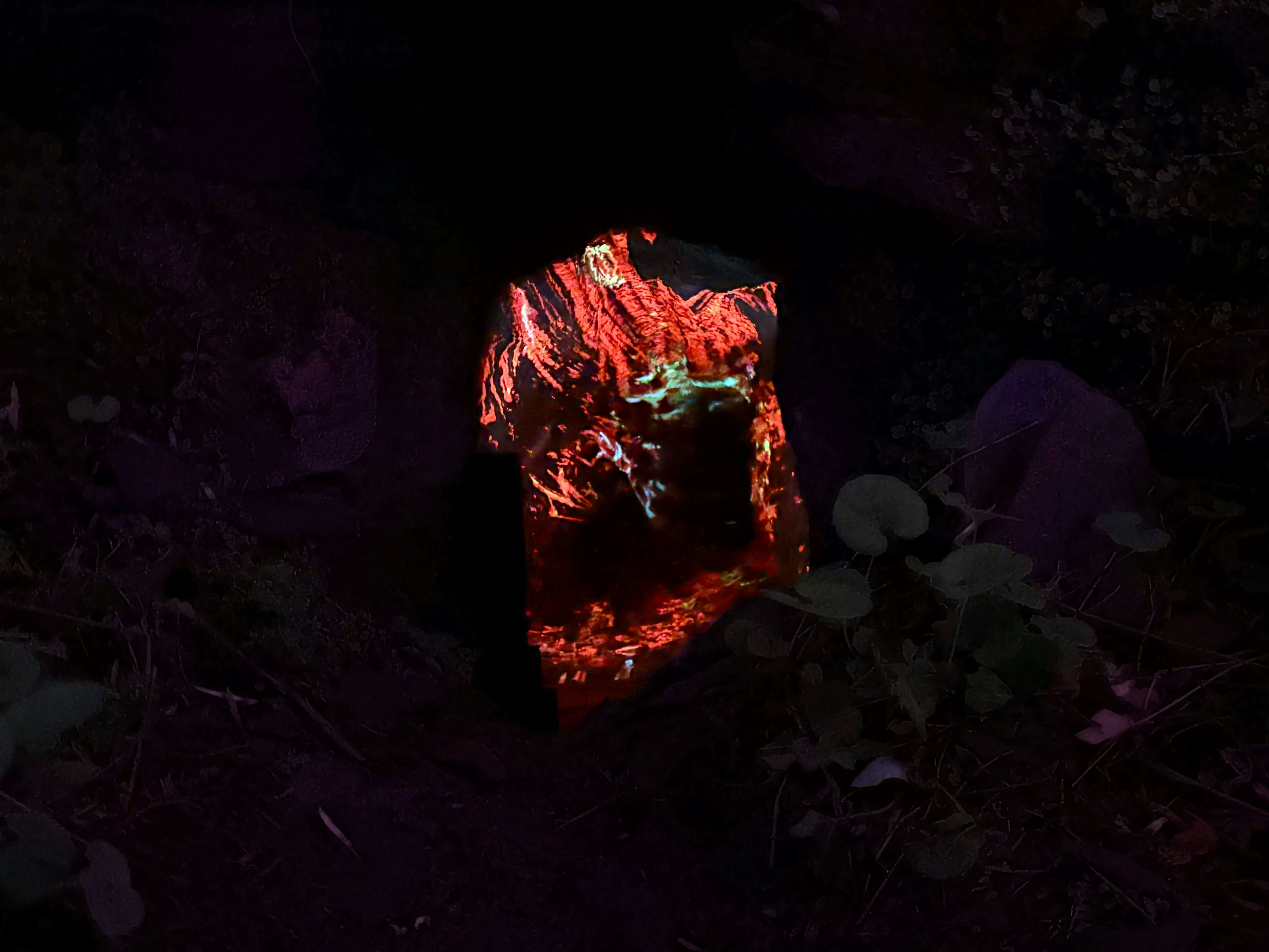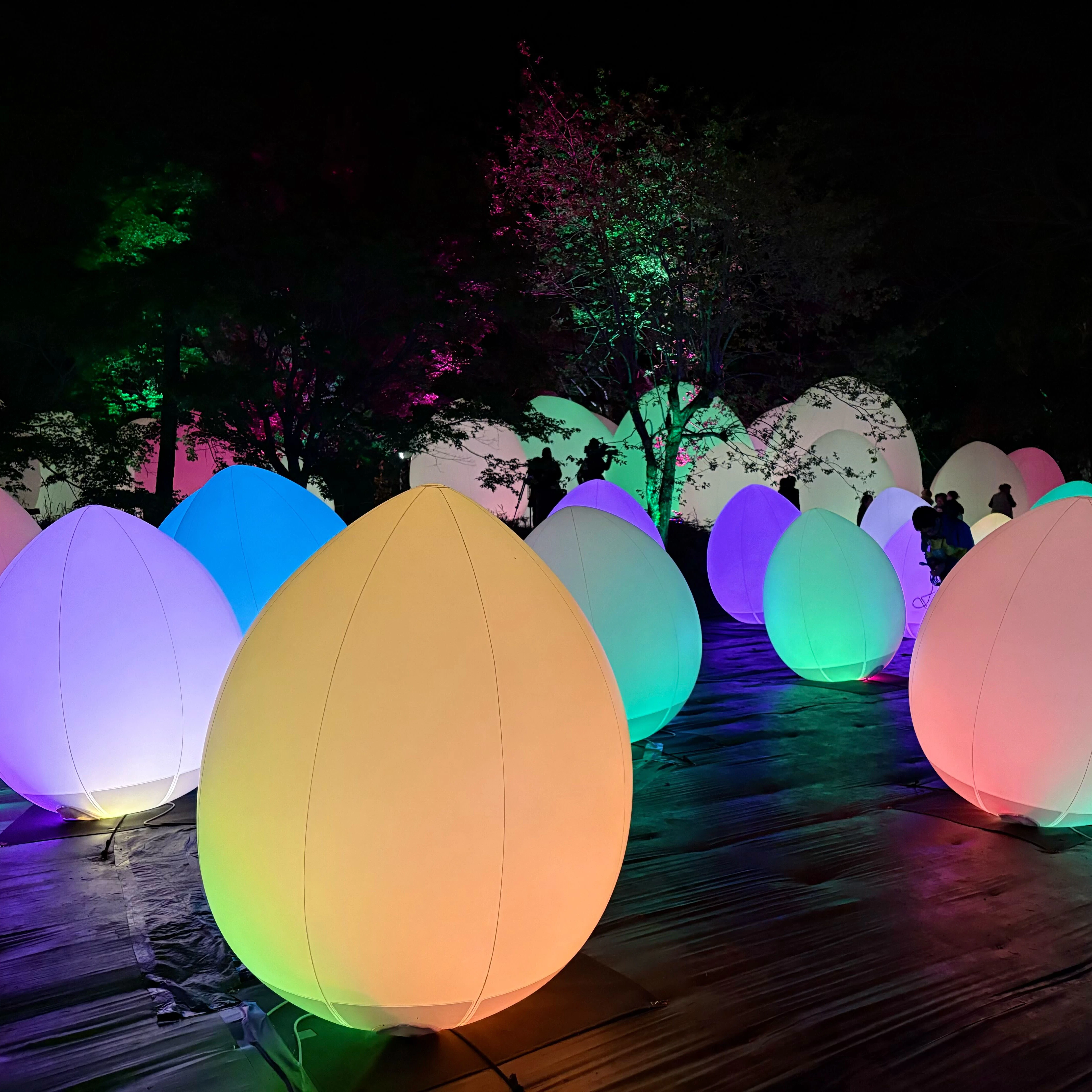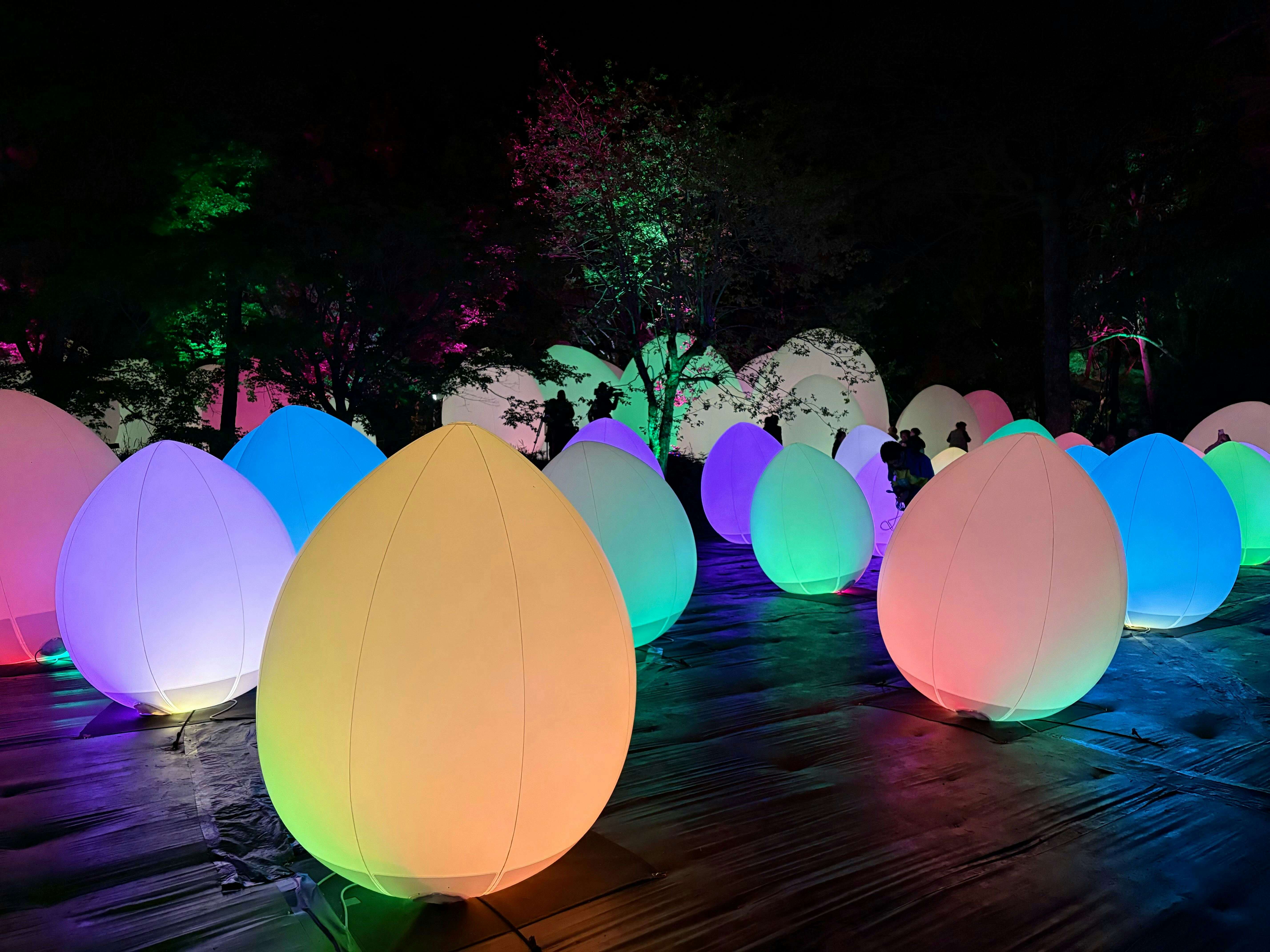 《呼応する養老渓谷と森》(2026)は、夜の森を光と音で構成した作品だ。人や生物が通るたびに、その色や音が変化する仕組みになっている。チームラボは自然の造形をそのまま作品として扱うため、自然物に直接手を加えることはせず、光と音を用いてその知覚を変化させていく。他者の動きに反応して空間が変化する本作では、他者とその場を共有しながらともに作品をつくり上げる感覚をもたらす。