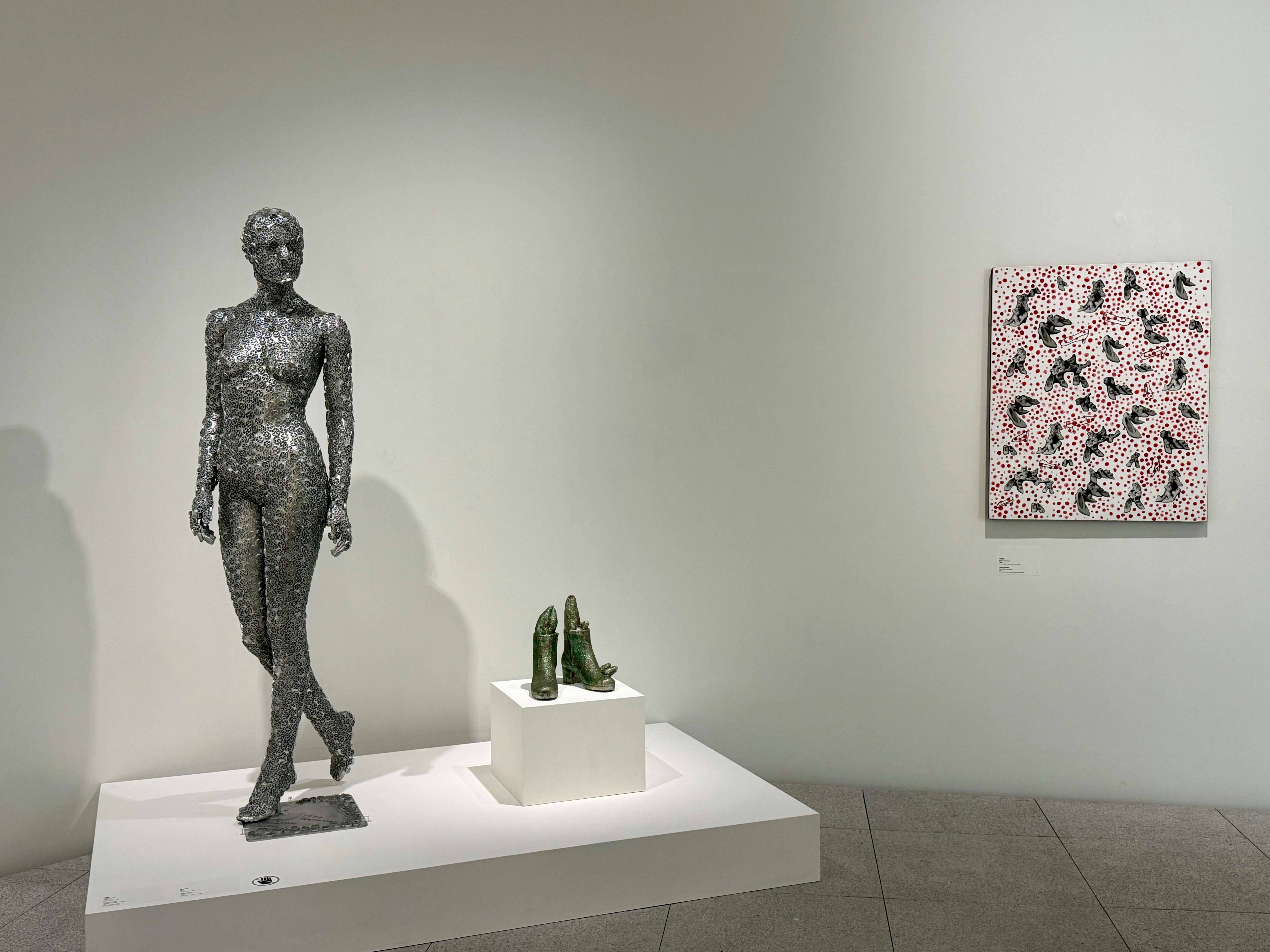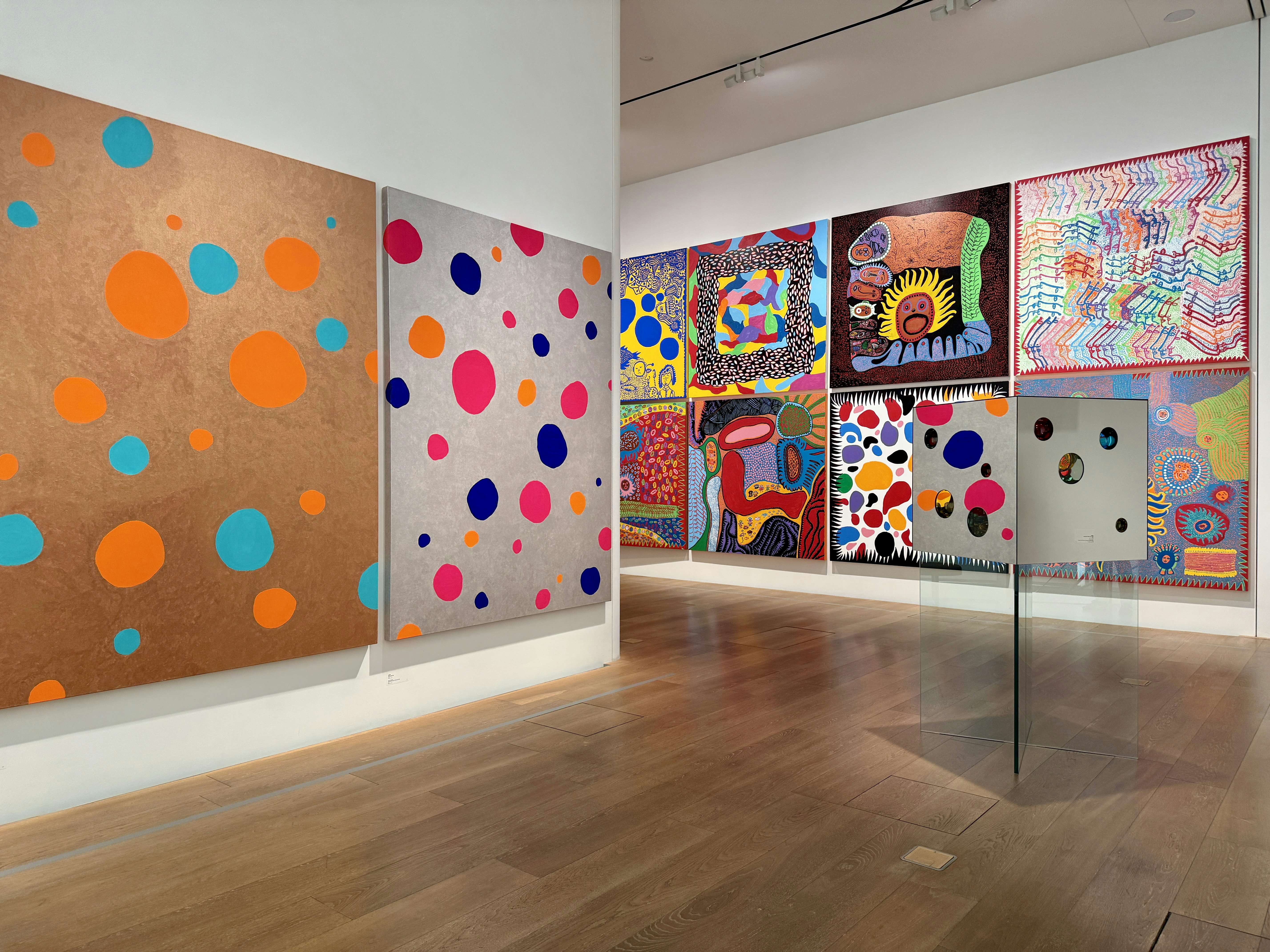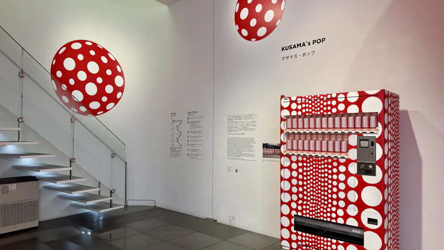 展示は複数のセクションで構成される。1階エントランスでは、水玉模様のバルーンによるインスタレーション《水玉強迫》(1996/2026)と、日本コカ・コーラとの広告プロジェクトで制作された自動販売機が来場者を迎える。水玉の反復と増殖は、草間の作品におけるもっとも象徴的な要素であり、空間全体へと拡張されることで、没入的な体験を強調する。