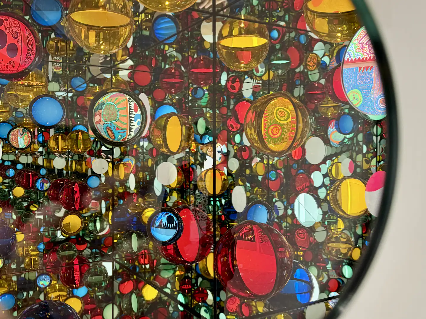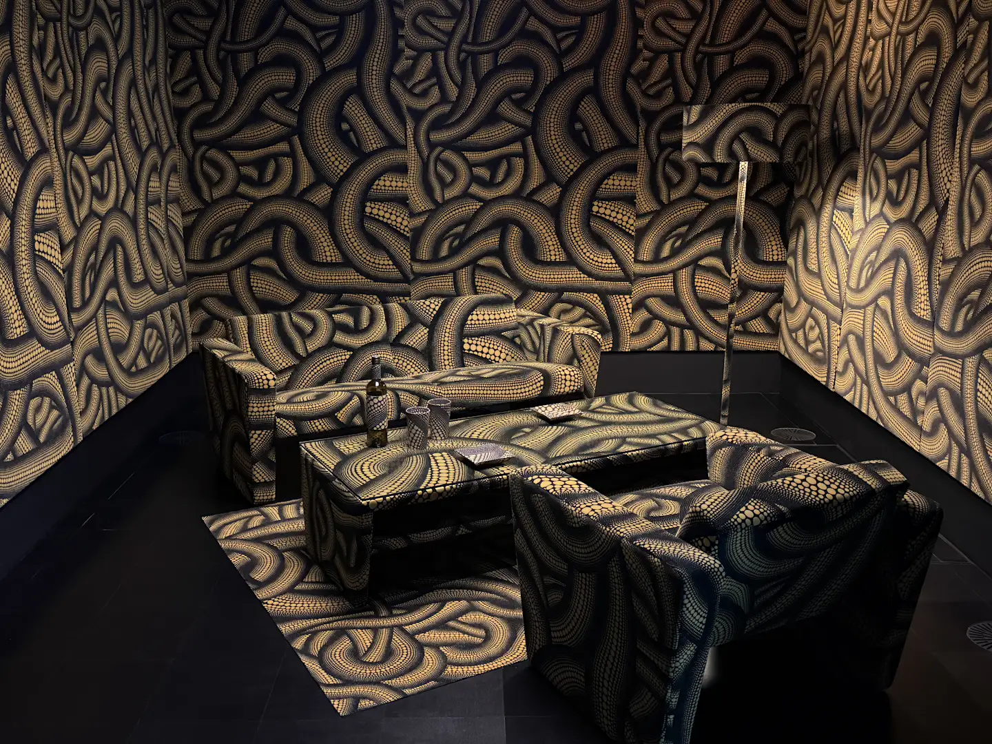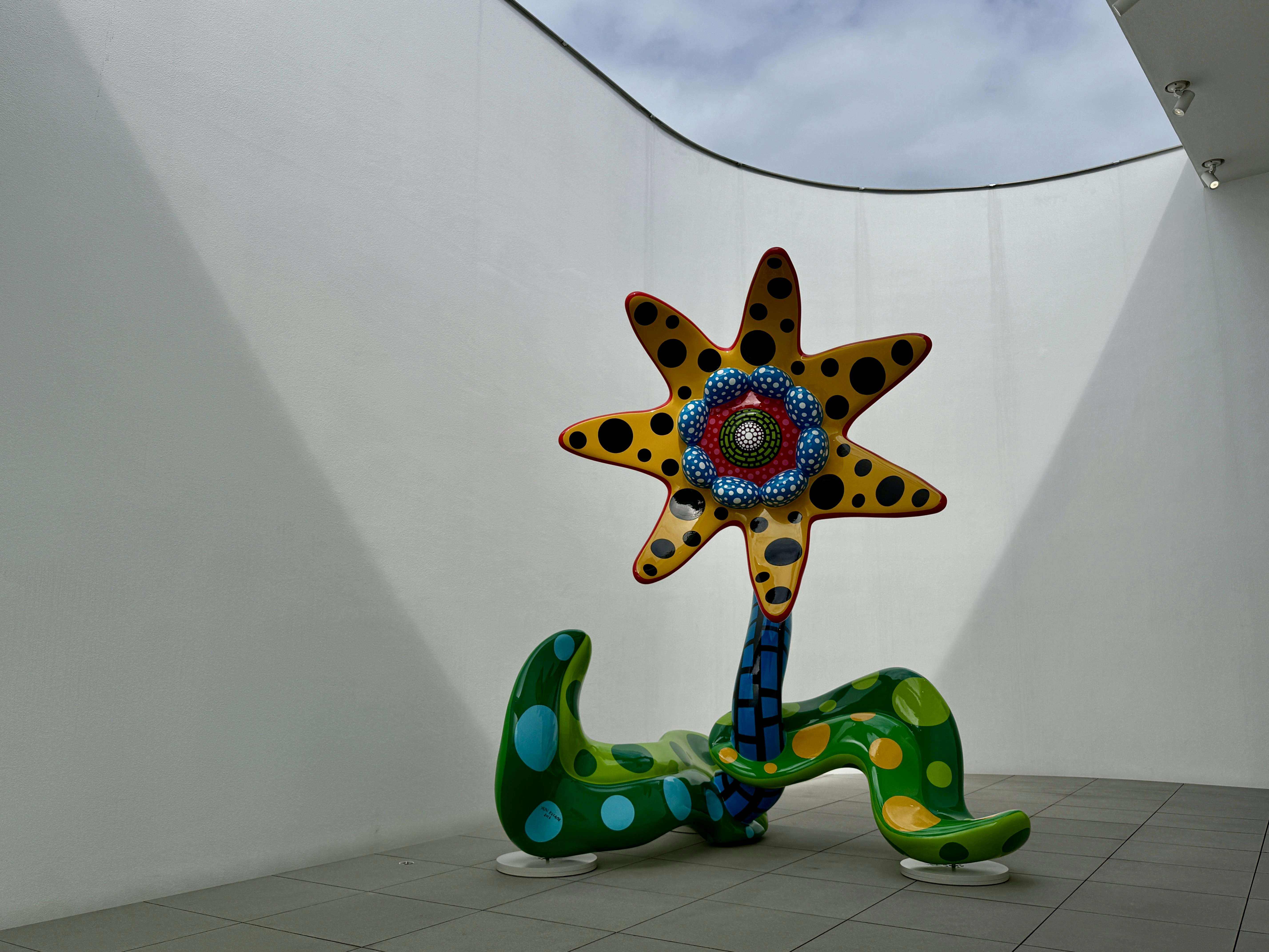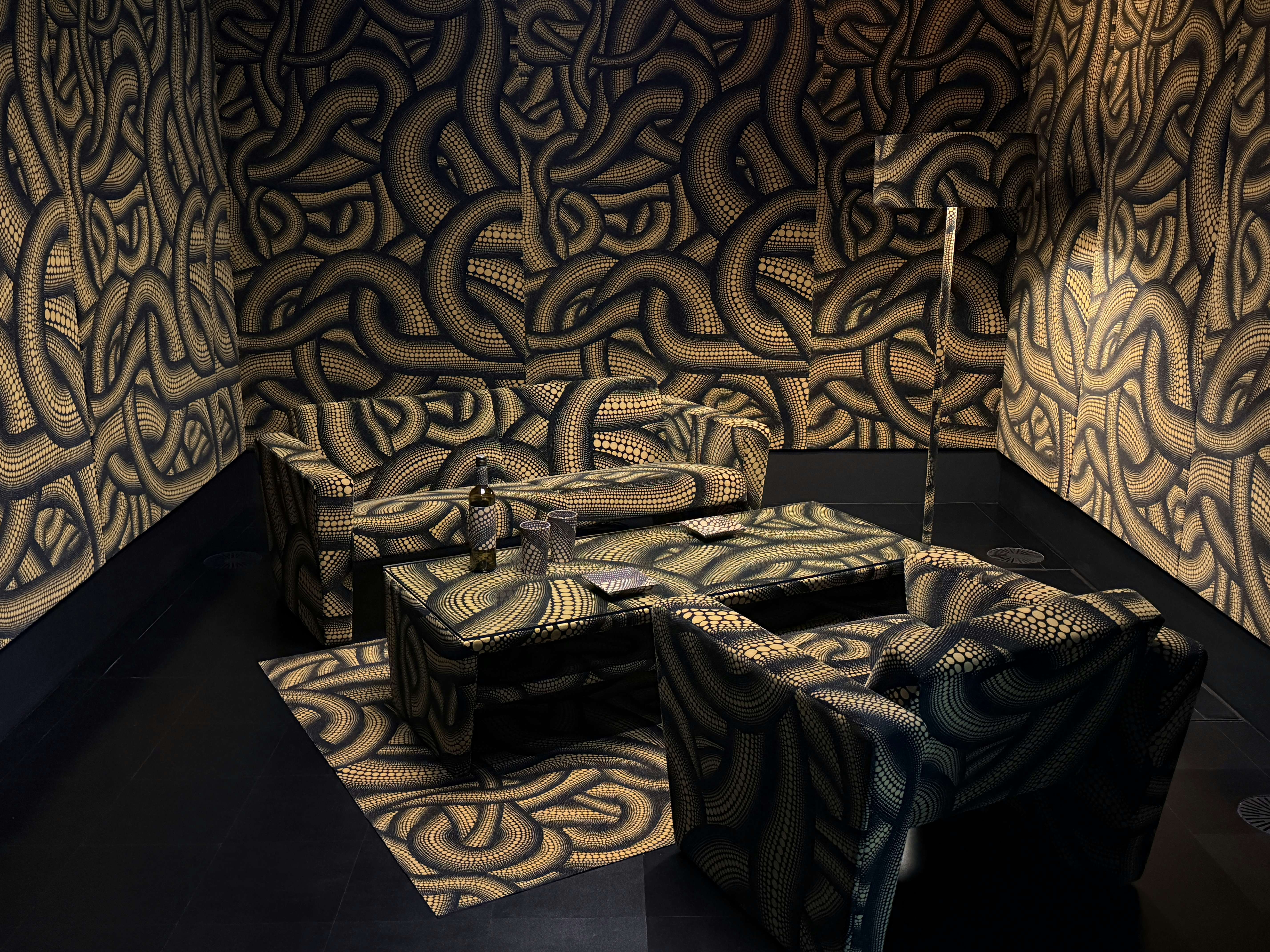 展示は複数のセクションで構成される。1階エントランスでは、水玉模様のバルーンによるインスタレーション《水玉強迫》(1996/2026)と、日本コカ・コーラとの広告プロジェクトで制作された自動販売機が来場者を迎える。水玉の反復と増殖は、草間の作品におけるもっとも象徴的な要素であり、空間全体へと拡張されることで、没入的な体験を強調する。