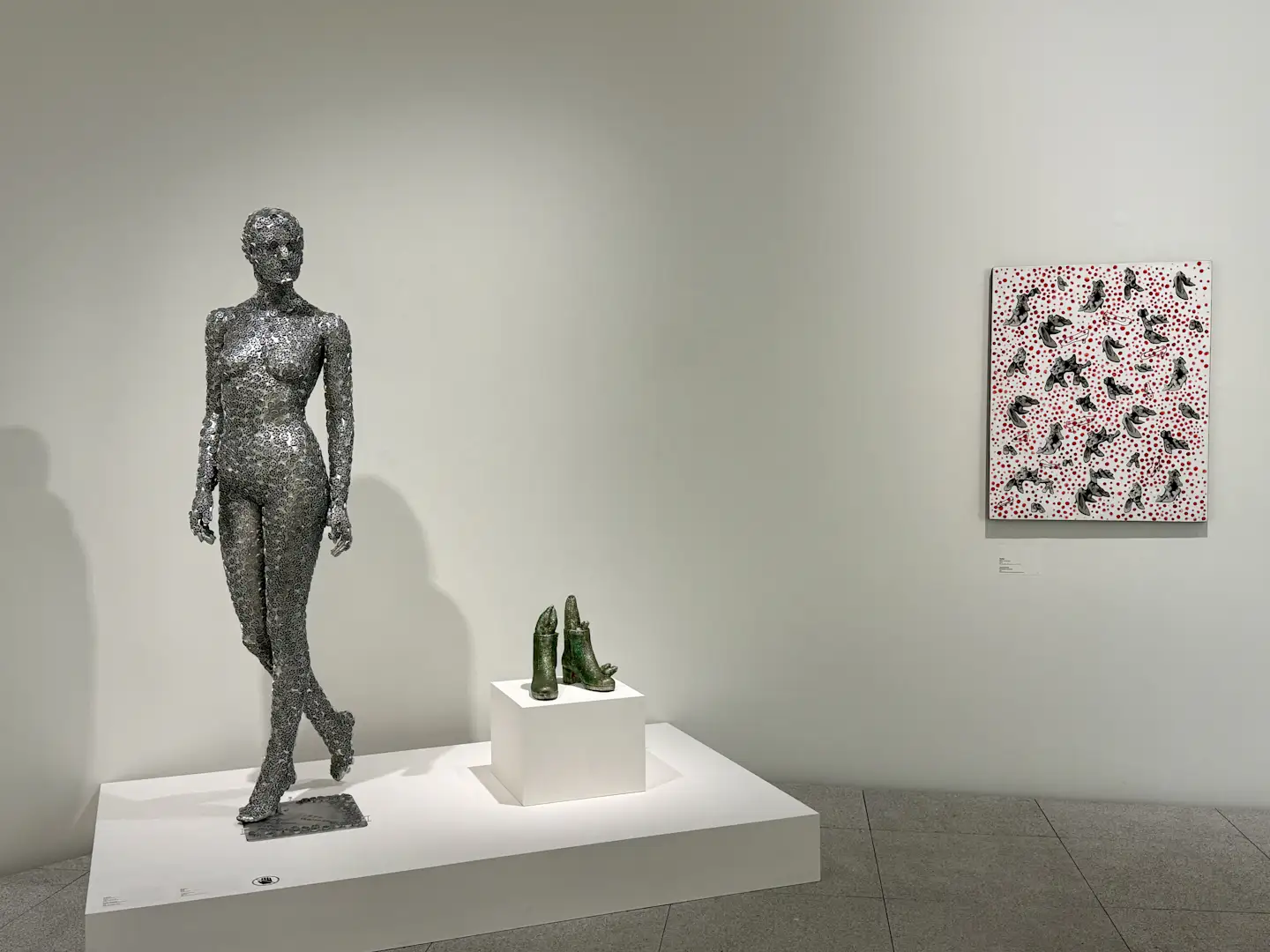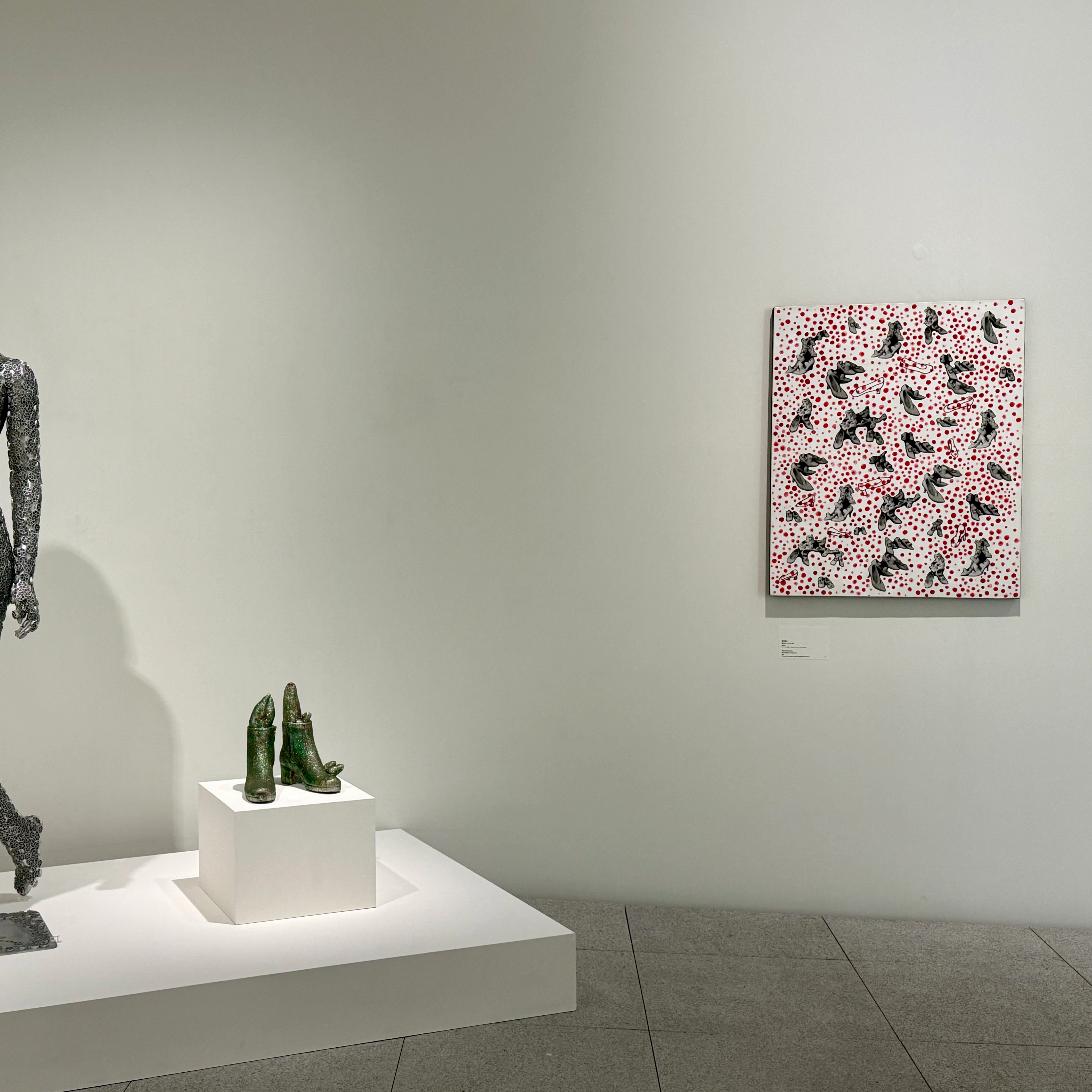 2階では、1960年代のコラージュ作品や、その当時に生まれた表現を用いた立体作品などが紹介されている。《エアメール・ステッカー》(1962/1992)は、郵便用ステッカーを画面全体に貼り巡らせた作品であり、大量消費社会におけるイメージの氾濫を想起させる。いっぽう、《マカロニィガール》(1999)では、マネキンにパスタを貼り付けるという手法を通じて、日常的な物質と作家の内的オブセッションが結びつく様相が示される。こうした反復的な行為は、当時のポップ・アートと形式的な共通点を持ちながらも、その出発点において本質的に異なる。