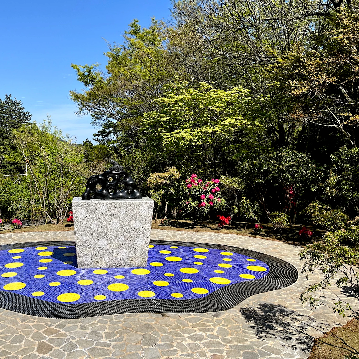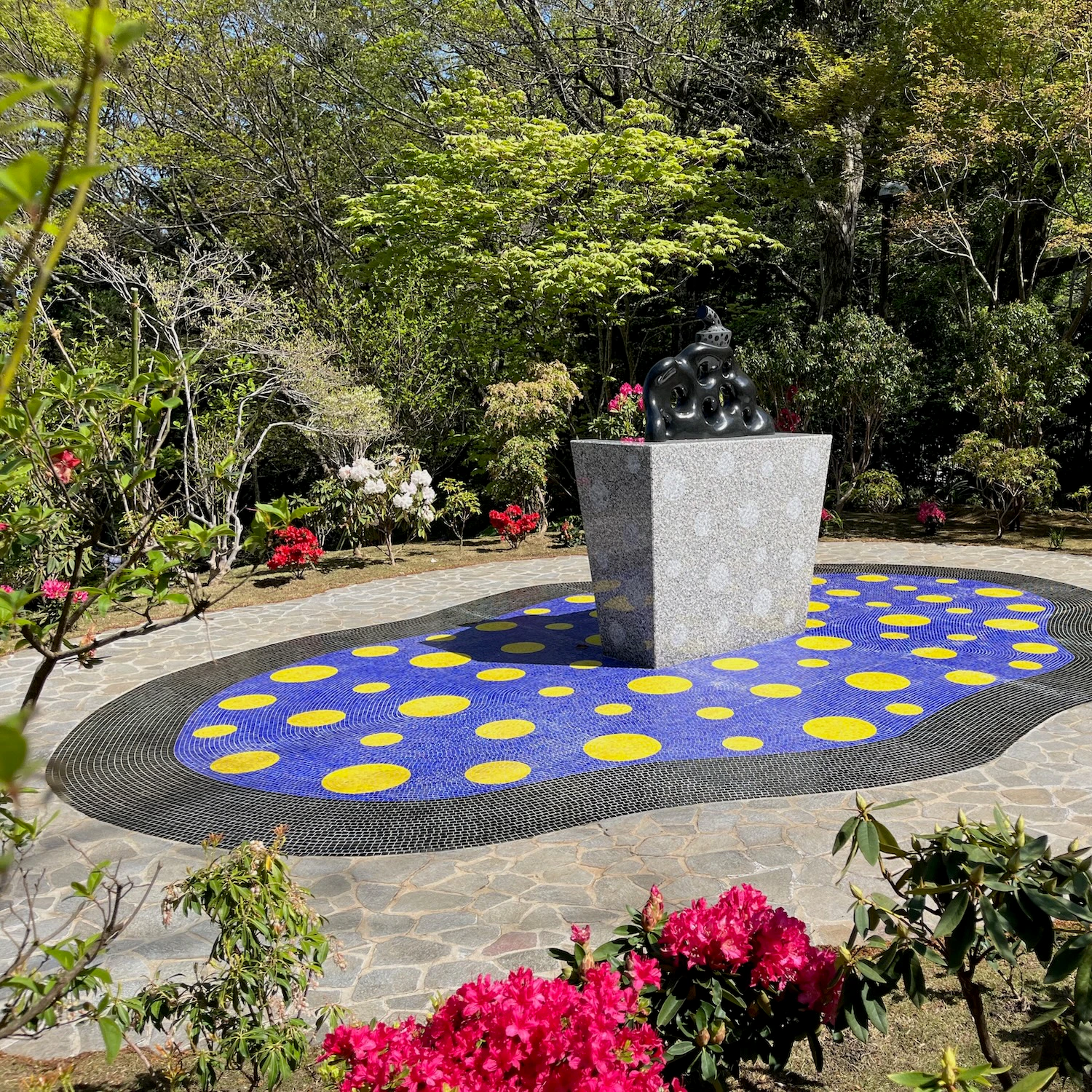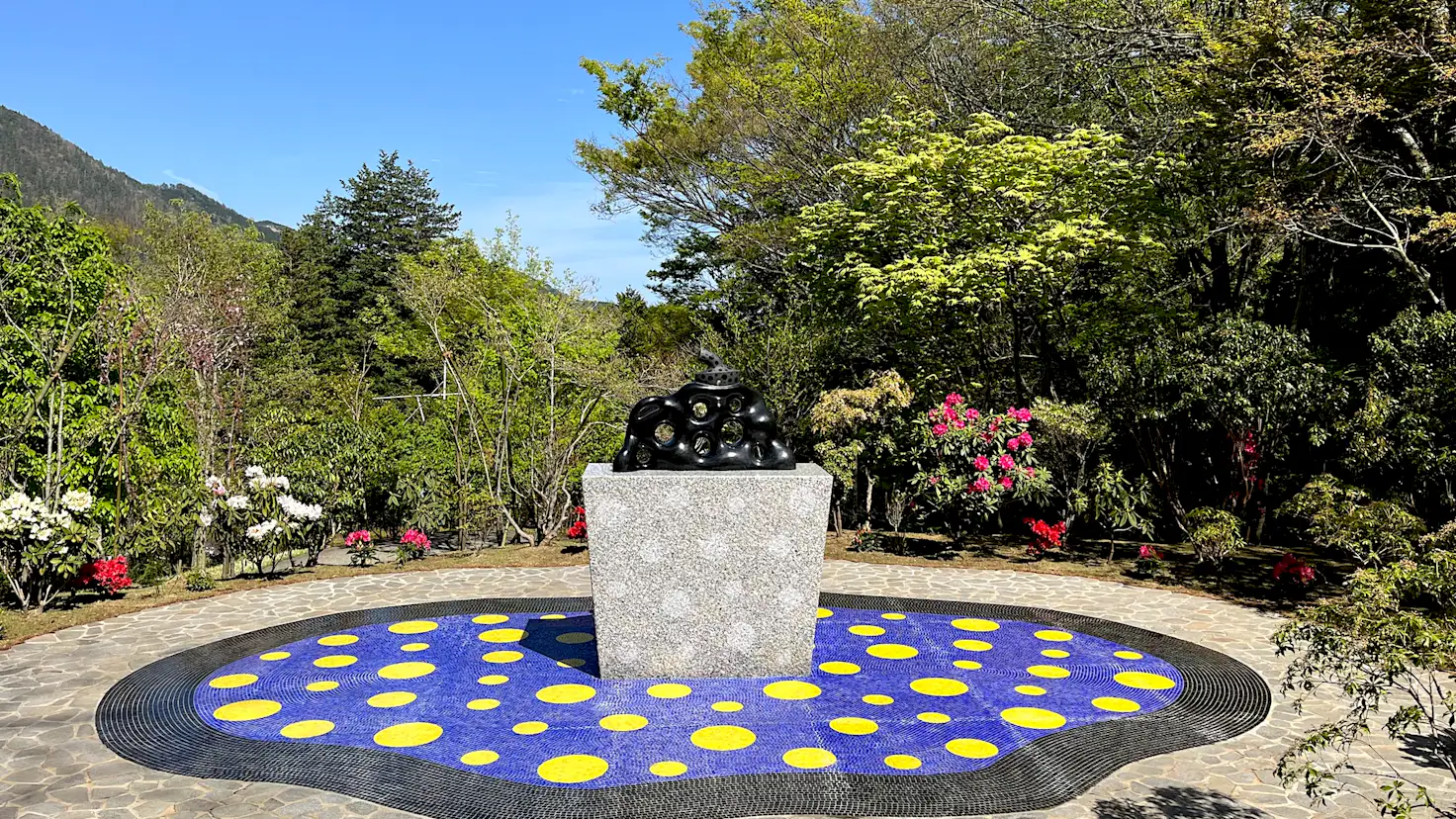 《われは南瓜》は「丸の内ストリートギャラリー」で2025年まで展示されていたもの。展示場所は彫刻の森美術館の奥にある「The Haknoe Open-Air Museum Café」の隣で、作品の周囲には新たにカラフルなモザイクタイルを敷設。石本来の自然な形状を活かしながら車いすなどに配慮した、360度から作品を鑑賞できる空間が完成した。