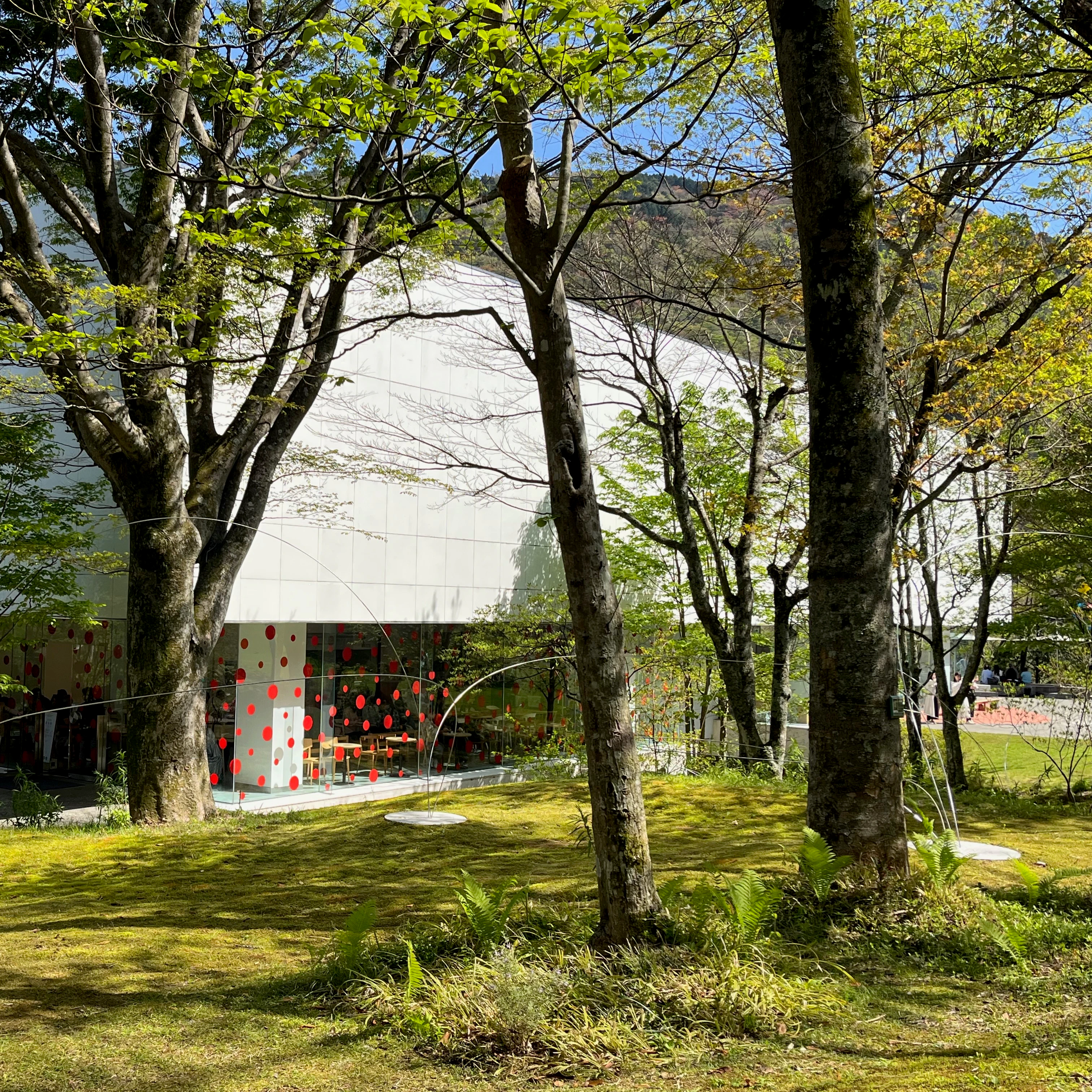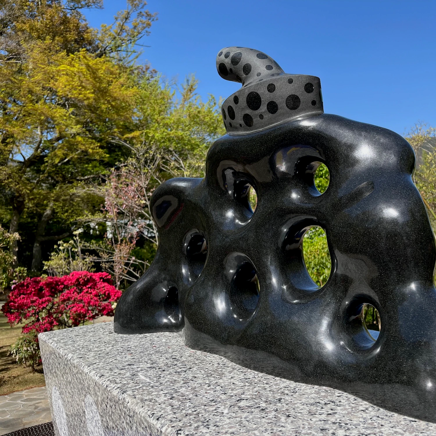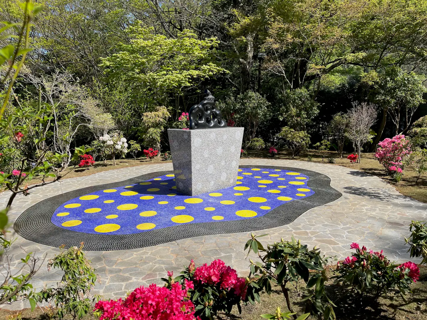 《われは南瓜》は「丸の内ストリートギャラリー」で2025年まで展示されていたもの。展示場所は彫刻の森美術館の奥にある「The Haknoe Open-Air Museum Café」の隣で、作品の周囲には新たにカラフルなモザイクタイルを敷設。石本来の自然な形状を活かしながら車いすなどに配慮した、360度から作品を鑑賞できる空間が完成した。
