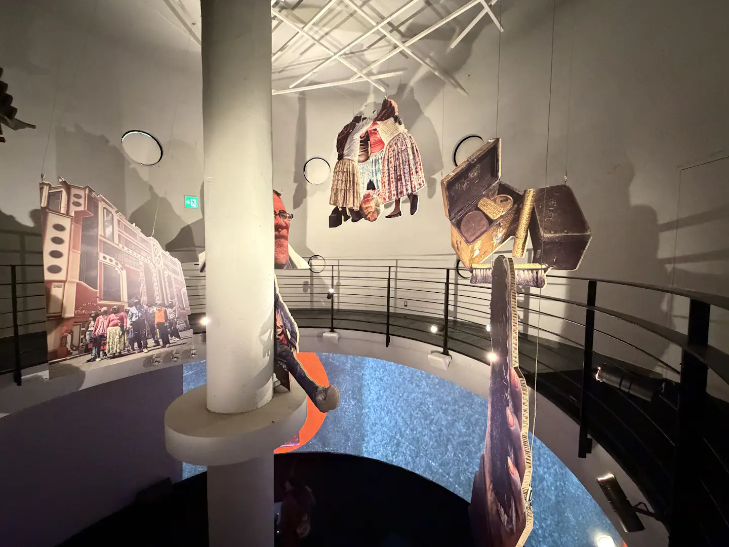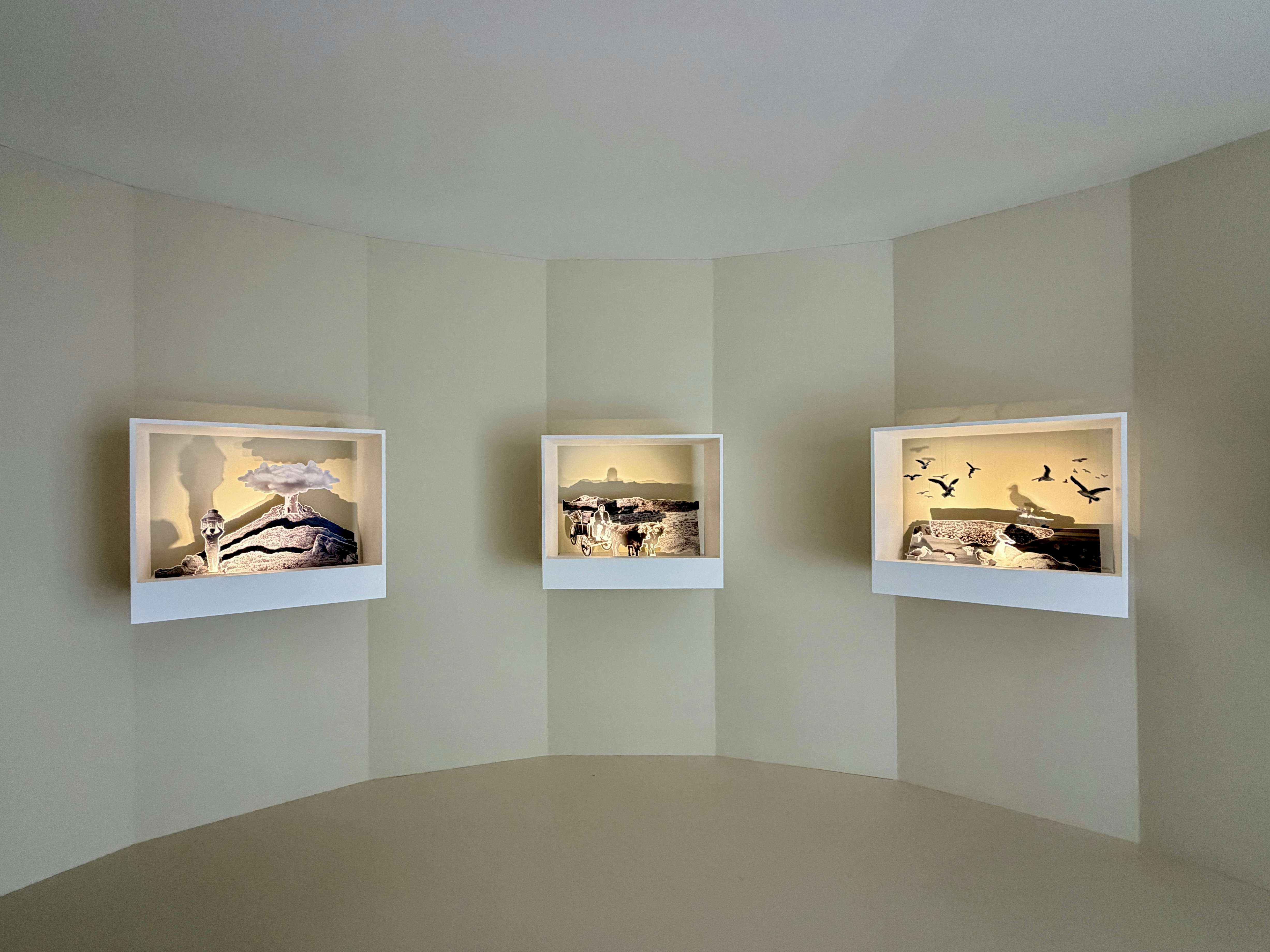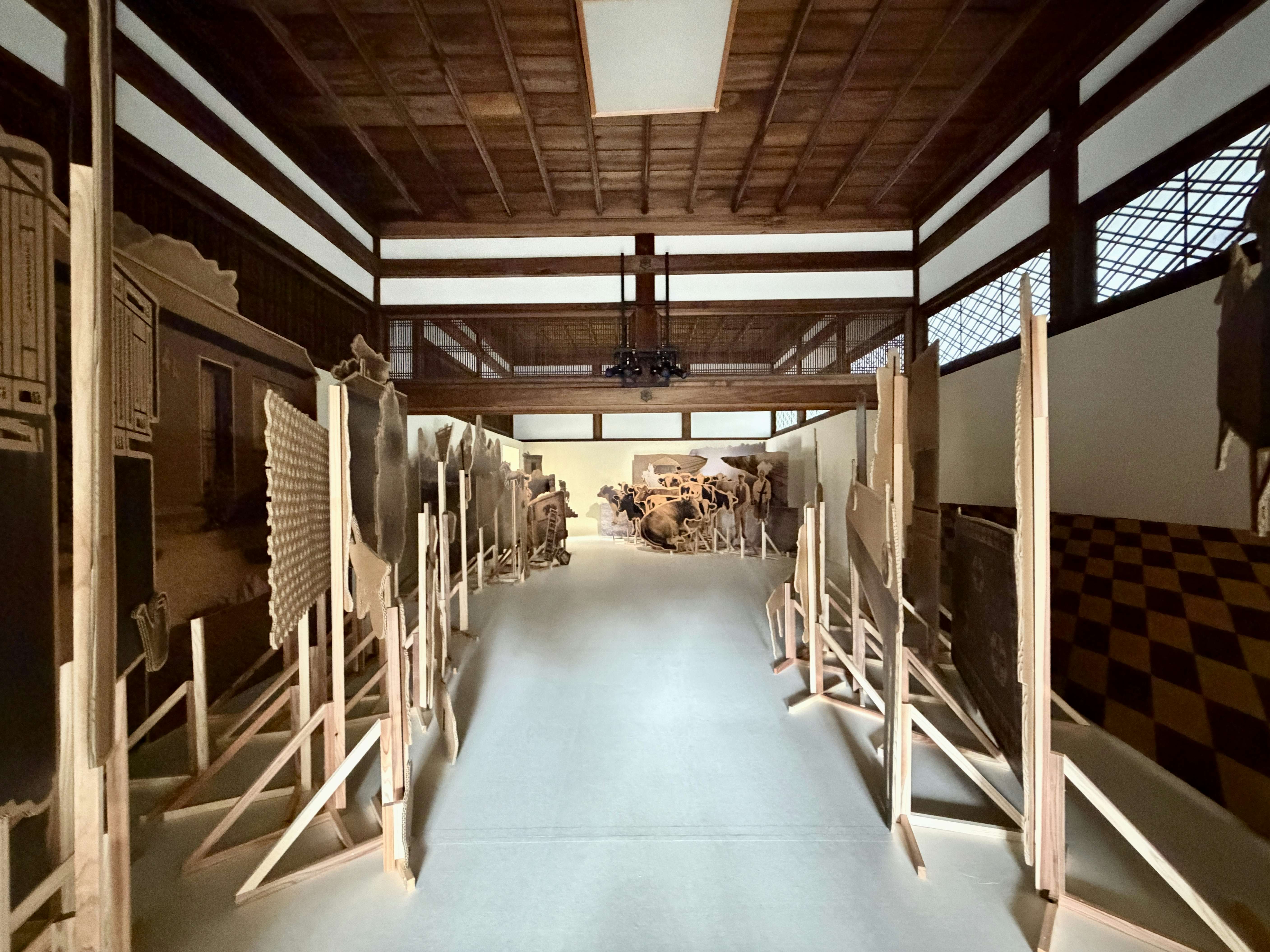 東本願寺の大玄関では、ハンイェにとって日本初の大規模個展となる「記憶のリハーサル」が展開される。展示は「Mosebetsi wa Dirithi」など4つのシリーズで構成。写真、シルエットのカットアウト、ライトボックスを用いたジオラマ、布のパッチワークなど多様なメディウムで展開される作品には、南アフリカ共和国の歴史、亡き母の記憶、そしてポストコロニアルの現実が重層的に絡み合う。
