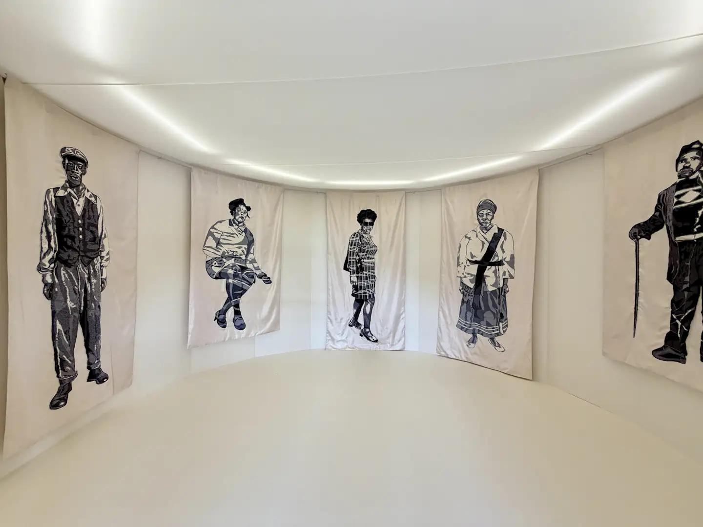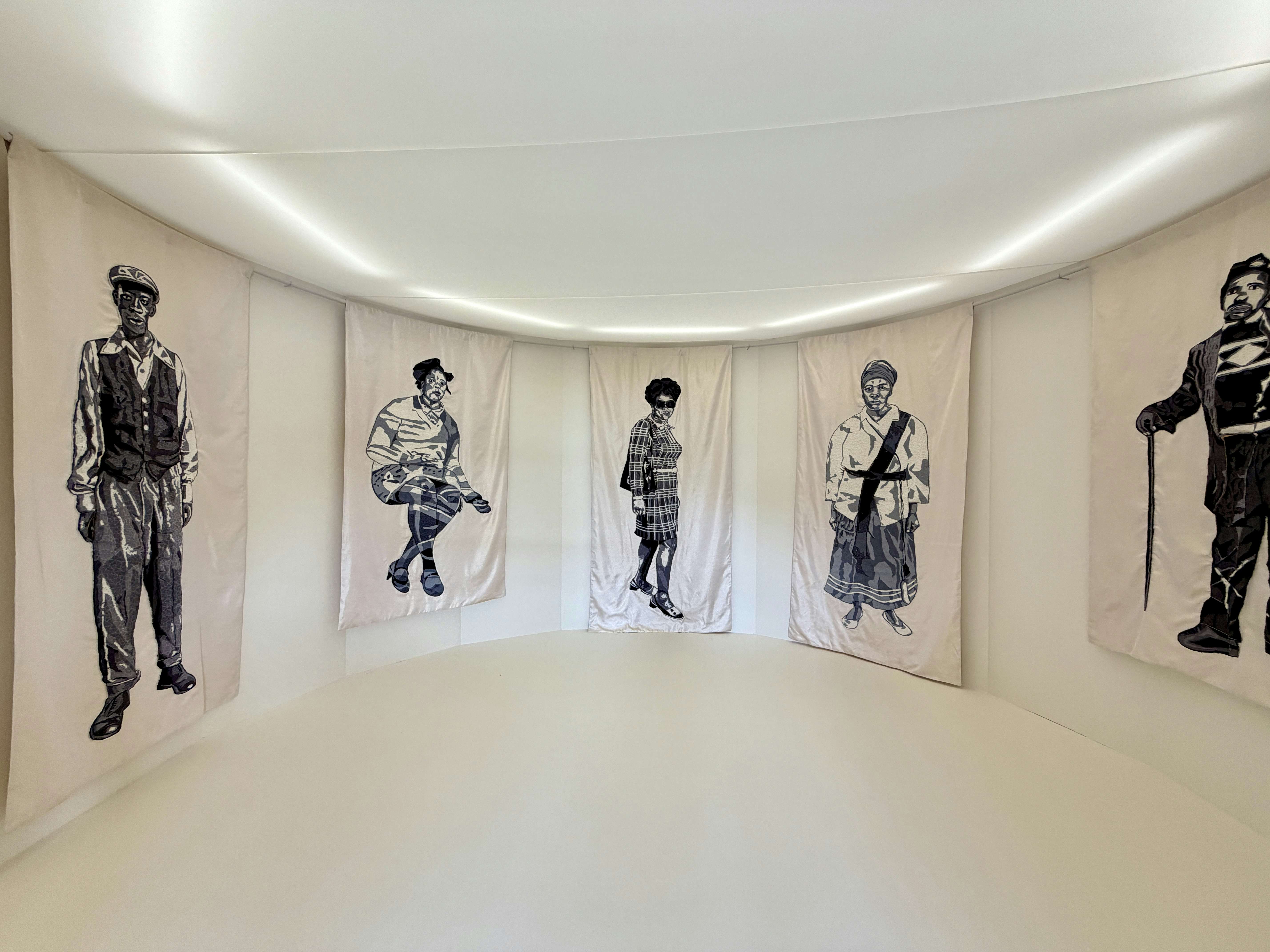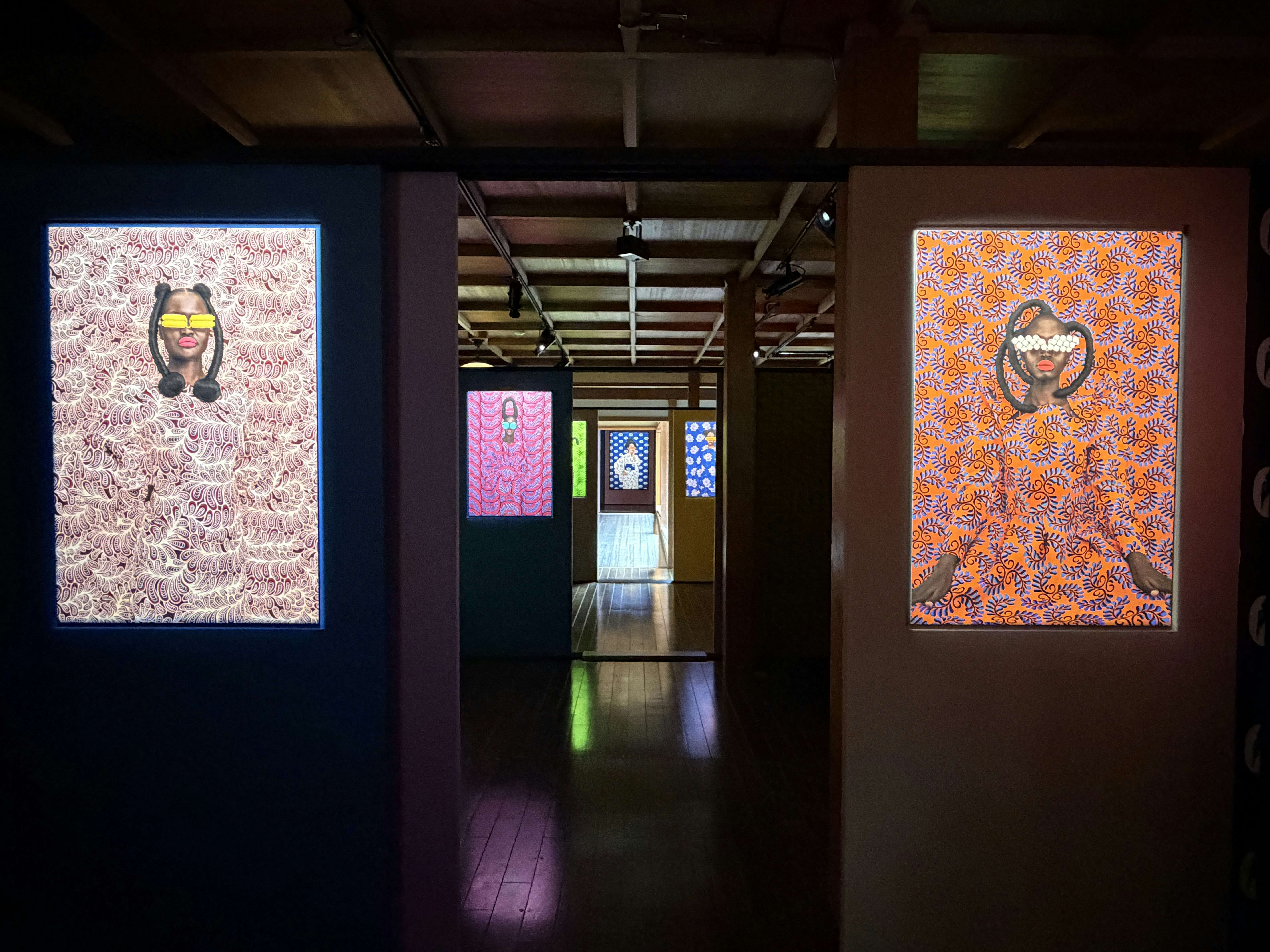 西アフリカで幅広く使用される鮮やかな布「アンカラ」や、東アフリカの「カンガ布」といったテキスタイルの物語から着想を得て、それらの布をキャンバスとして再定義し、称え、記憶するために作品に用いムリウ。今回、KYOTOGRAPHIEのアフリカン・アーティスト・イン・レジデンスとして招聘され、2会場で作品を展示する。