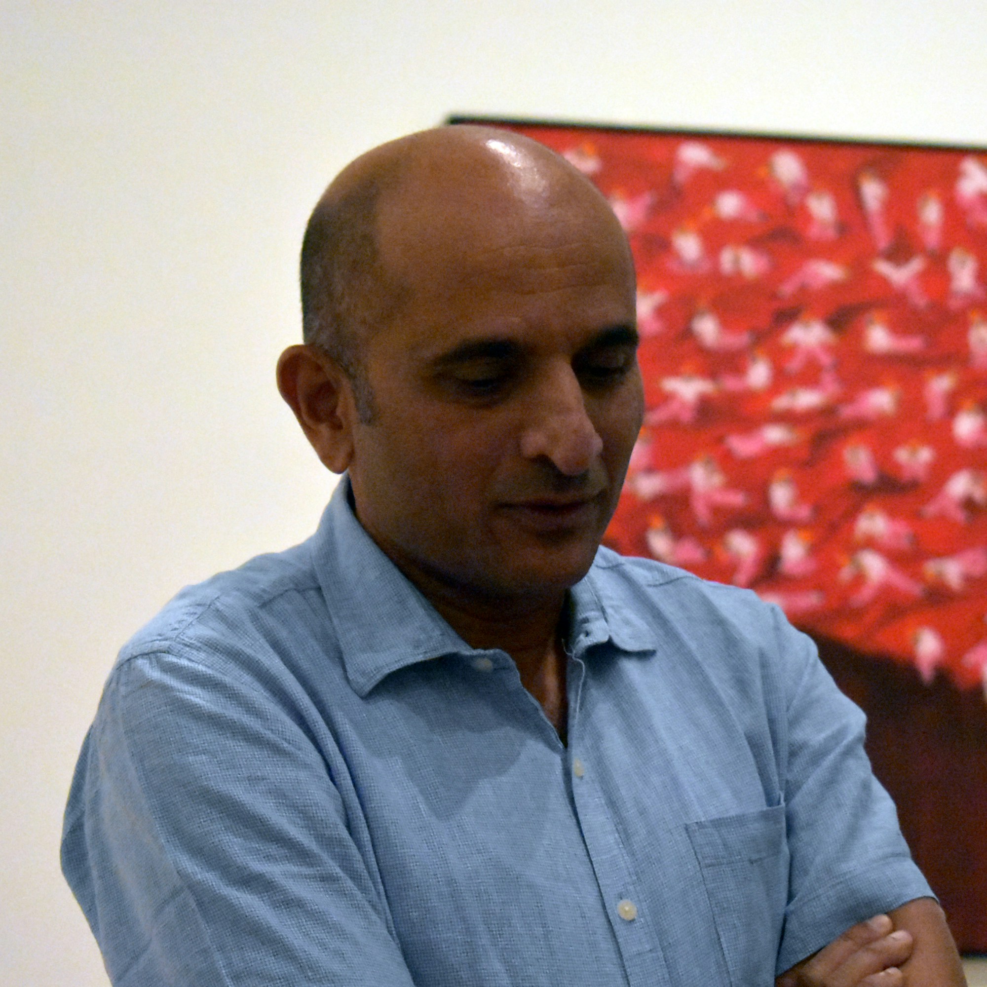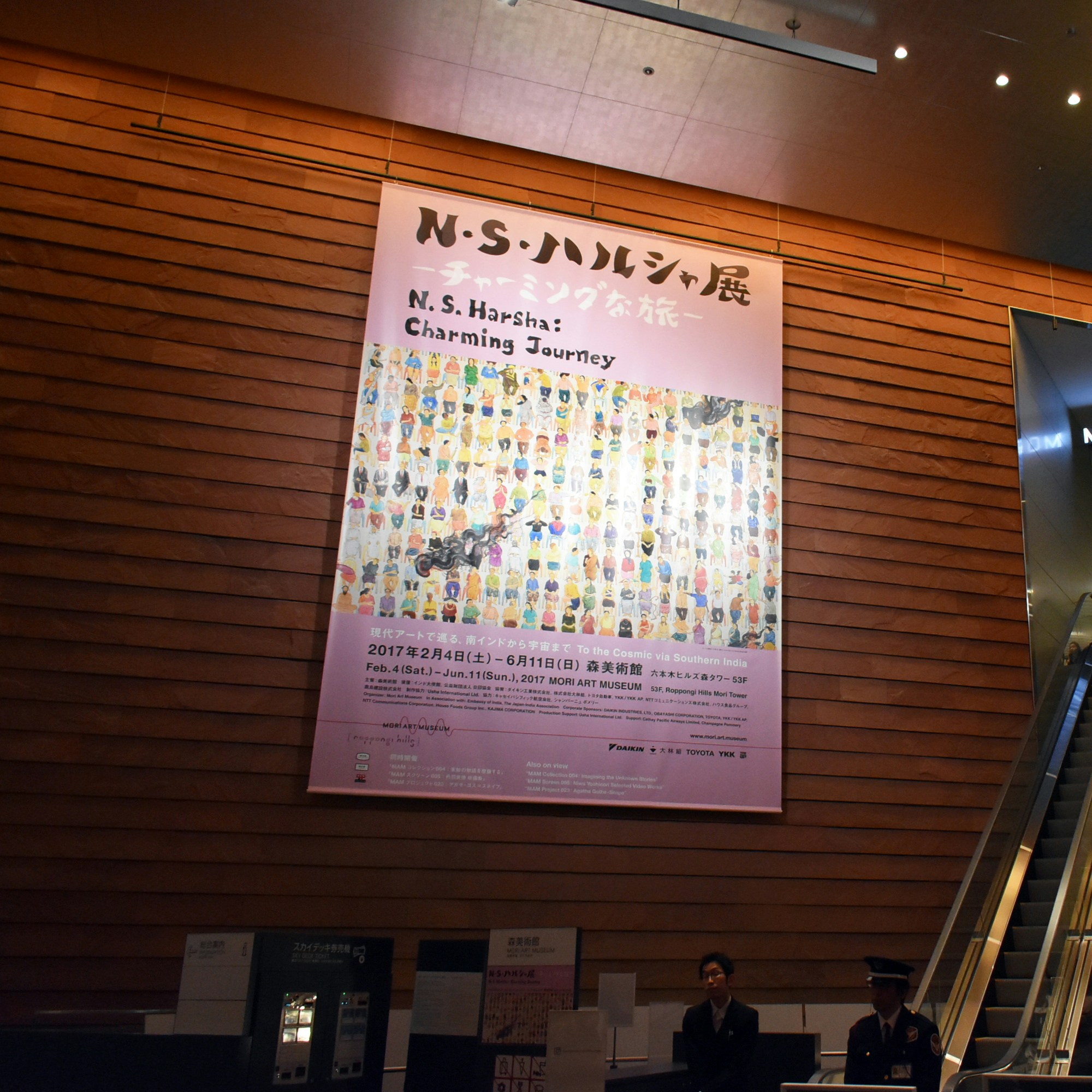 南條史生館長とN・S・ハルシャ本人も姿を見せた当日。SNSを使わないハルシャは、自身の個展が「#empty」の舞台となり、自分の作品がSNSでシェアされることに関して、次のように語る。「自分の作品は完成してしまえばもう私のものではなくなるので、それは絵画の冒険のようなものとして見守っています。子供の頃、自転車に乗ったビラ配りのおじさんの後を追いかけて、ばらまかれたチラシを拾っては、その内容を友達や家族に口伝えしていたことを思い出しました。紙からネットへ、情報の拡散の形式が違うだけで、当時もいまも変わらない。そこがつくづく興味深いと思っています」。